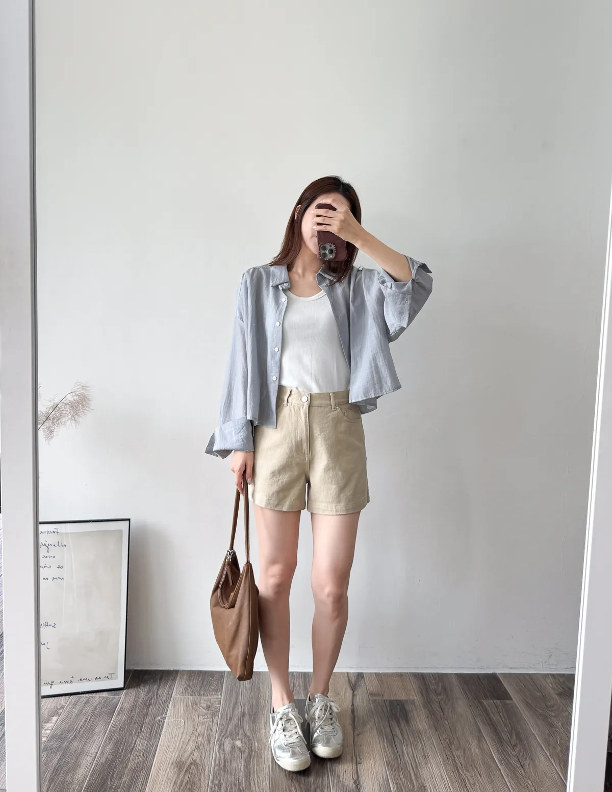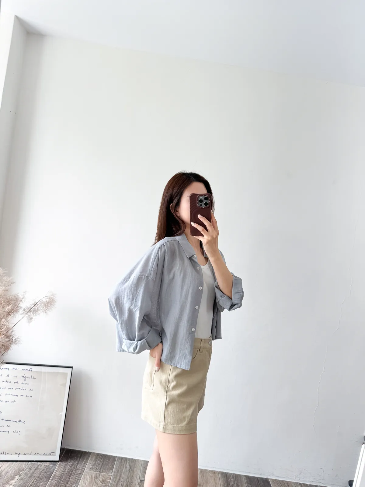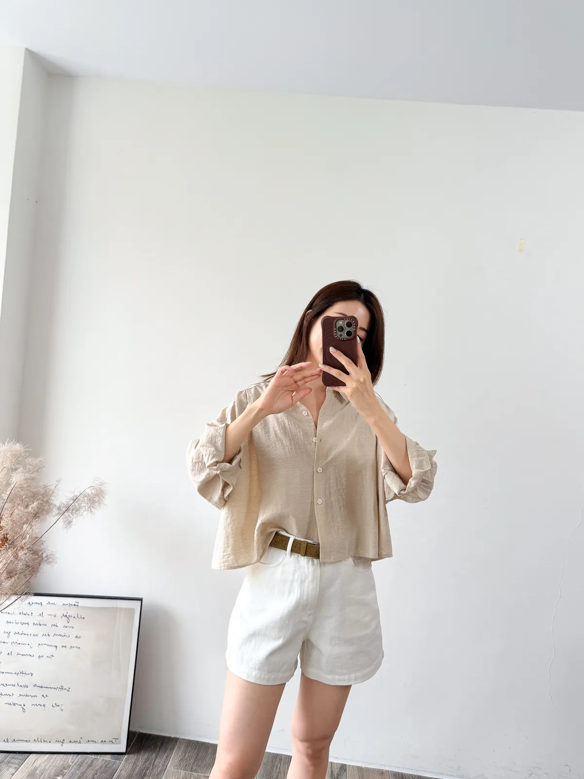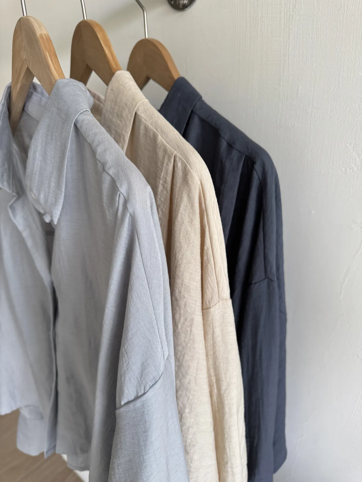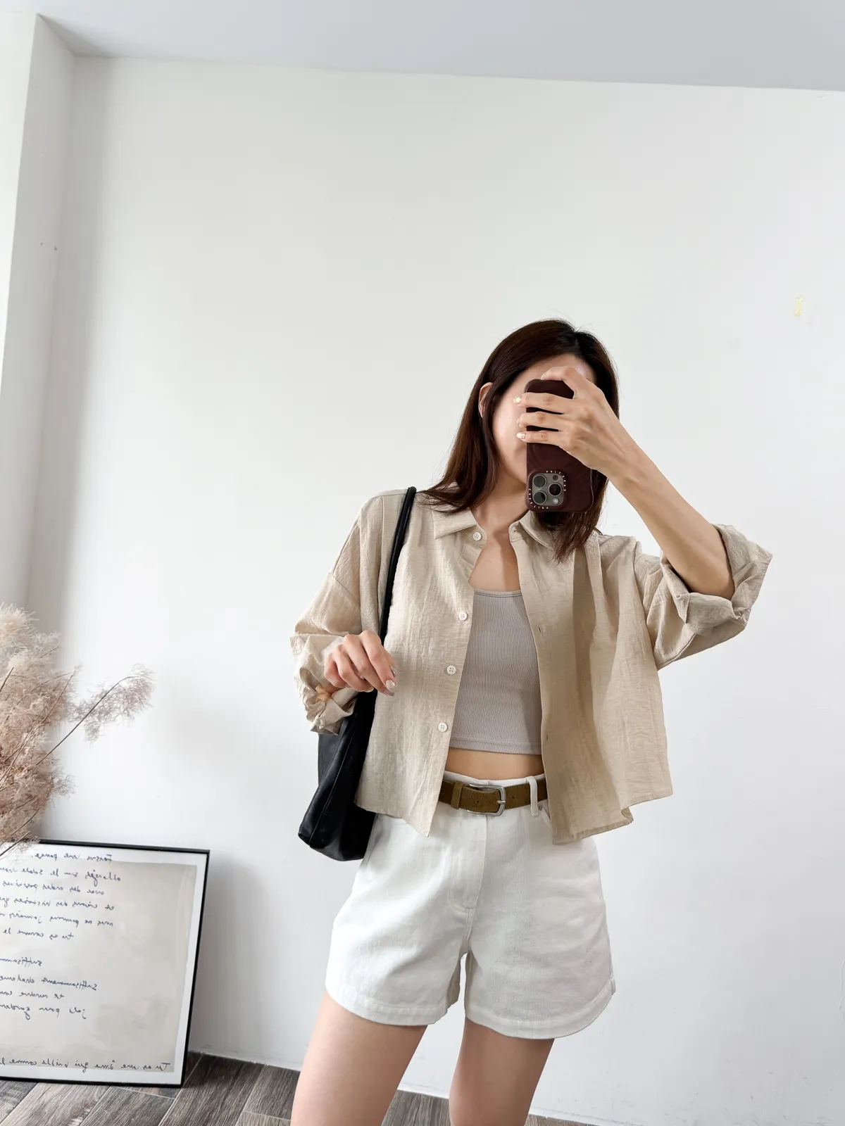 今年短版襯衫真的好難找~ 還好這季有準備兩款短襯衫給大家(也給自己XD) 大家對這款版型有熟悉嗎? 之前賣爆的打褶襯衫🧡🧡 實在太喜歡這版型 我都稱它神奇襯衫! 看著店面各種身形都駕馭的很好,而且好評反饋也好多!太厲害 肩膀的打折讓整體版型看起來更挺一些 穿起來有精神,版型也很俐落! 這次選了混麻的透氣材質~ 細緻手感,直接碰在肌膚上也不會有粗感 顏色選了好久好久~ 最後特別和上一檔自訂襯衫錯開顏色 藍灰這色好漂亮~灰濛濛的很迷人 第一眼忍不住就會選它😆 深藍呢~單看會覺得還好! 但實穿上會很滿意,有顯白感 而且是很飽和的質感色調🤩 淺杏穿起來的溫柔知性感是完全不同風格 大家可以選擇一深一淺打包💕*made in china model 158/48 (腰26吋 臀35吋)