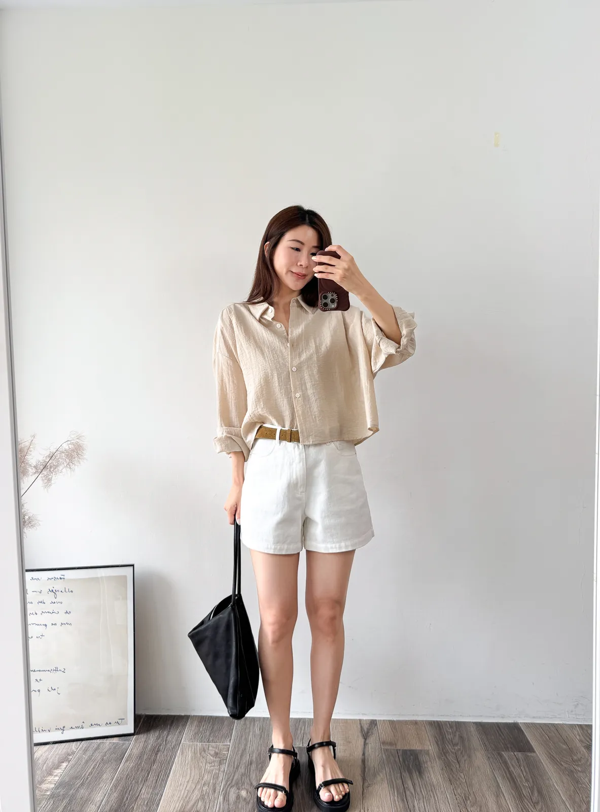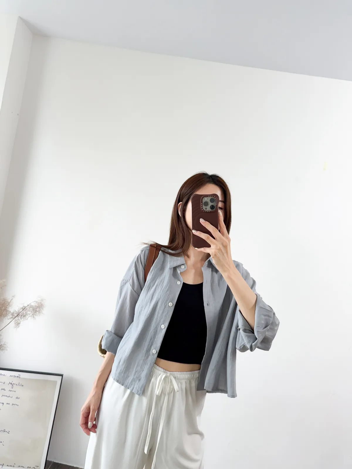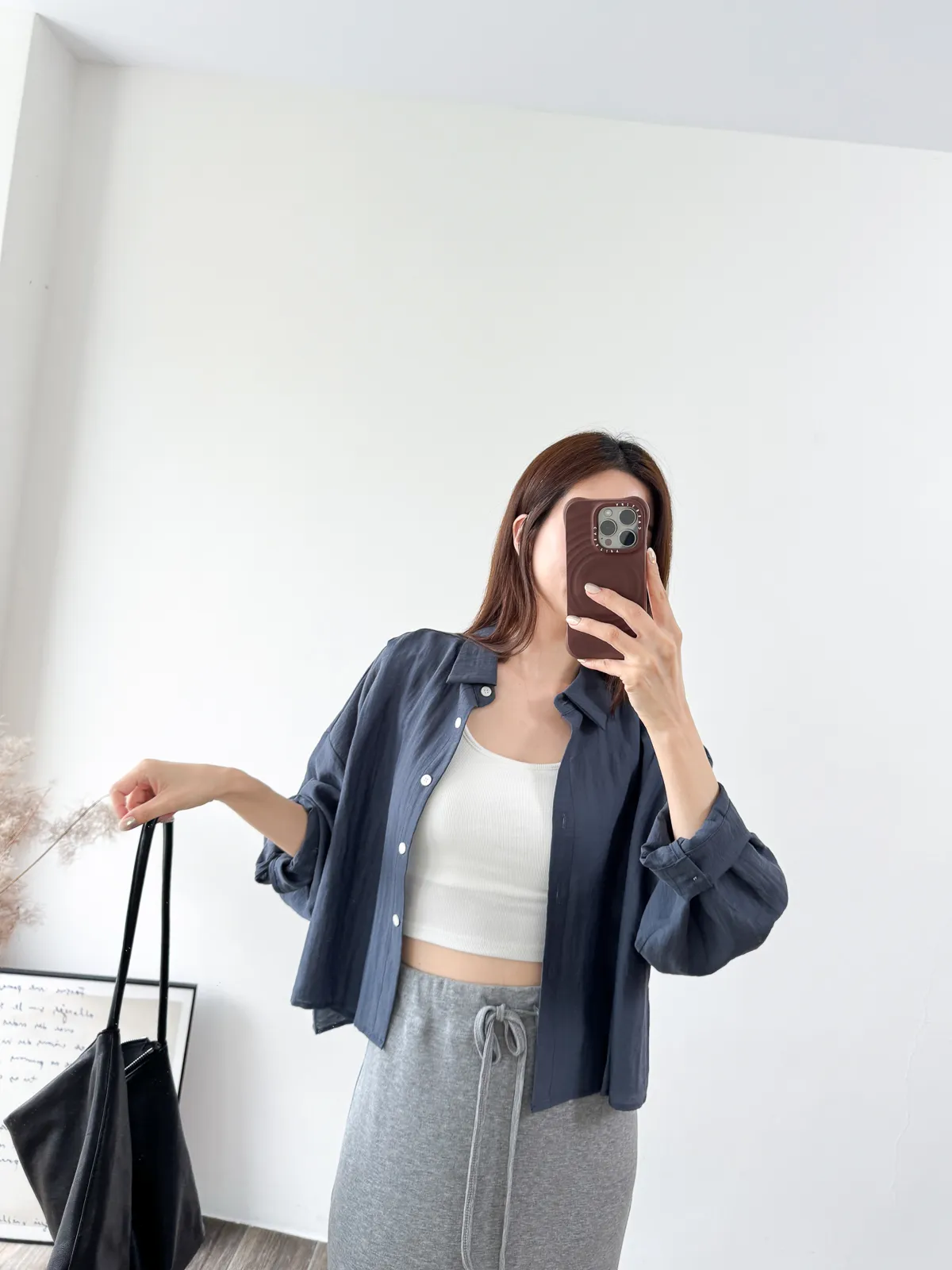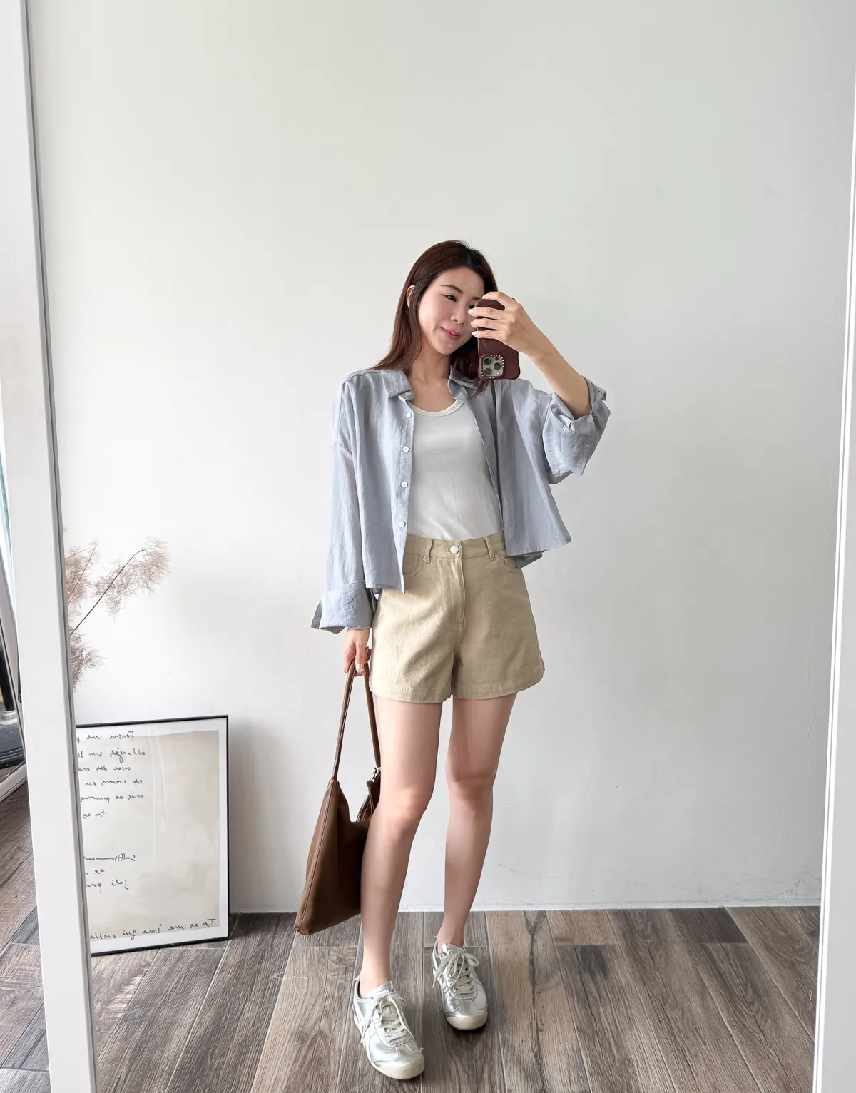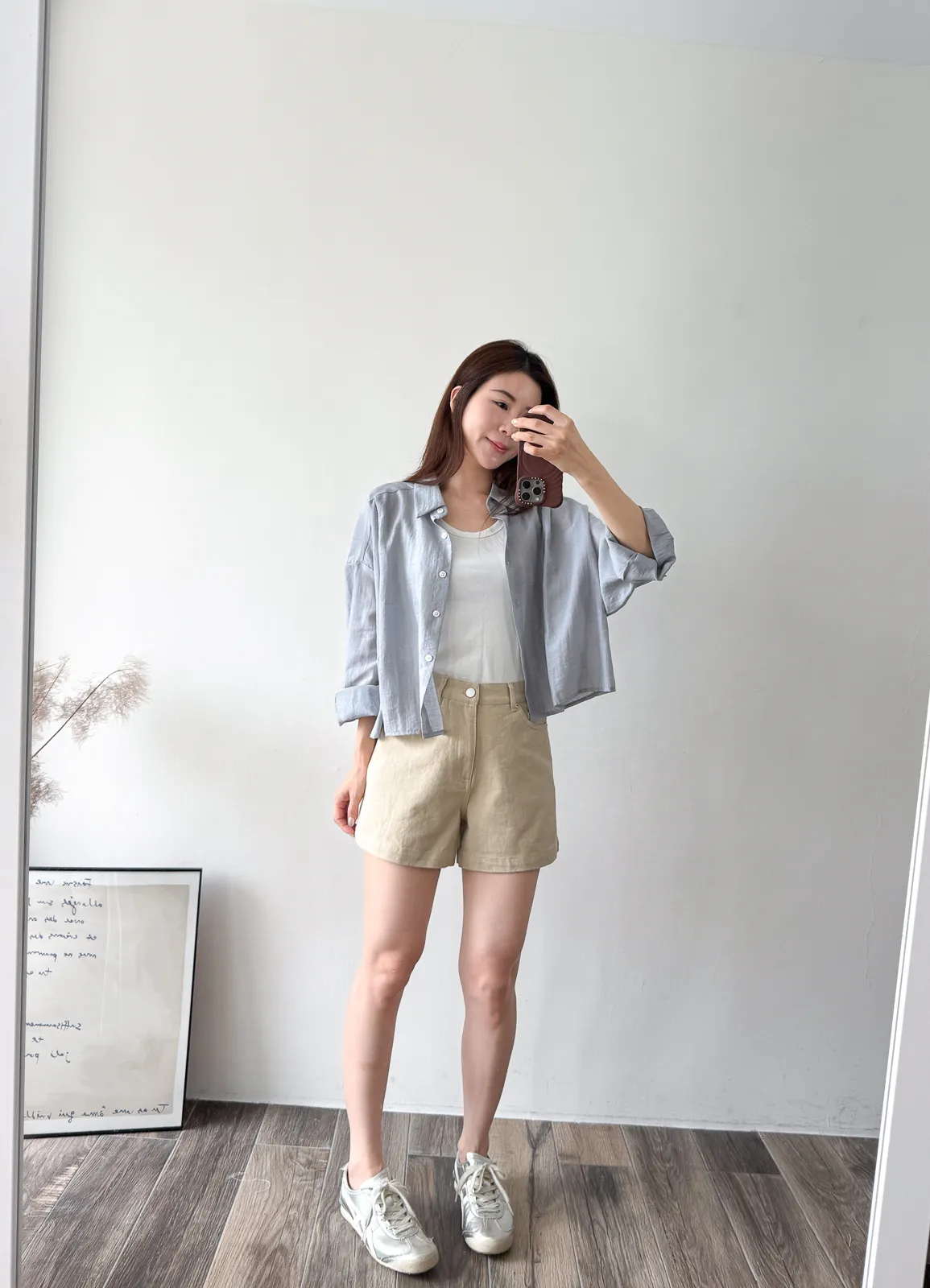 今年短版襯衫真的好難找~ 還好這季有準備兩款短襯衫給大家(也給自己XD) 大家對這款版型有熟悉嗎? 之前賣爆的打褶襯衫🧡🧡 實在太喜歡這版型 我都稱它神奇襯衫! 看著店面各種身形都駕馭的很好,而且好評反饋也好多!太厲害 肩膀的打折讓整體版型看起來更挺一些 穿起來有精神,版型也很俐落! 這次選了混麻的透氣材質~ 細緻手感,直接碰在肌膚上也不會有粗感 顏色選了好久好久~ 最後特別和上一檔自訂襯衫錯開顏色 藍灰這色好漂亮~灰濛濛的很迷人 第一眼忍不住就會選它😆 深藍呢~單看會覺得還好! 但實穿上會很滿意,有顯白感 而且是很飽和的質感色調🤩 淺杏穿起來的溫柔知性感是完全不同風格 大家可以選擇一深一淺打包💕*made in china model 158/48 (腰26吋 臀35吋)