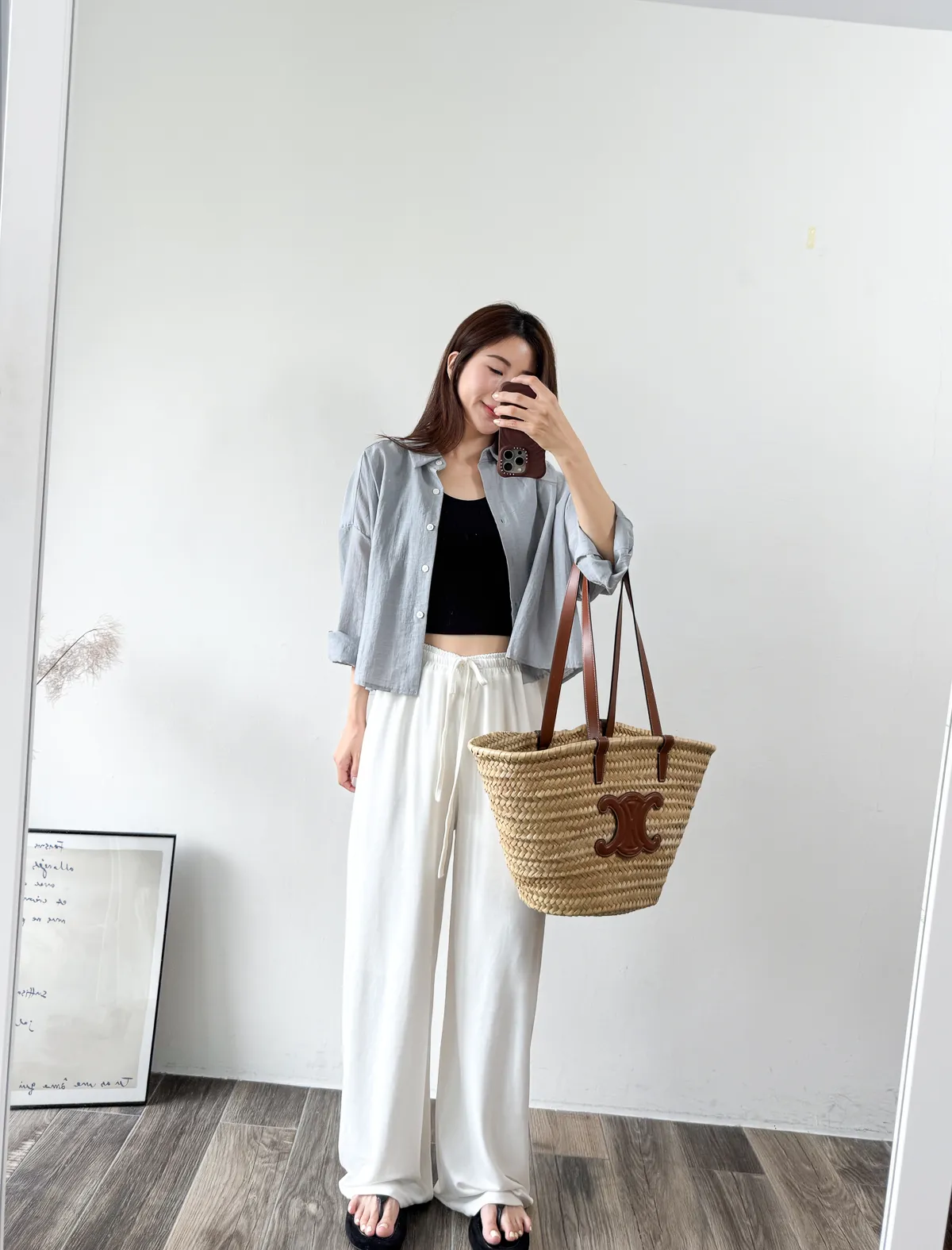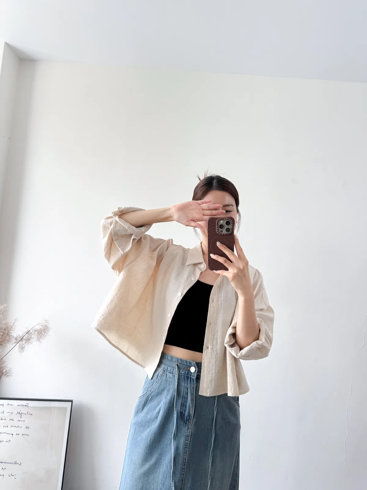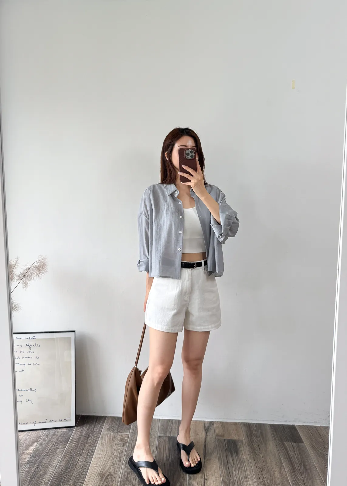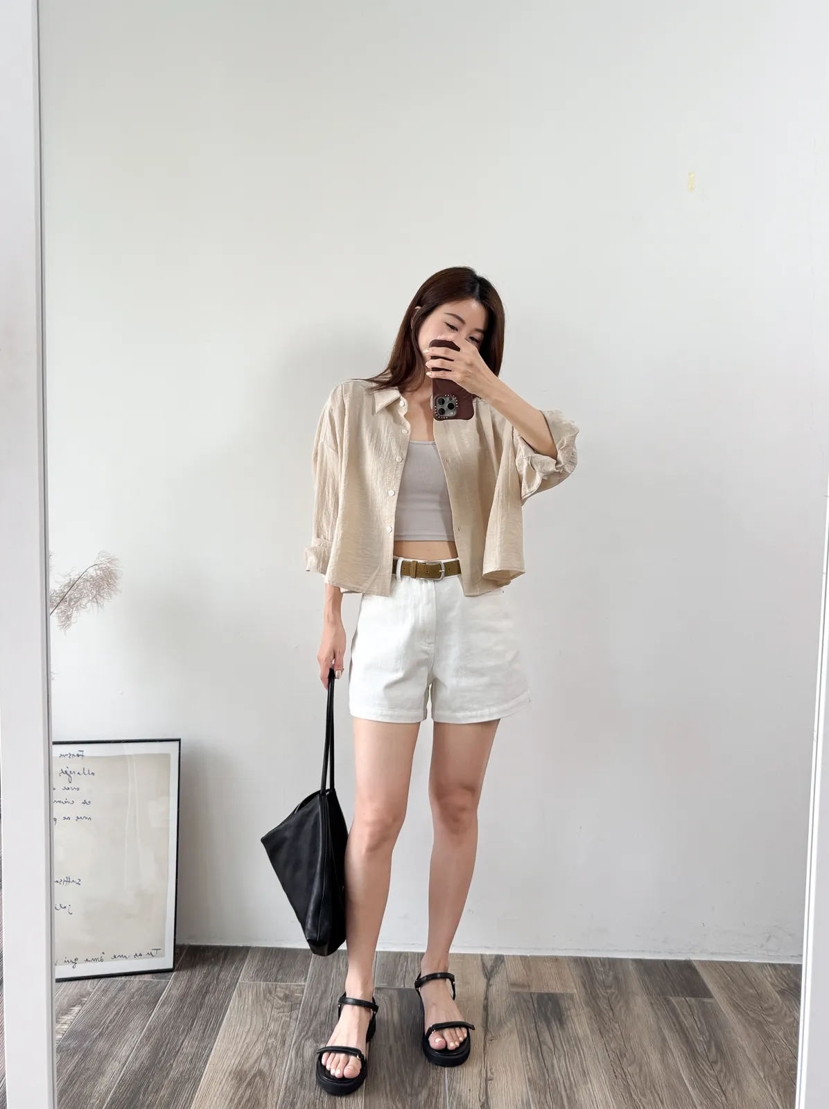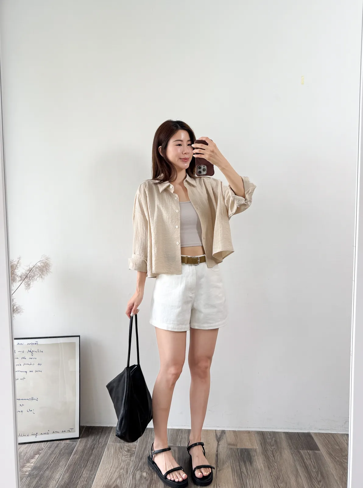 今年短版襯衫真的好難找~ 還好這季有準備兩款短襯衫給大家(也給自己XD) 大家對這款版型有熟悉嗎? 之前賣爆的打褶襯衫🧡🧡 實在太喜歡這版型 我都稱它神奇襯衫! 看著店面各種身形都駕馭的很好,而且好評反饋也好多!太厲害 肩膀的打折讓整體版型看起來更挺一些 穿起來有精神,版型也很俐落! 這次選了混麻的透氣材質~ 細緻手感,直接碰在肌膚上也不會有粗感 顏色選了好久好久~ 最後特別和上一檔自訂襯衫錯開顏色 藍灰這色好漂亮~灰濛濛的很迷人 第一眼忍不住就會選它😆 深藍呢~單看會覺得還好! 但實穿上會很滿意,有顯白感 而且是很飽和的質感色調🤩 淺杏穿起來的溫柔知性感是完全不同風格 大家可以選擇一深一淺打包💕*made in china model 158/48 (腰26吋 臀35吋)
