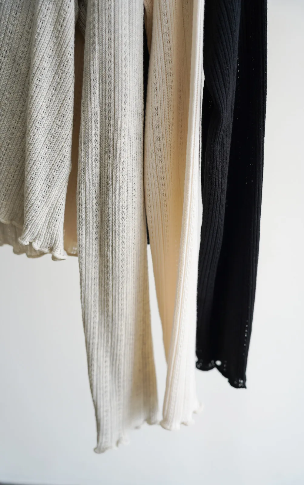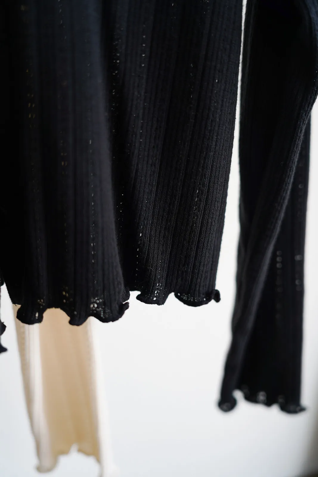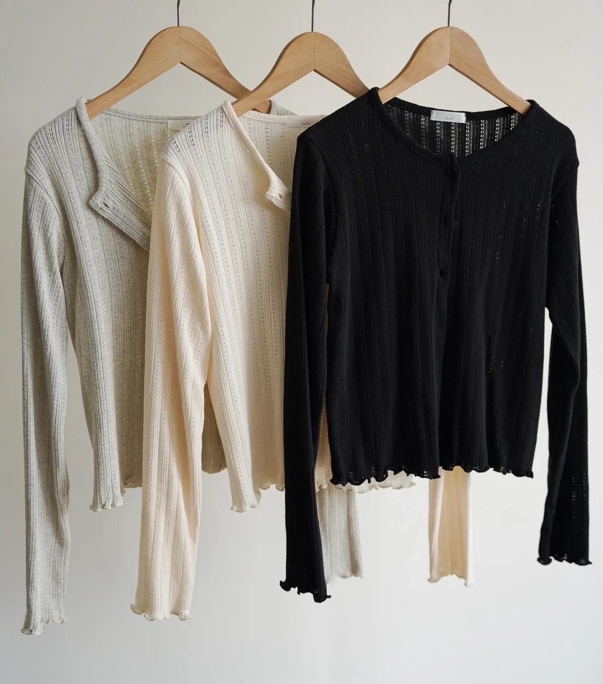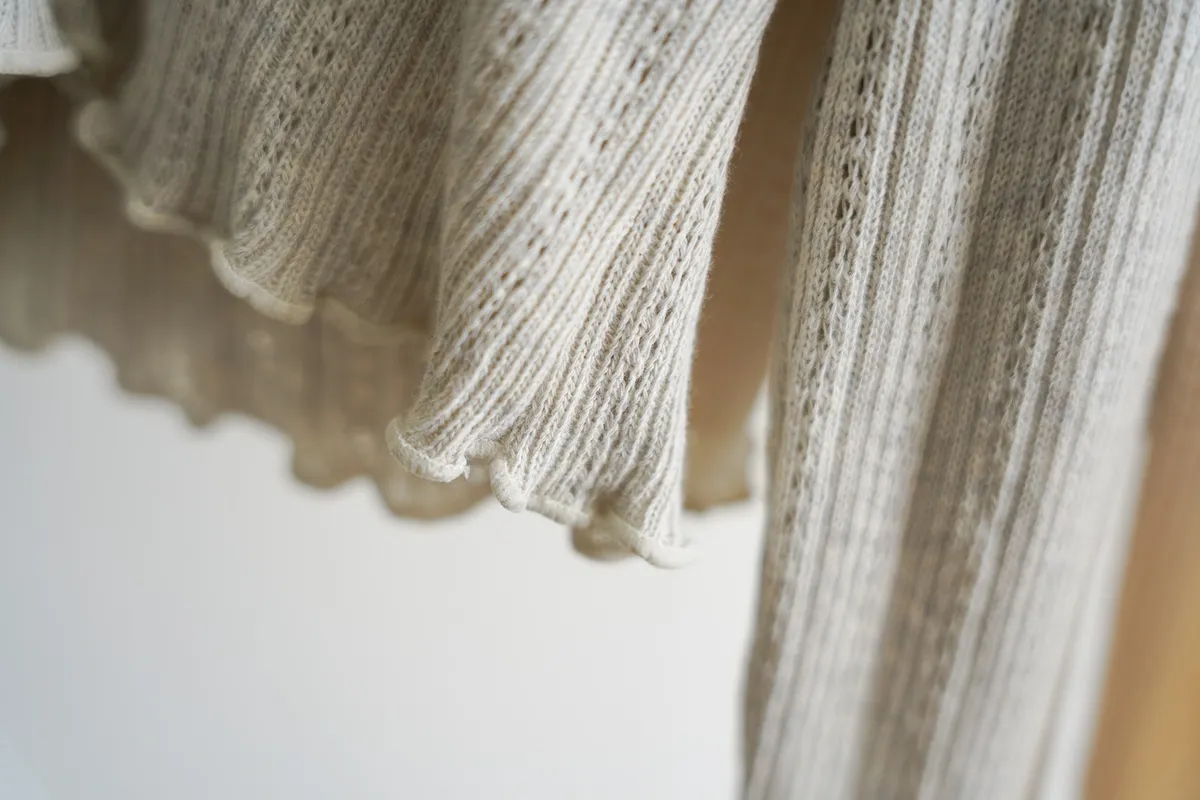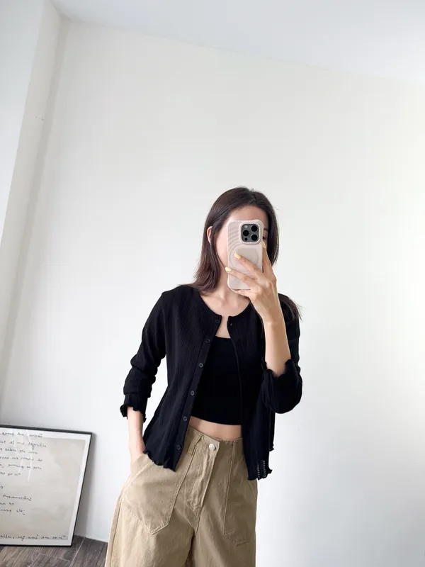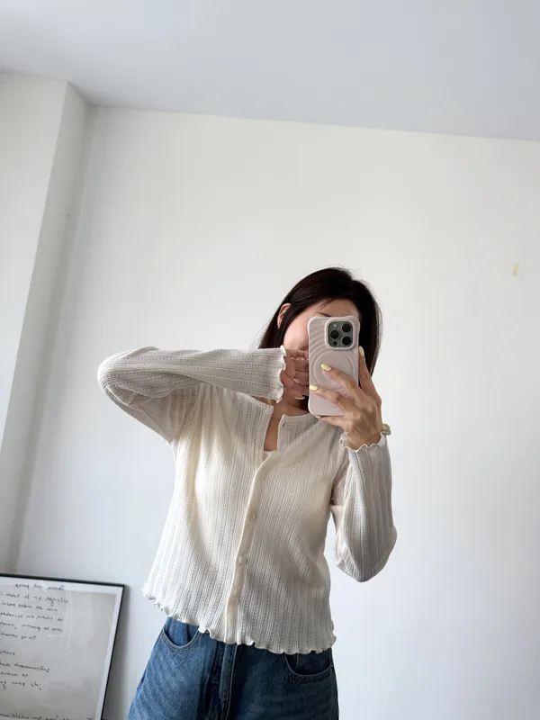 棉質 / 有彈性 這塊布料好可愛~簍空洞洞壓紋 袖口和下襬QQ捲邊 打開當小外套或是內搭小背心當上衣都行 配上圓裙或是寬褲等等都漂亮! Model 158/48 (腰25吋 臀35.5吋) detail//