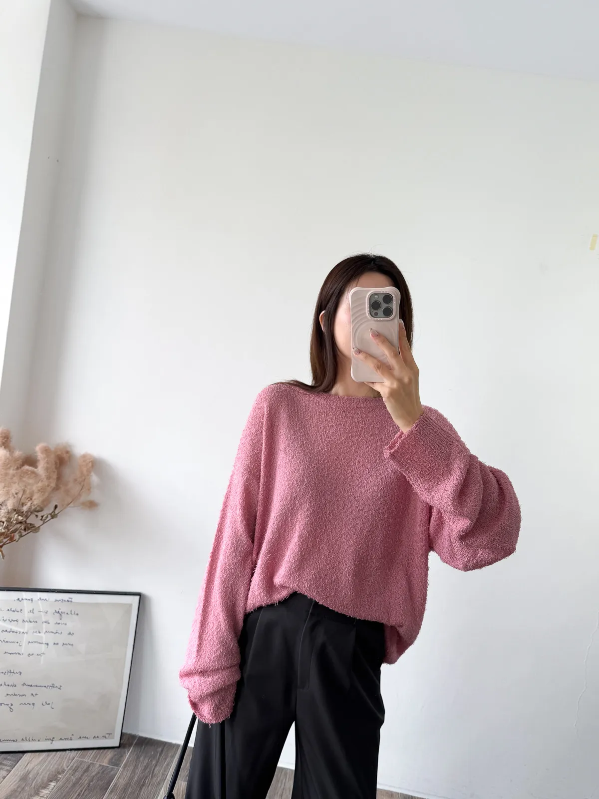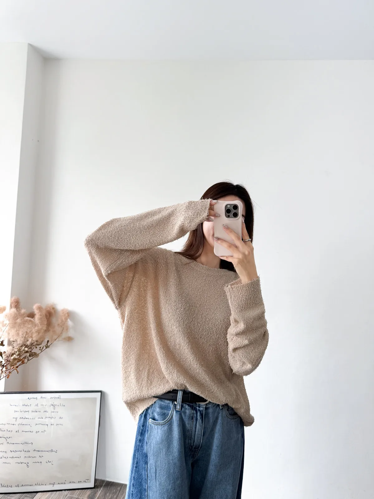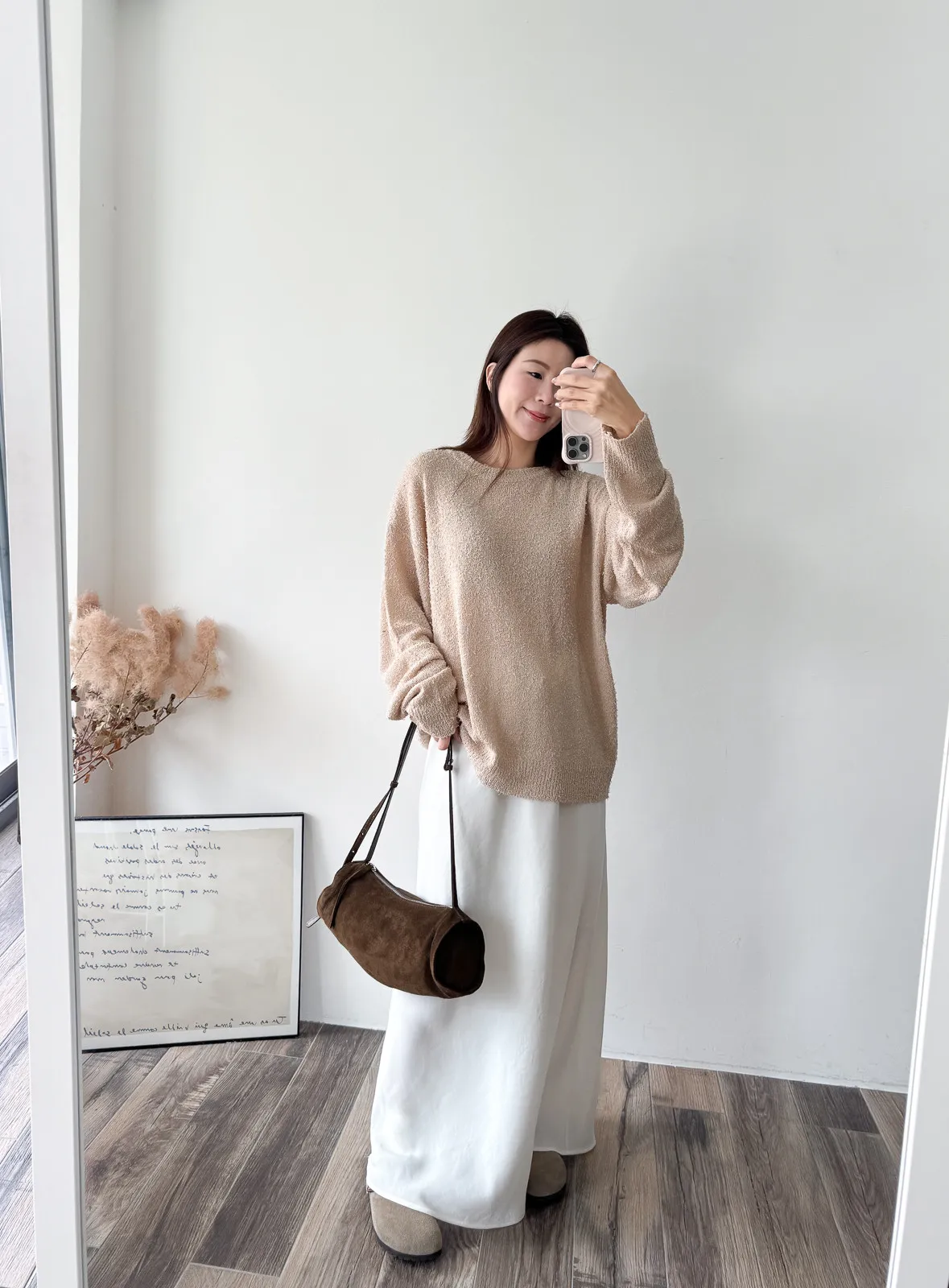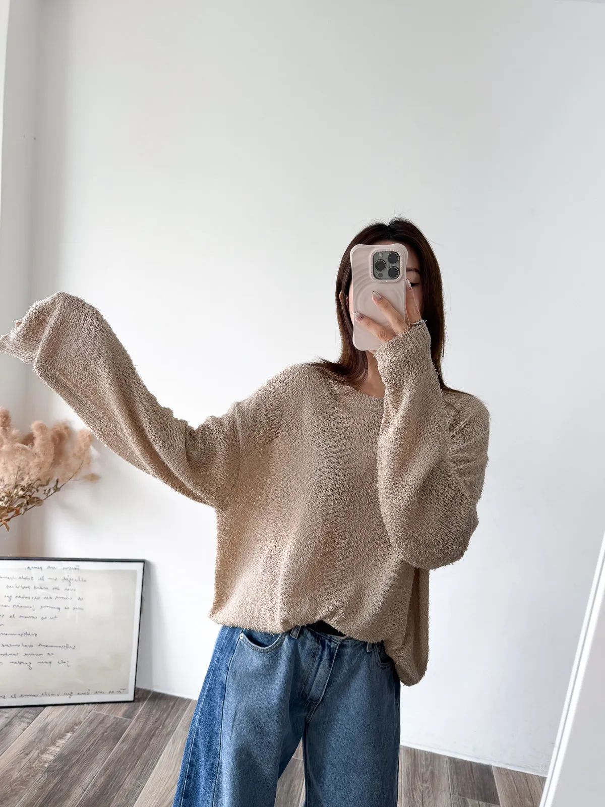 被這款的顏色整個吸引住! 還有布料上的鬚鬚感 好時髦好美呀~~ 這個杏無敵美~ 不會偏膚也不會偏灰 就是很溫柔只有美可以形容的杏色! 粉色也是廠商一拿出來我眼睛發亮的色調 這個粉太可愛了~~~ 配上牛仔褲也超好看>< 版型整體寬鬆長版垂墜度也很夠,穿上身=瘦 (笑 Model 158/48 (腰26吋 臀35.5吋) detail/