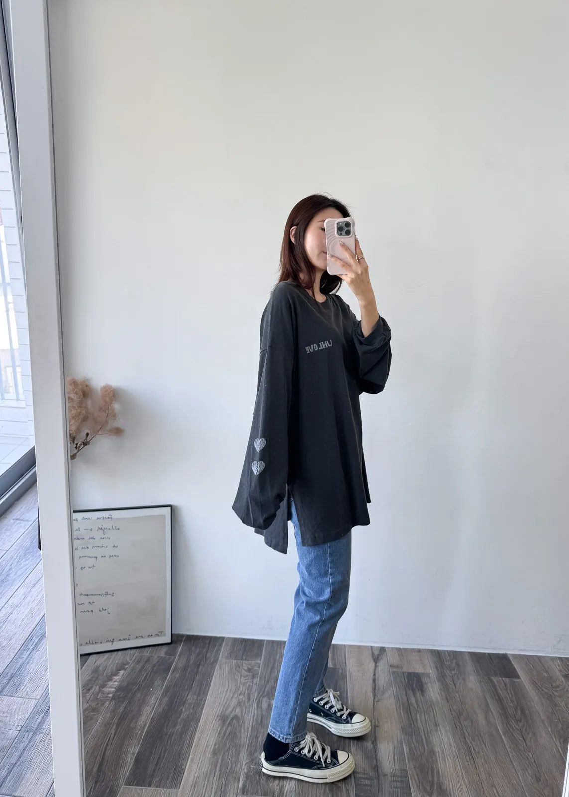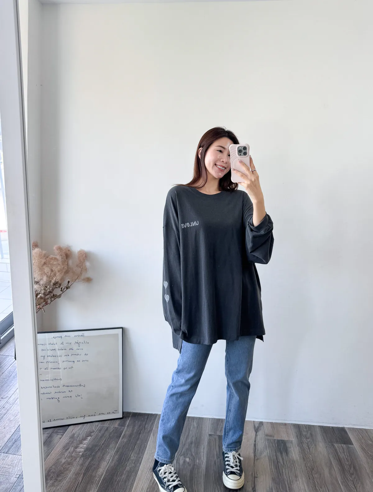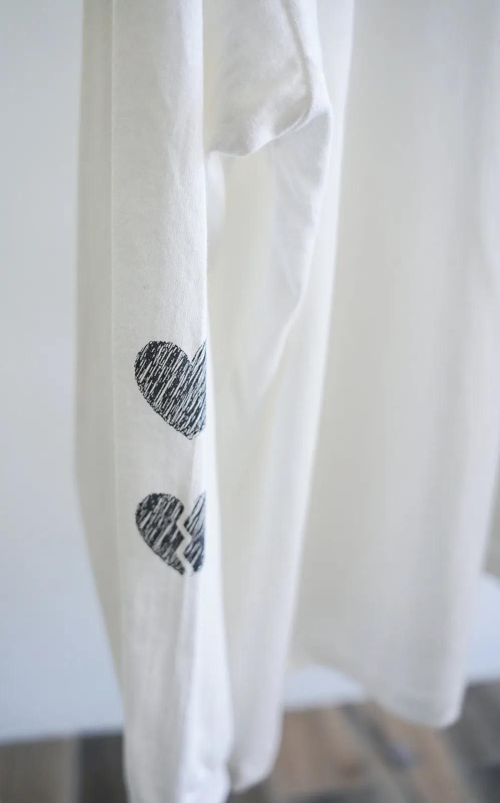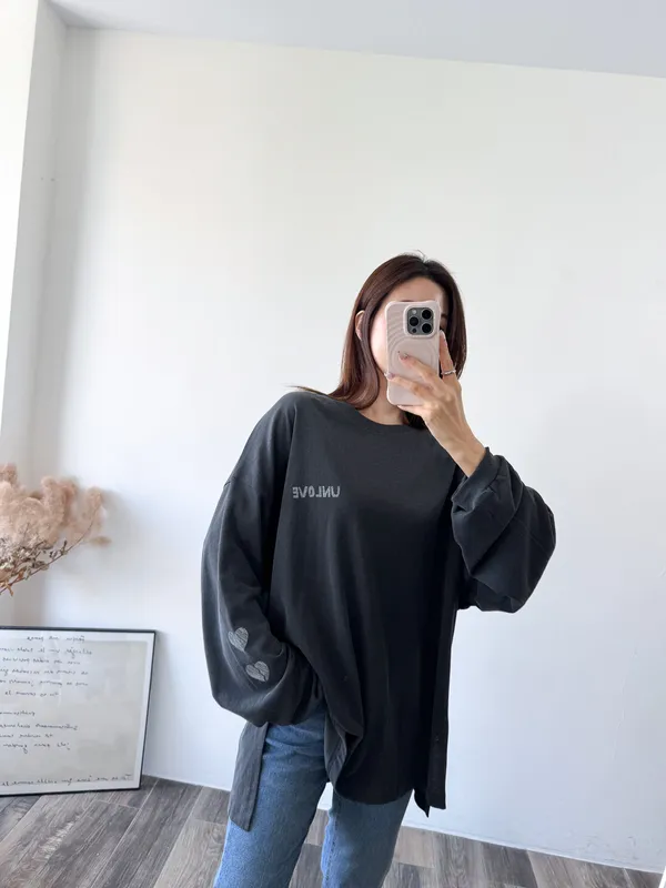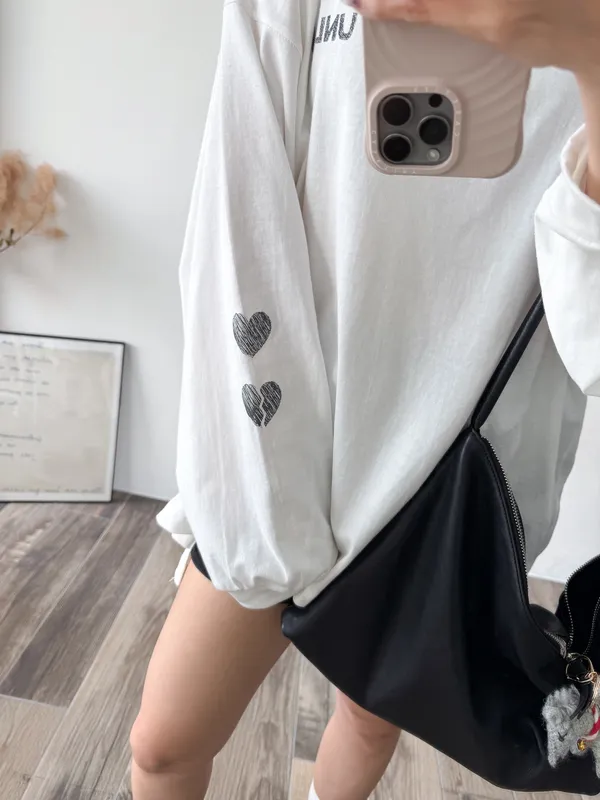 棉質 / 有彈性 這件會不會太可愛手袖上的兩個愛心 一個是完整愛心 一個是心碎愛心XD 整件寬鬆大大件非常推薦高個和M、L身形入手 我158穿稍微長一點但剛好可以搭配四分短褲非常有安全感~ 袖口有微微泡袖感背面是手繪的英文字體 這款整件就是又特別又可愛讓人必須收藏XD Model 158/48 (腰26吋 臀35.5吋) detail/