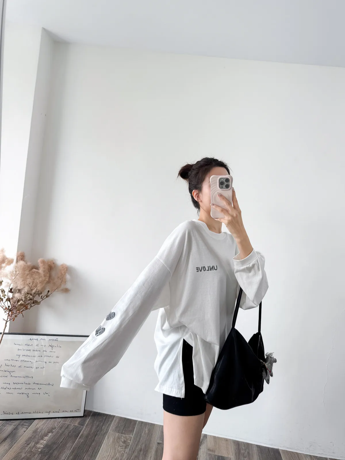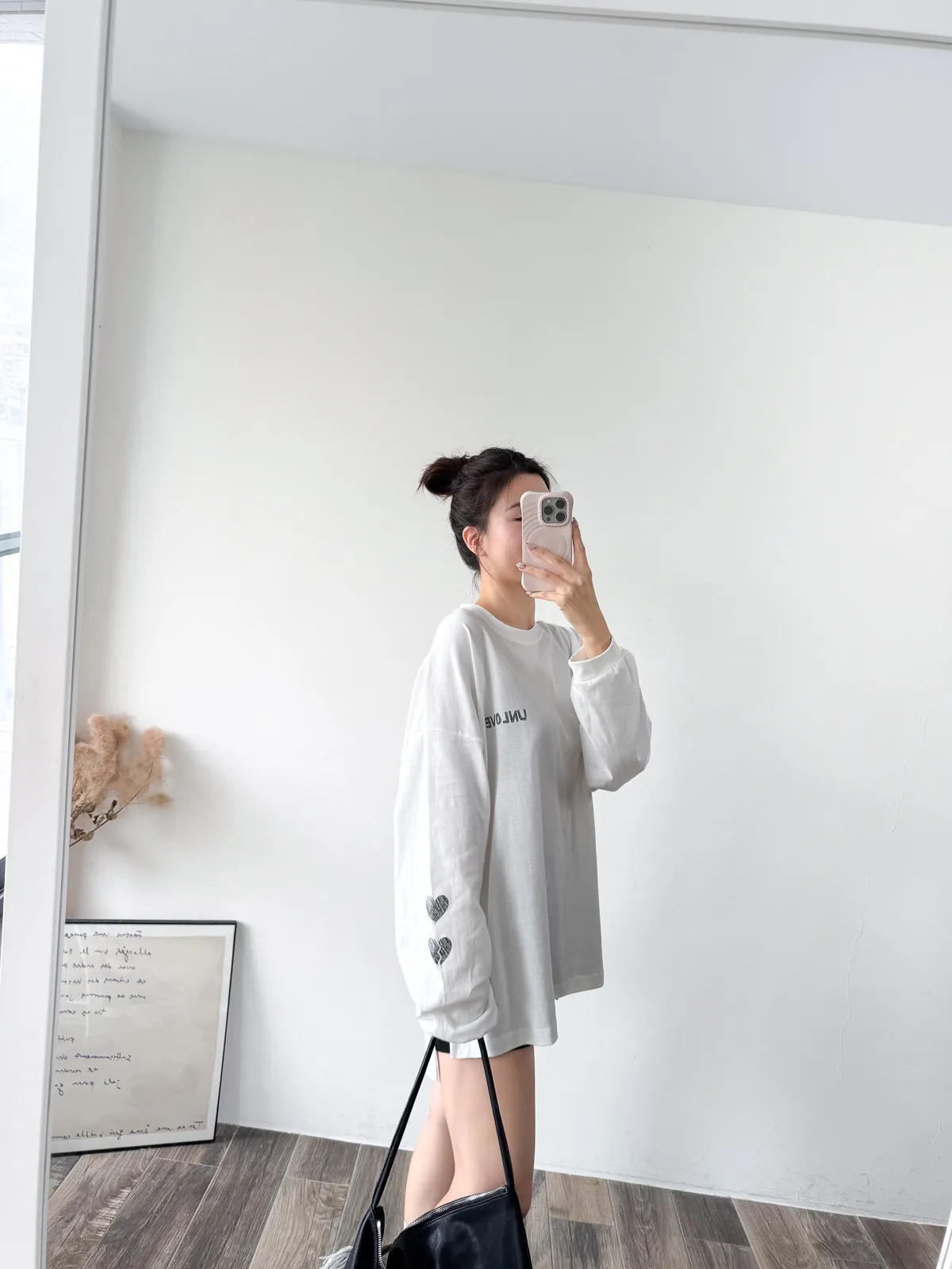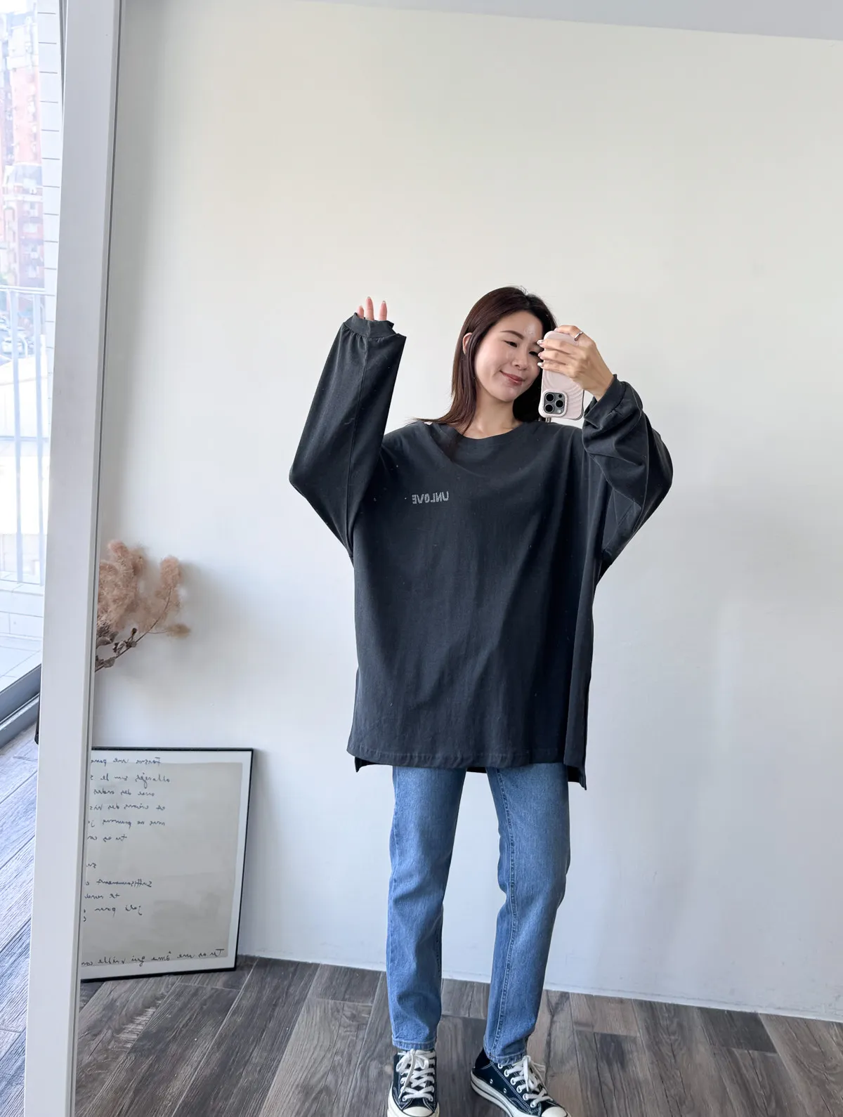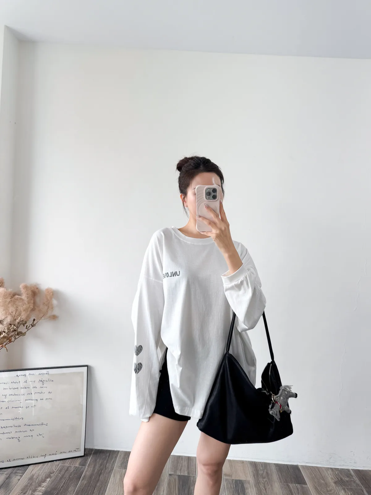 棉質 / 有彈性 這件會不會太可愛手袖上的兩個愛心 一個是完整愛心 一個是心碎愛心XD 整件寬鬆大大件非常推薦高個和M、L身形入手 我158穿稍微長一點但剛好可以搭配四分短褲非常有安全感~ 袖口有微微泡袖感背面是手繪的英文字體 這款整件就是又特別又可愛讓人必須收藏XD Model 158/48 (腰26吋 臀35.5吋) detail/