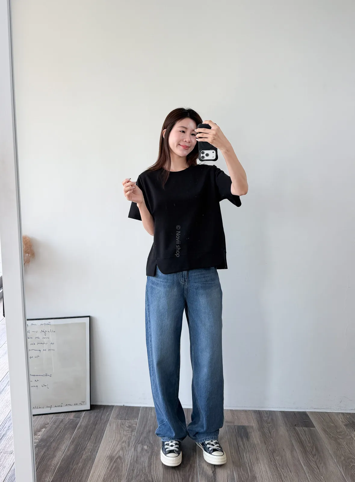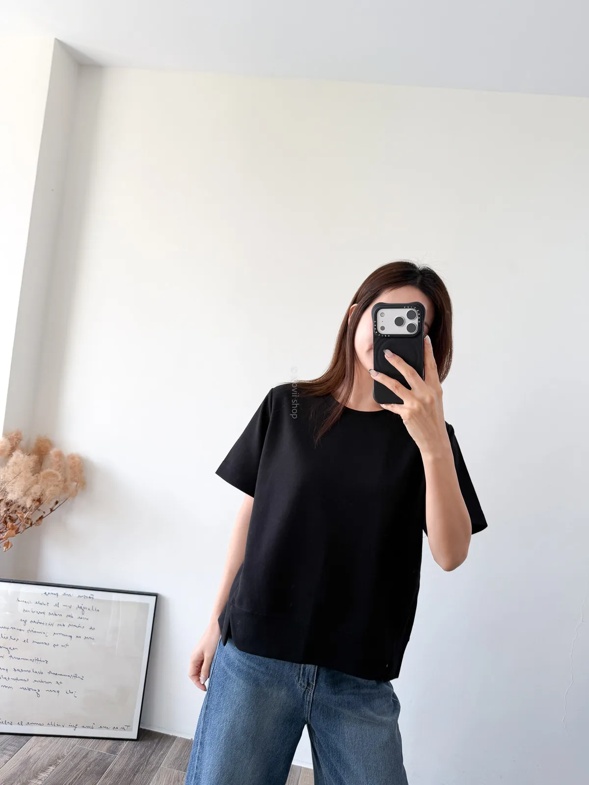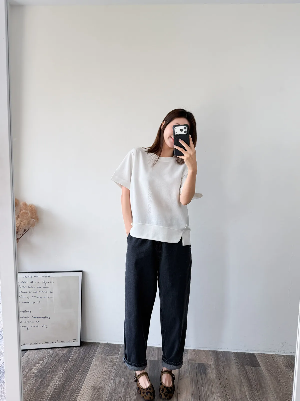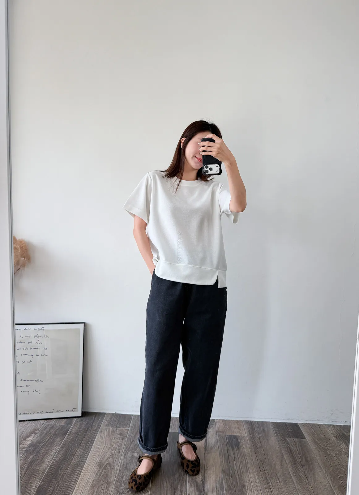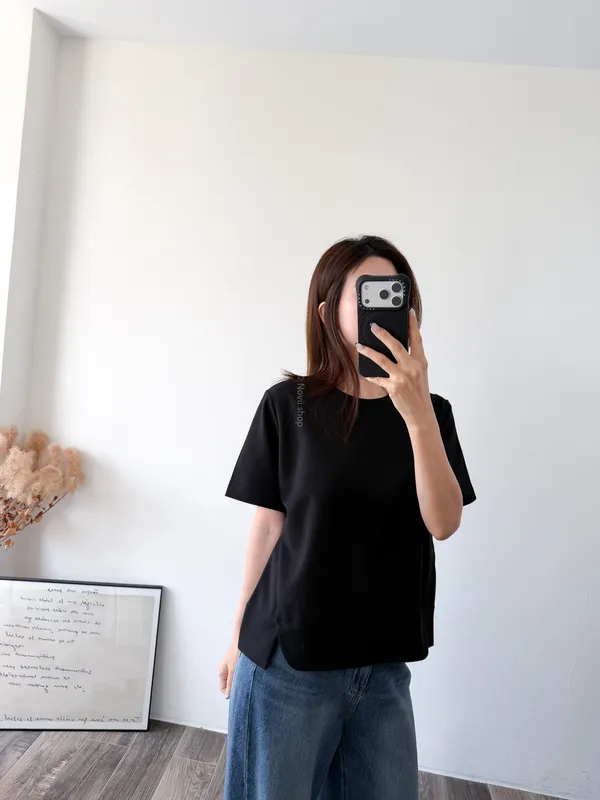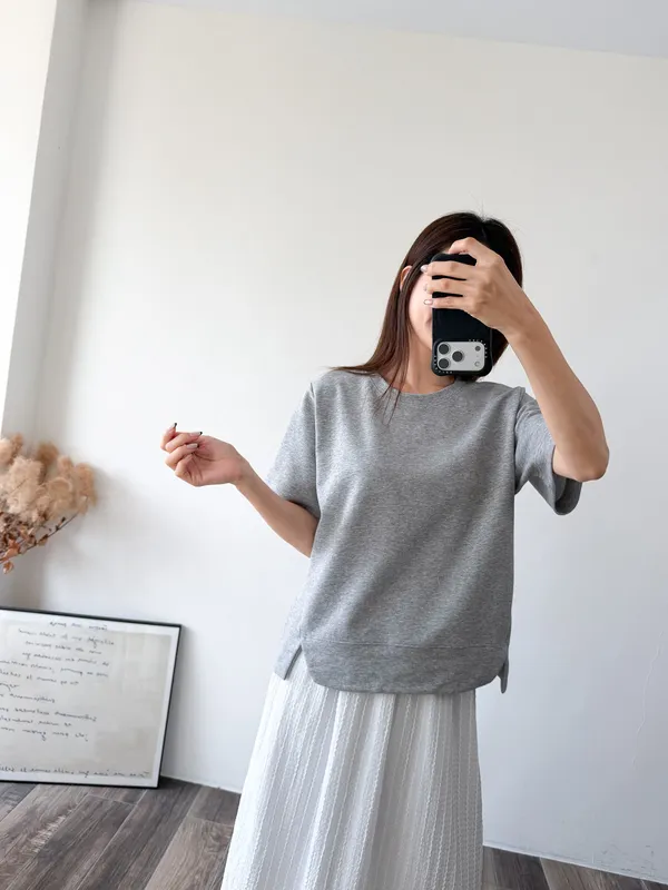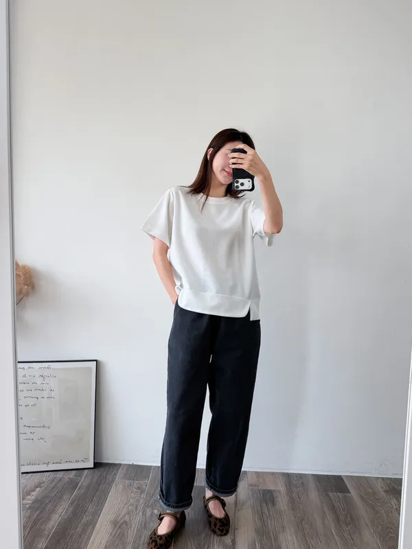 棉質 / 有彈性 布料非常的輕盈 七分袖寬鬆版型人人都可以駕馭~ 正面下擺有兩側有小小開衩造型~ 好可愛吶! 下半身隨意配上自己喜歡的褲子 整體穿單簡單卻不無聊! 讚讚 Model 158/48 (腰26 臀35.5吋) detail//