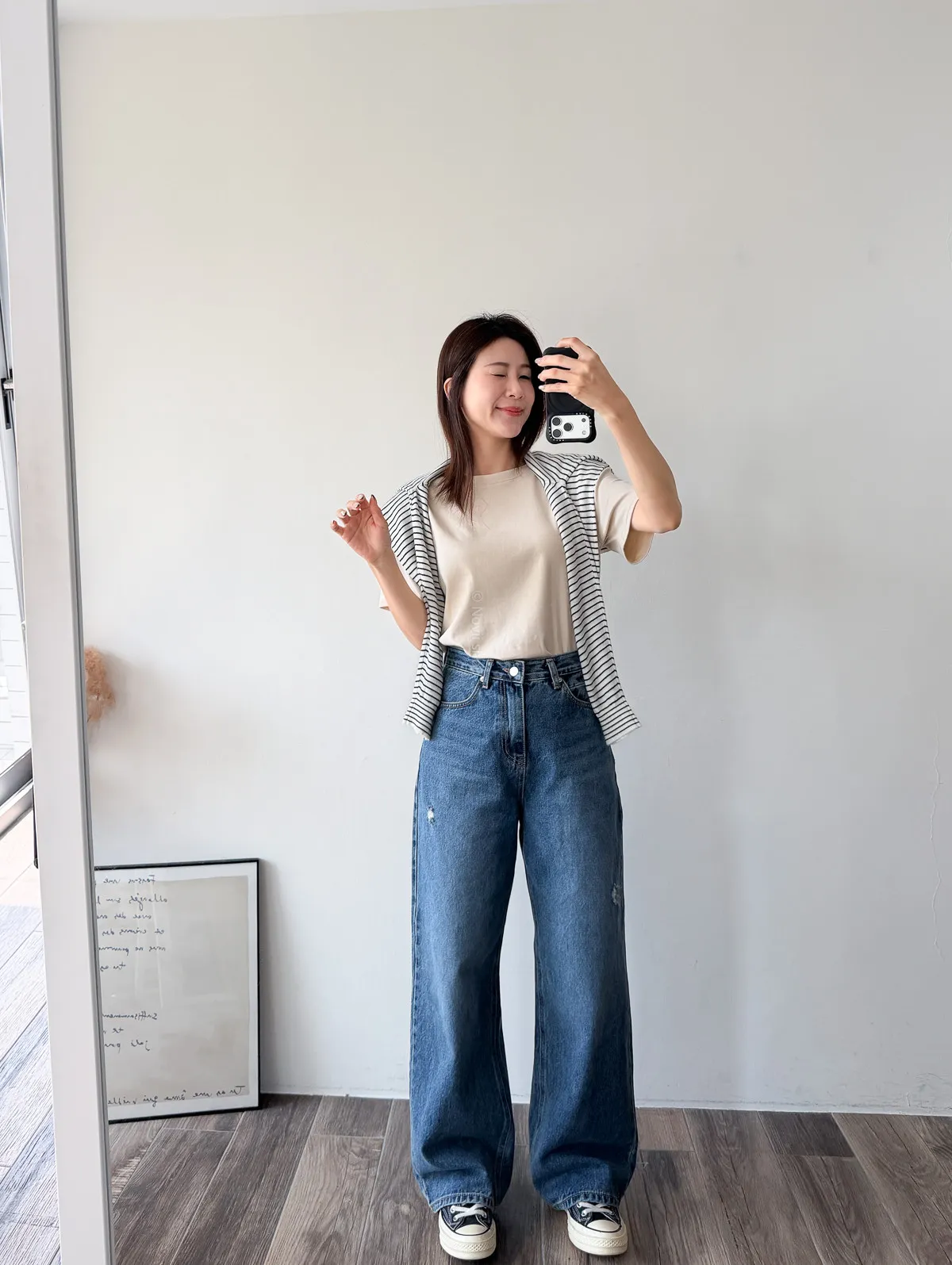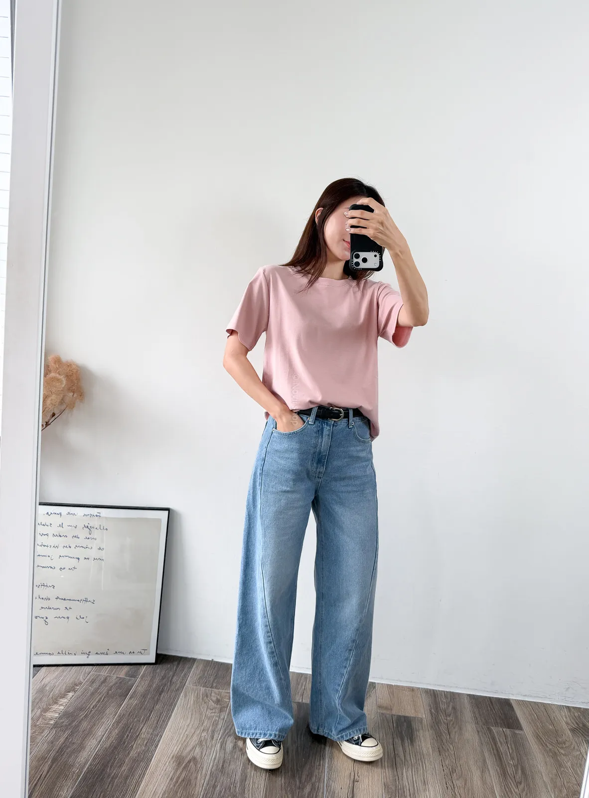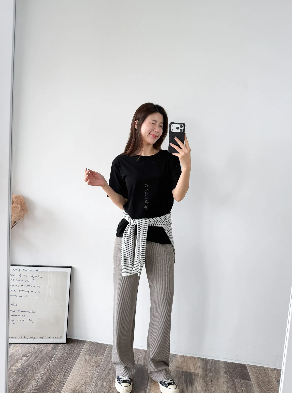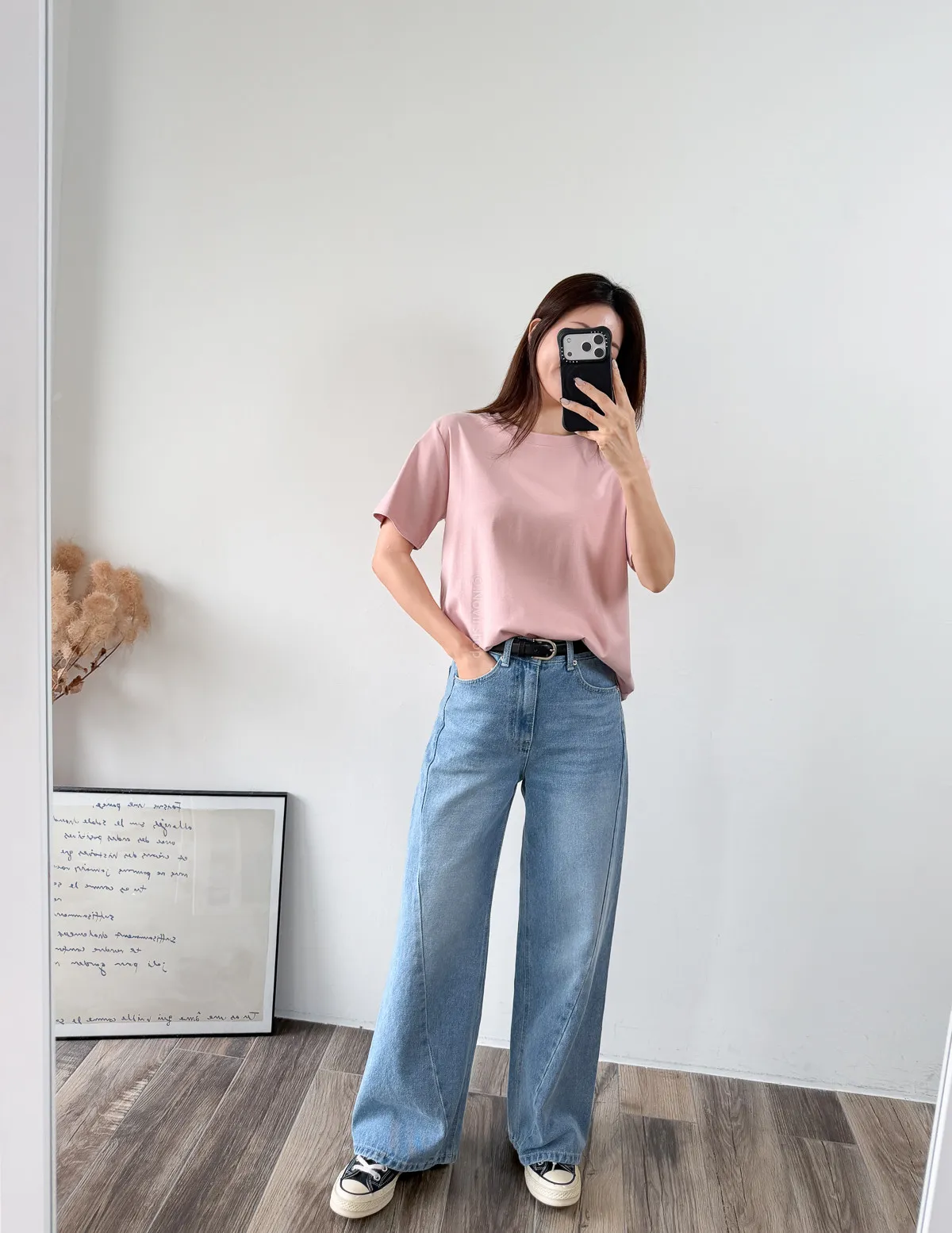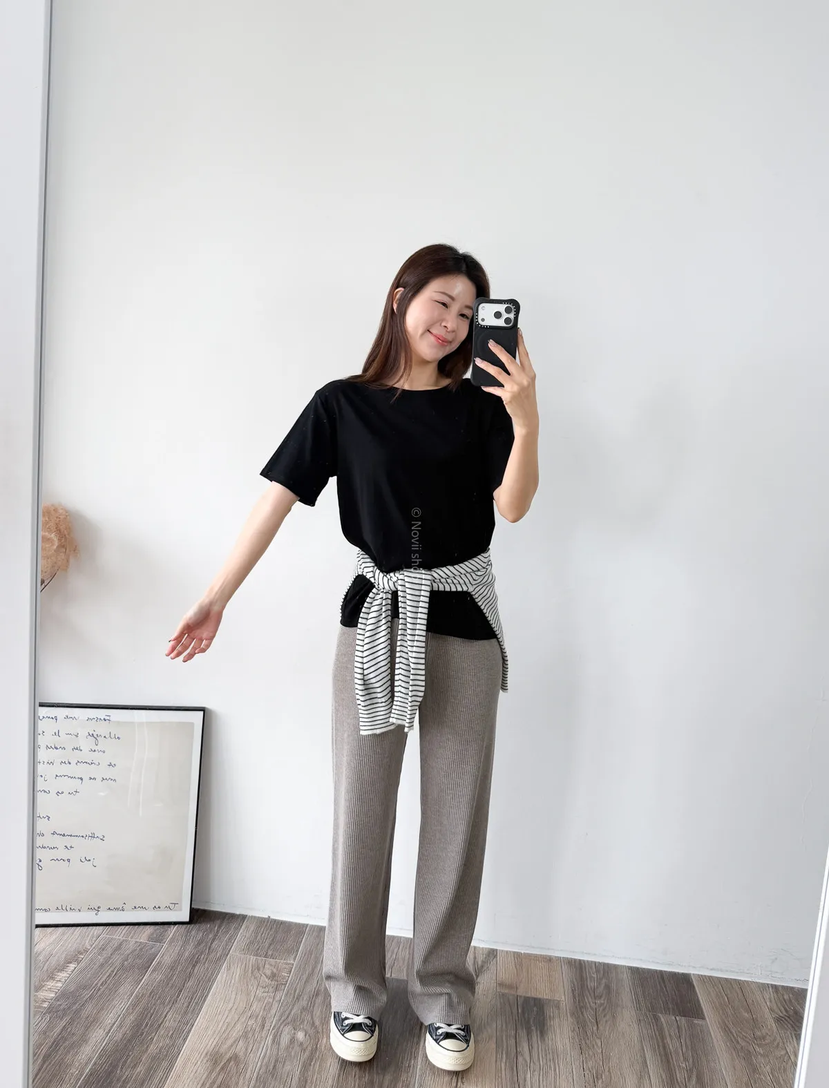 棉質 / 有彈性 版型整體寬鬆感布料很薄又有彈力 把整件紮進褲子也很可以不會讓肚子鼓鼓的~ 這布料夏天穿絕對OK!!! 非常涼快~ 價格也可愛 Model 158/48 (腰26 臀35.5吋) detail//
