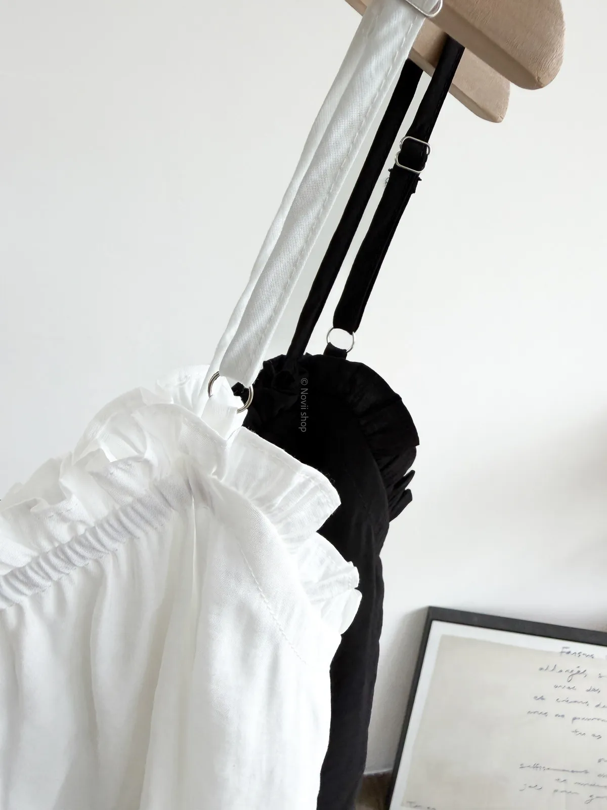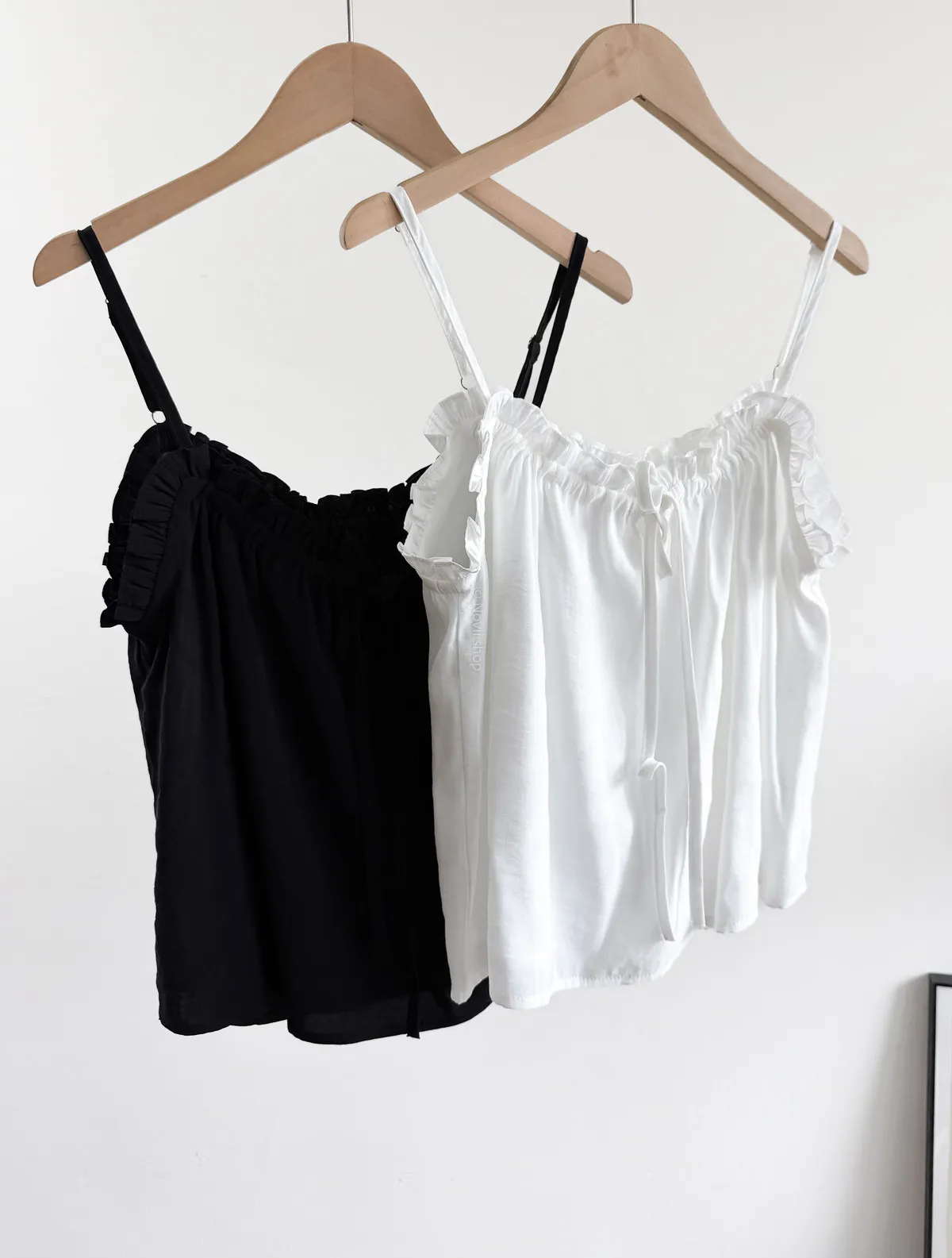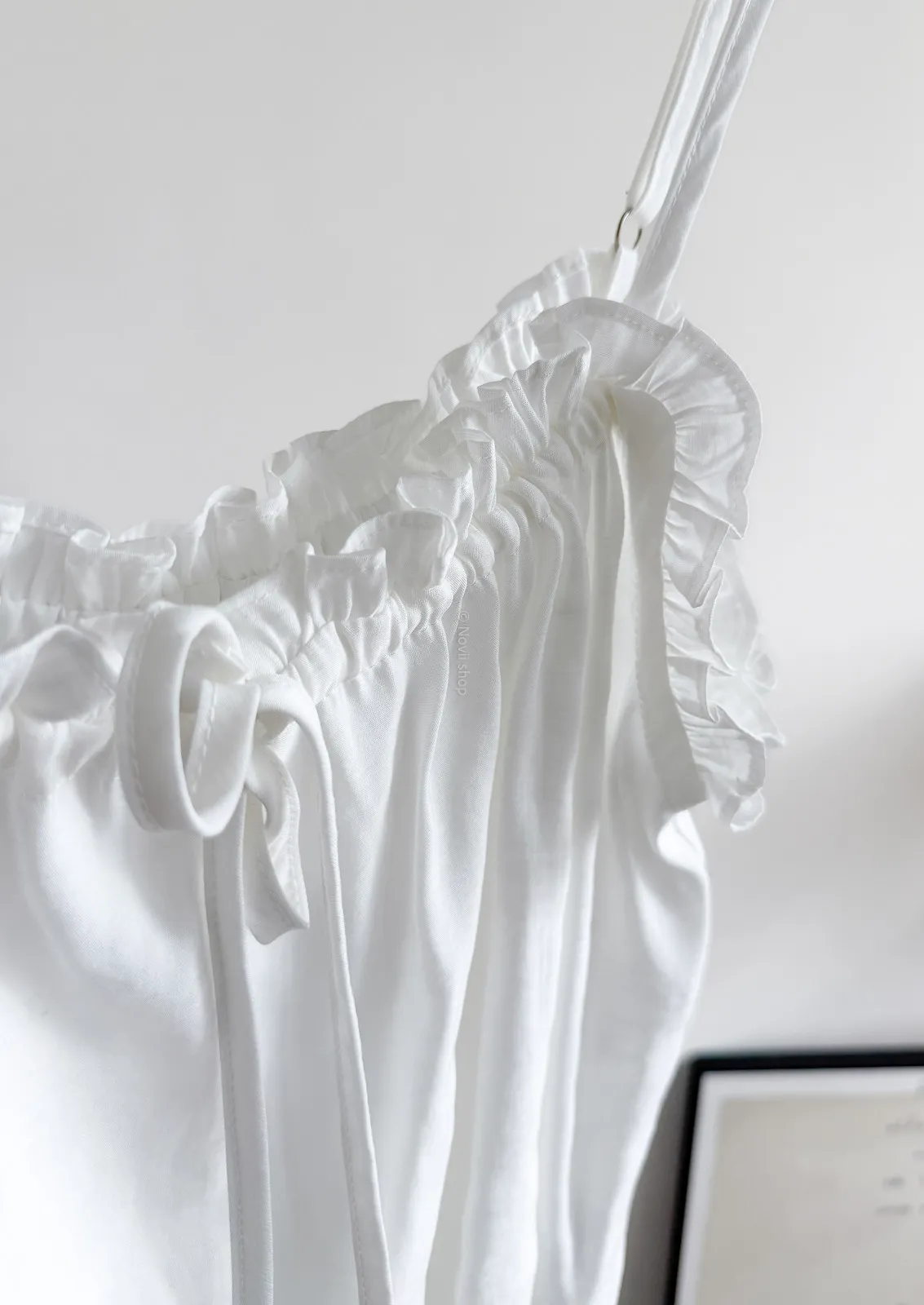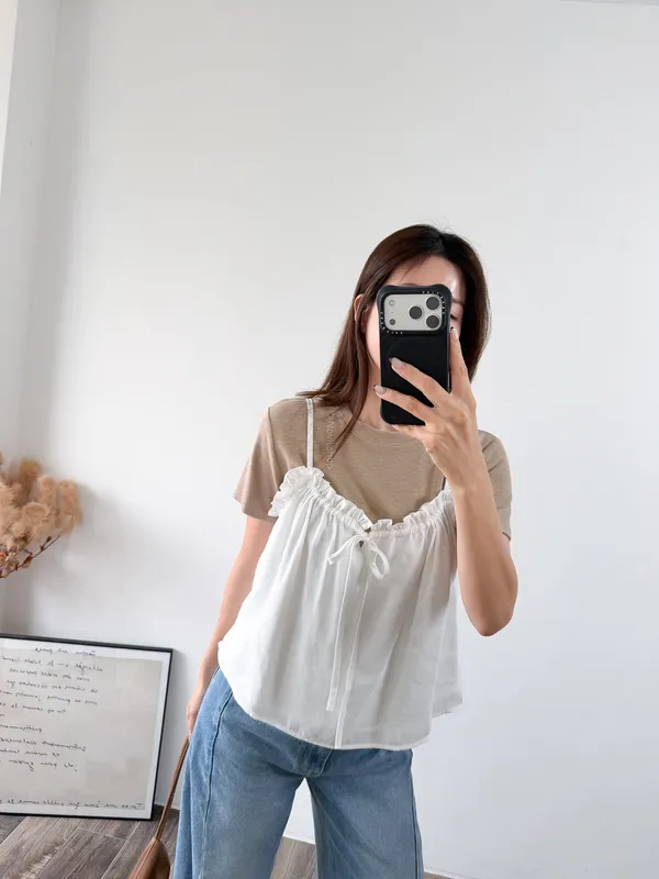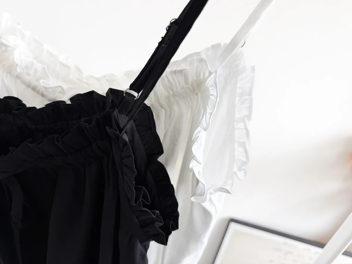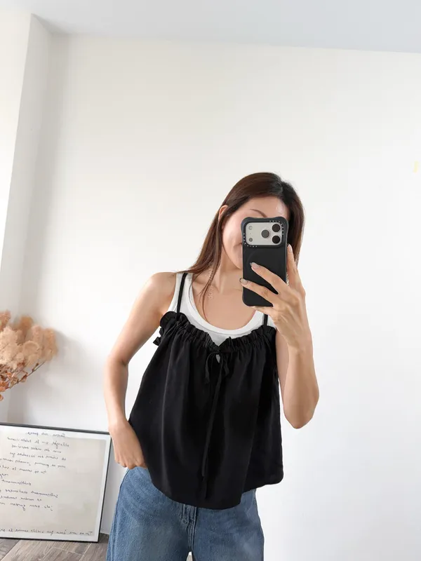 棉混聚脂纖維 / 些微彈性 / 有內裏 這件好可愛噎!! 領口滾邊地方是小小荷葉感 背面有鬆緊帶 正面是抽繩自由調整大小 肩帶可以調整長度. 裡面隨意搭上短袖背心就好好看了~ Model 158/48 (腰26 臀35.5吋) detail//