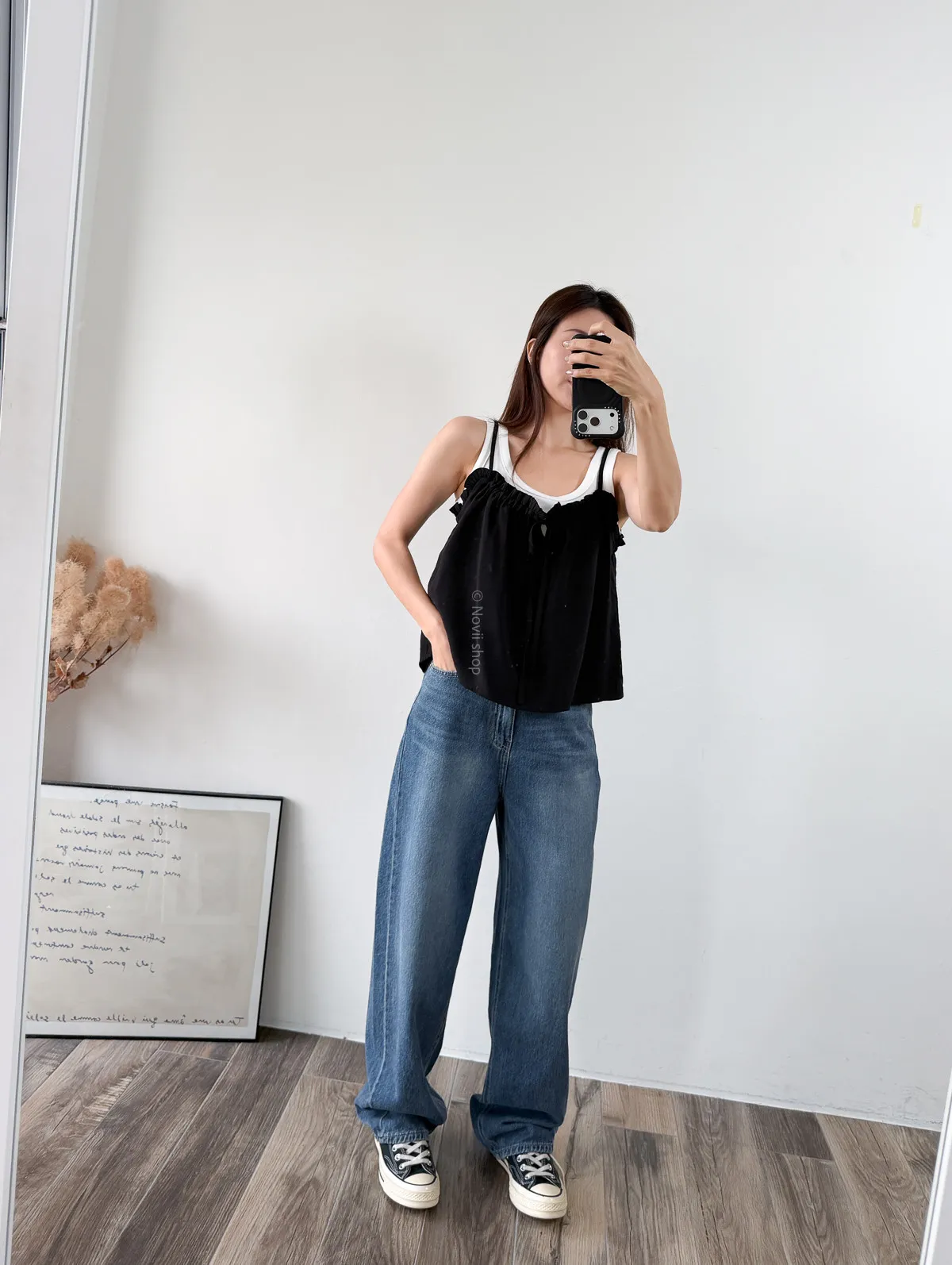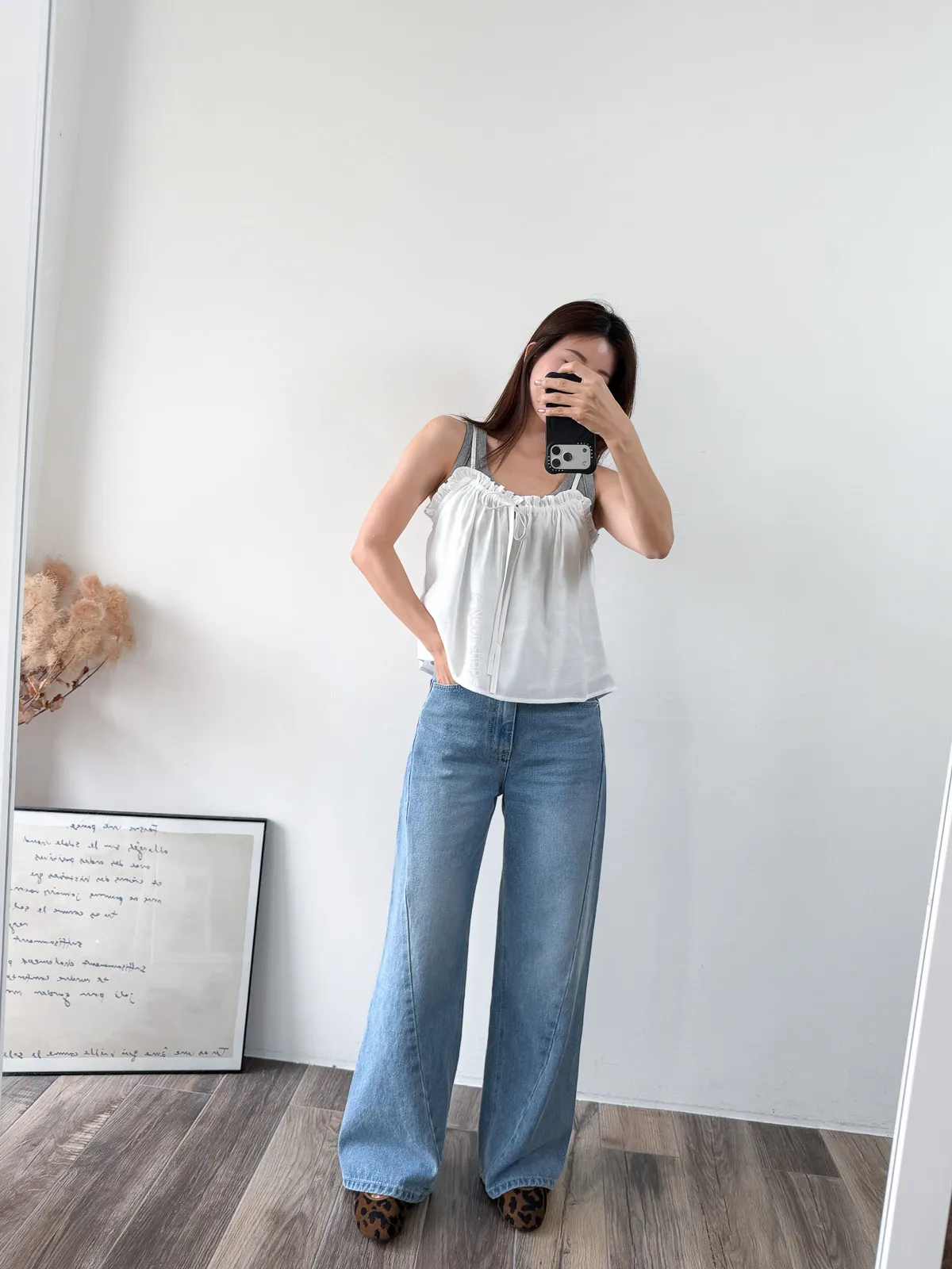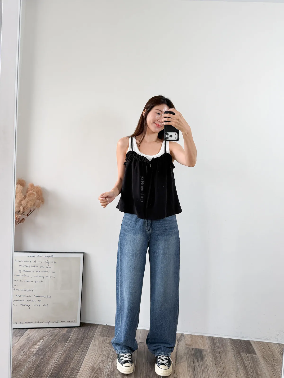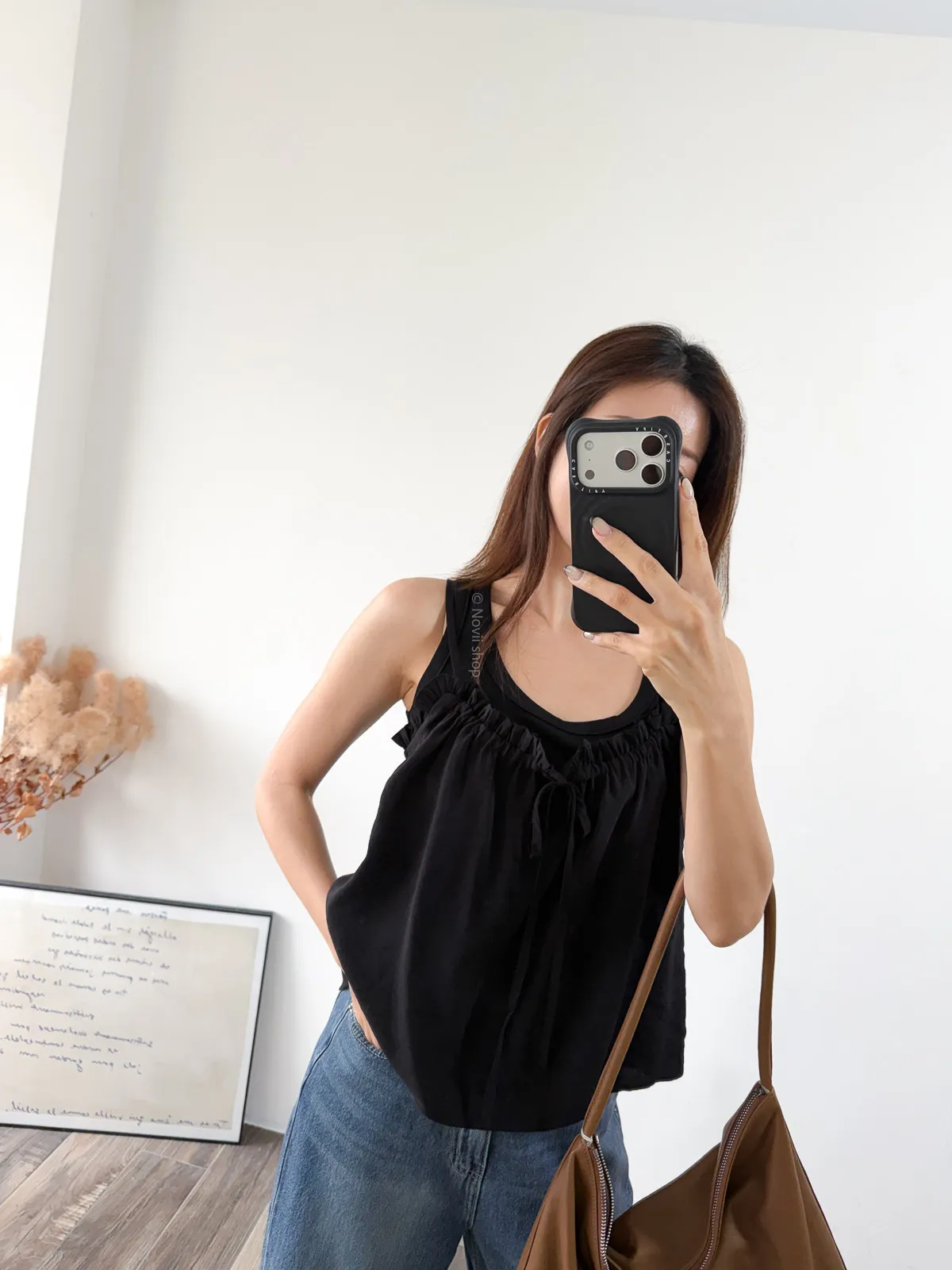 棉混聚脂纖維 / 些微彈性 / 有內裏 這件好可愛噎!! 領口滾邊地方是小小荷葉感 背面有鬆緊帶 正面是抽繩自由調整大小 肩帶可以調整長度. 裡面隨意搭上短袖背心就好好看了~ Model 158/48 (腰26 臀35.5吋) detail//