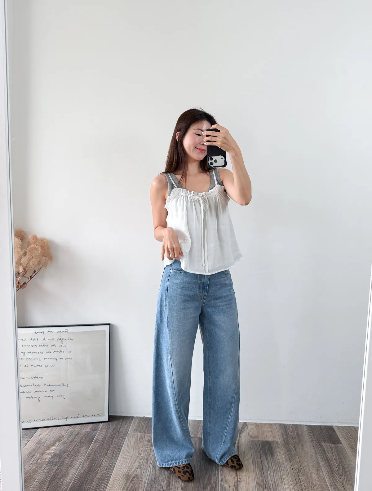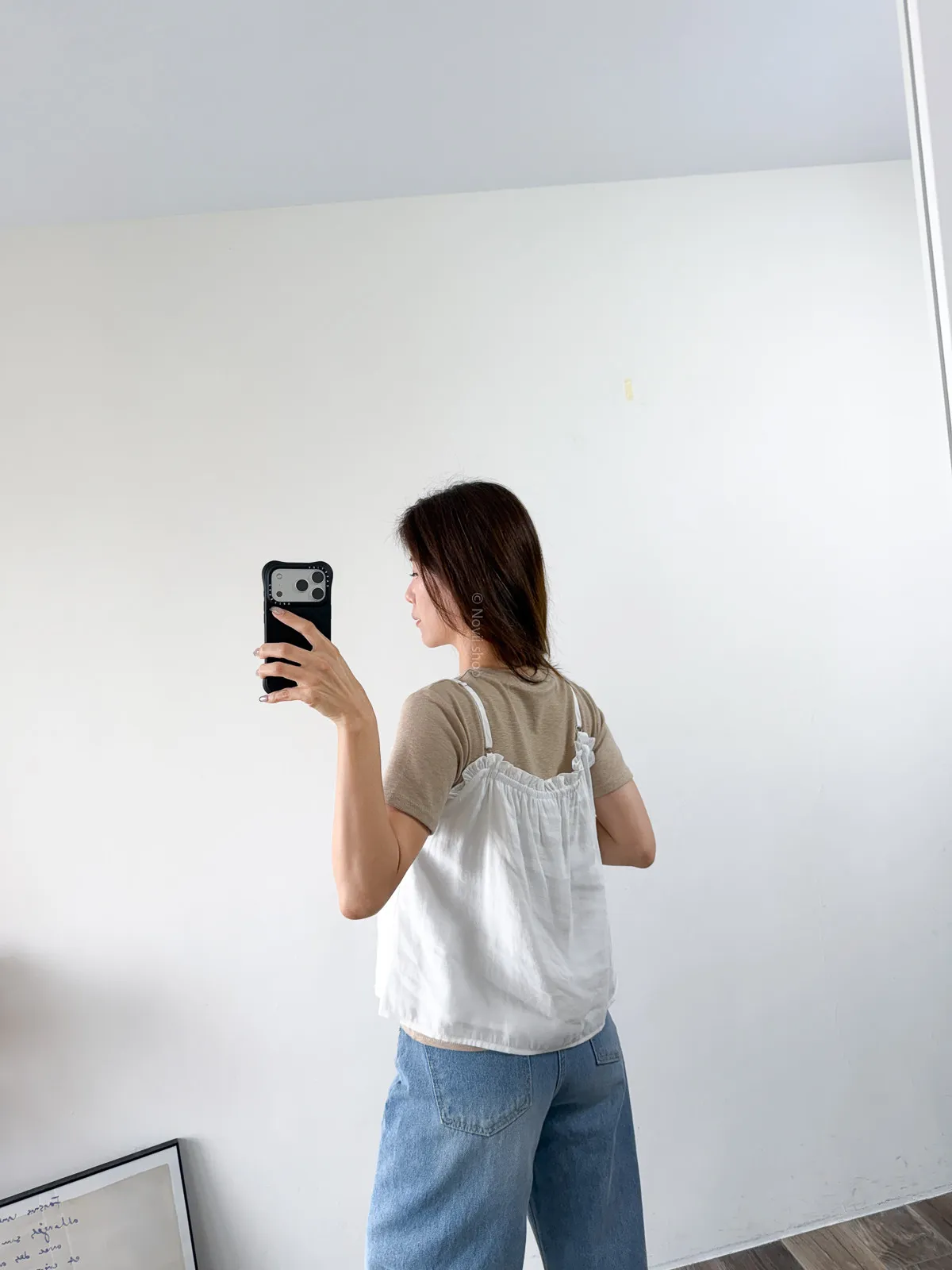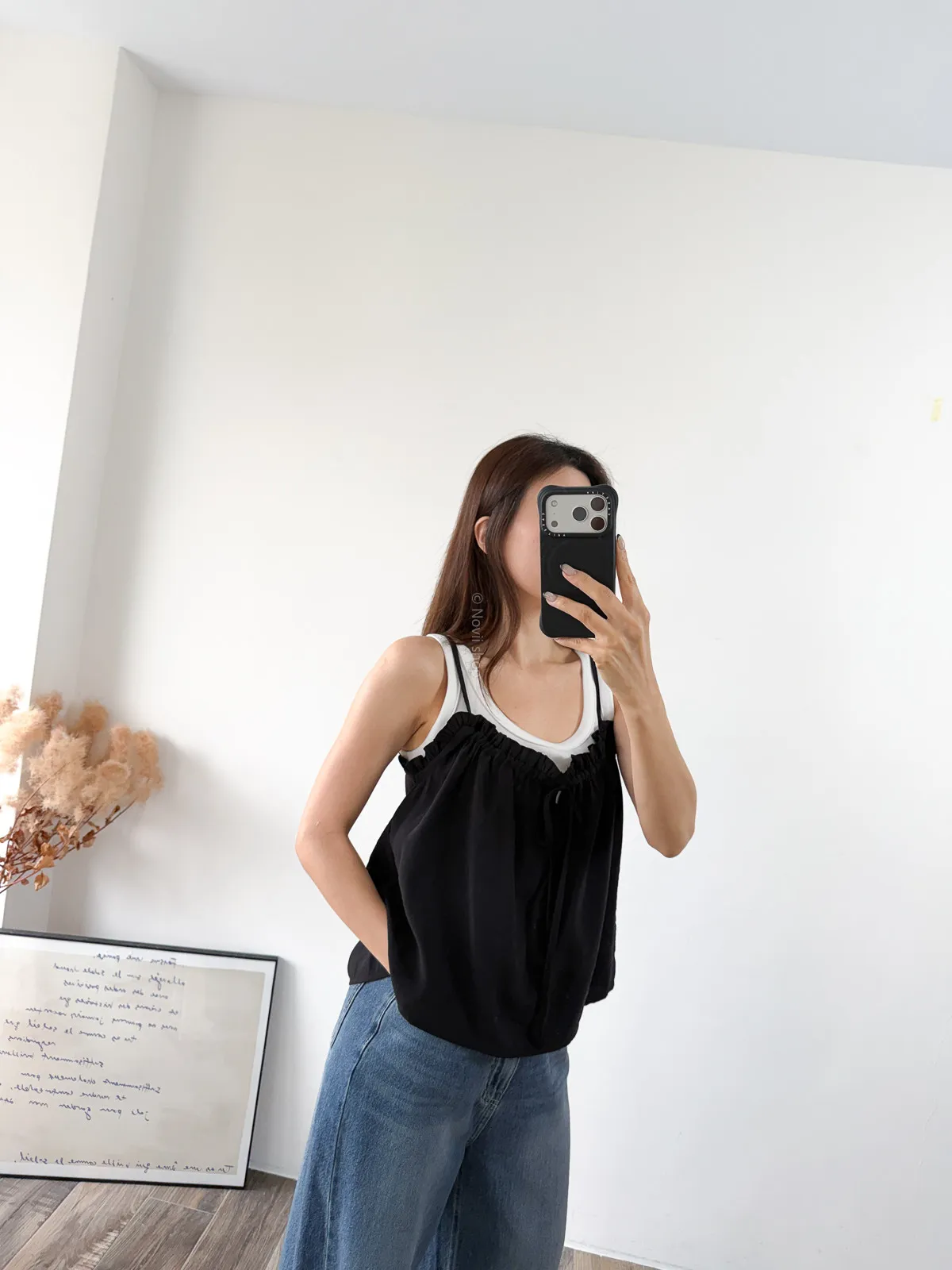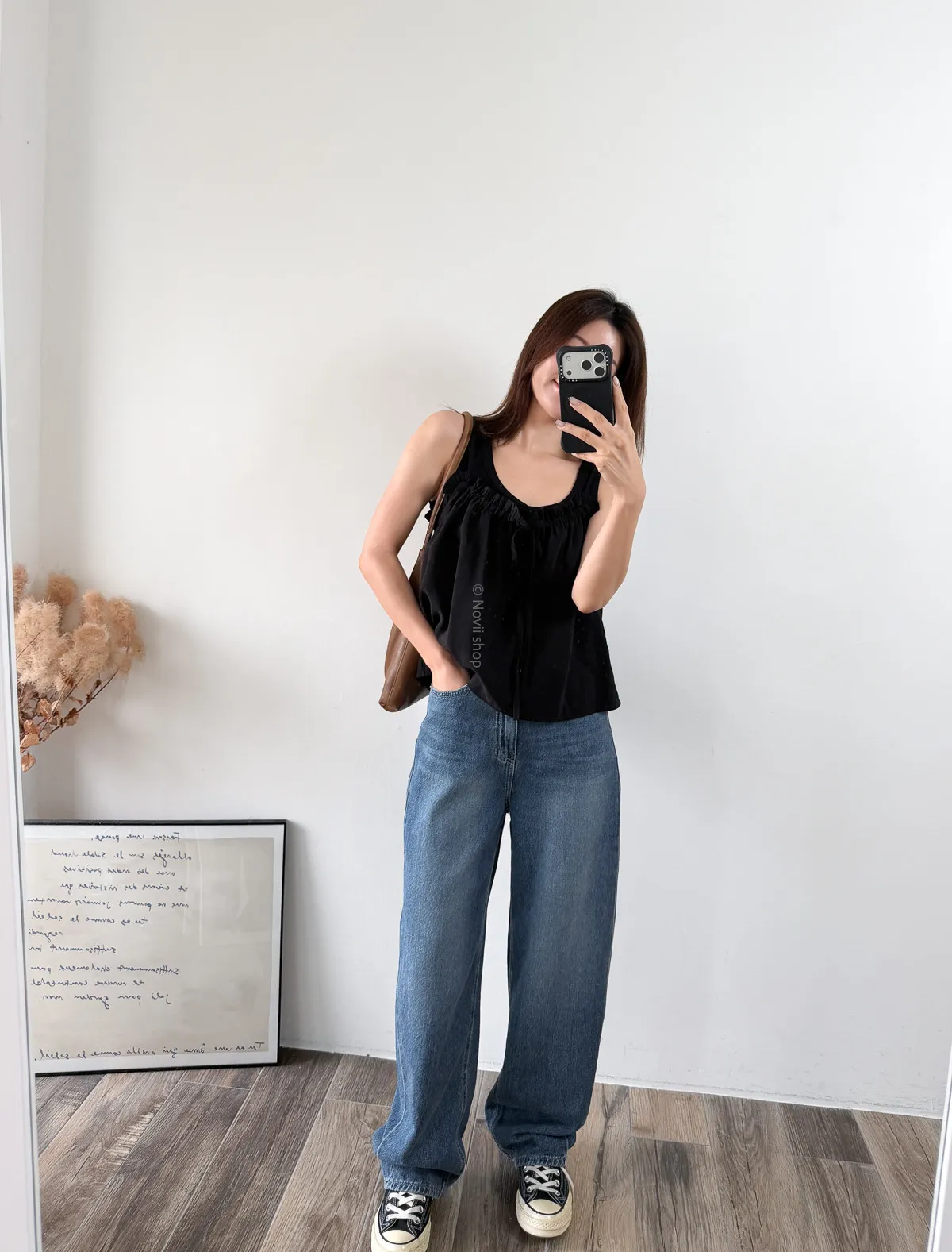 棉混聚脂纖維 / 些微彈性 / 有內裏 這件好可愛噎!! 領口滾邊地方是小小荷葉感 背面有鬆緊帶 正面是抽繩自由調整大小 肩帶可以調整長度. 裡面隨意搭上短袖背心就好好看了~ Model 158/48 (腰26 臀35.5吋) detail//