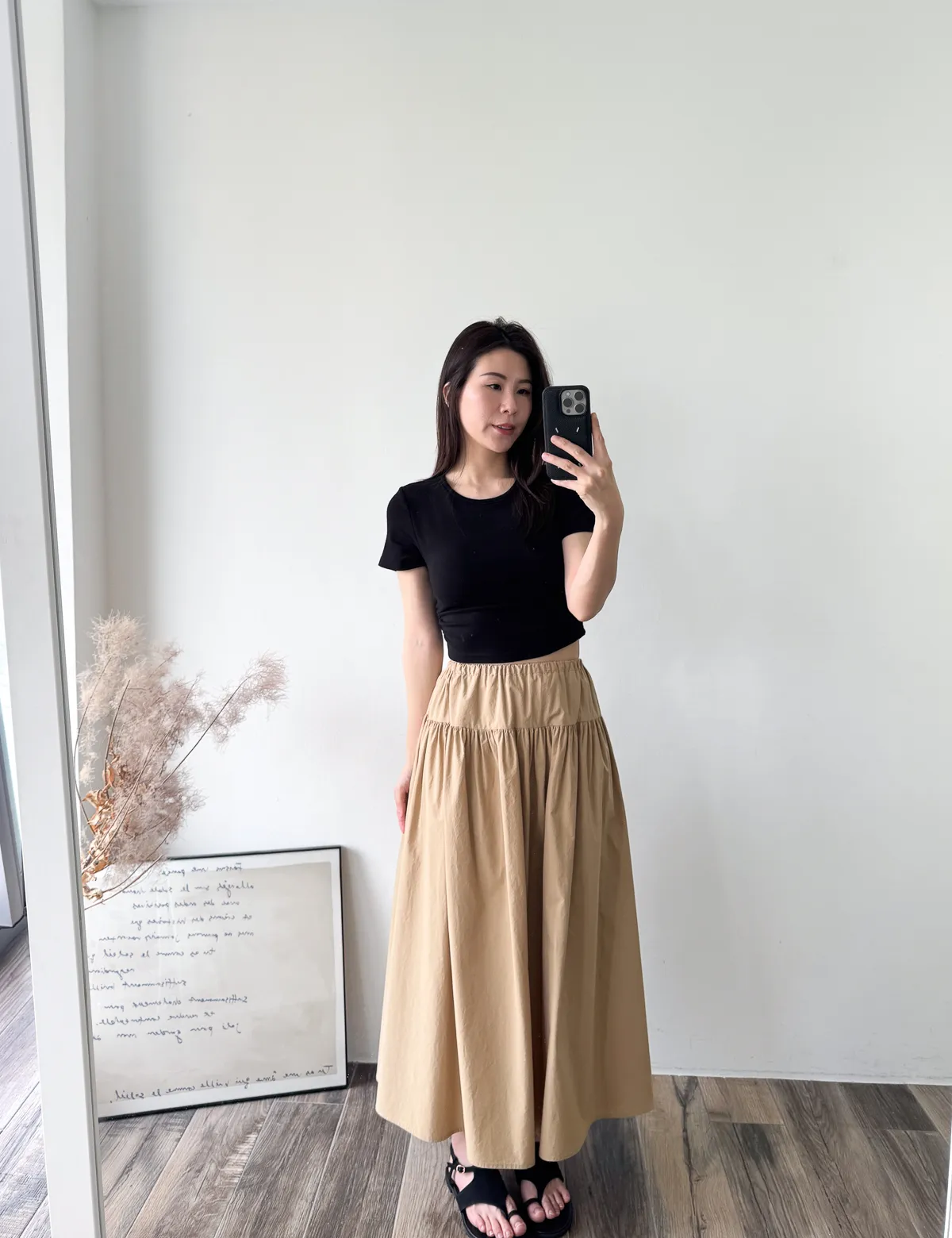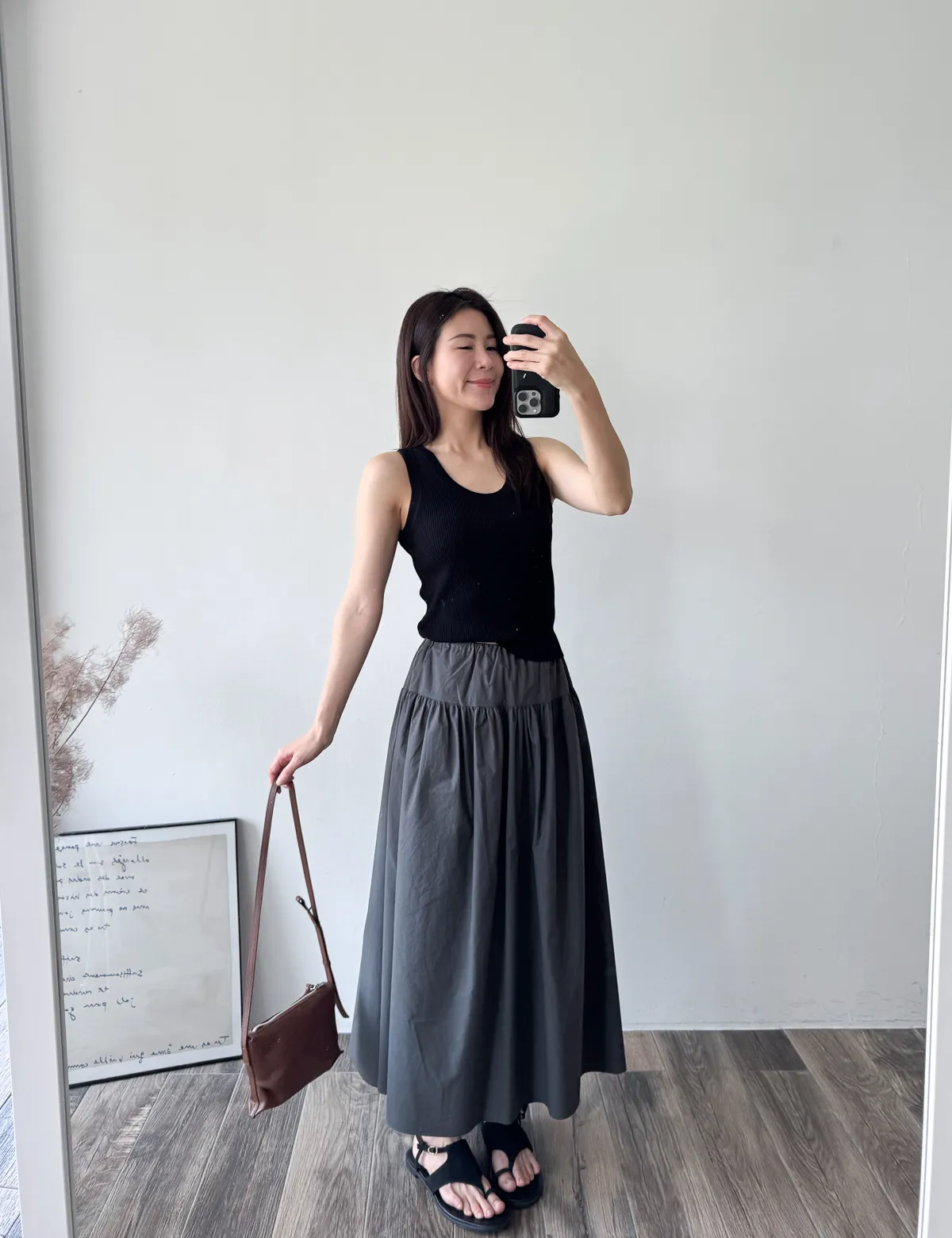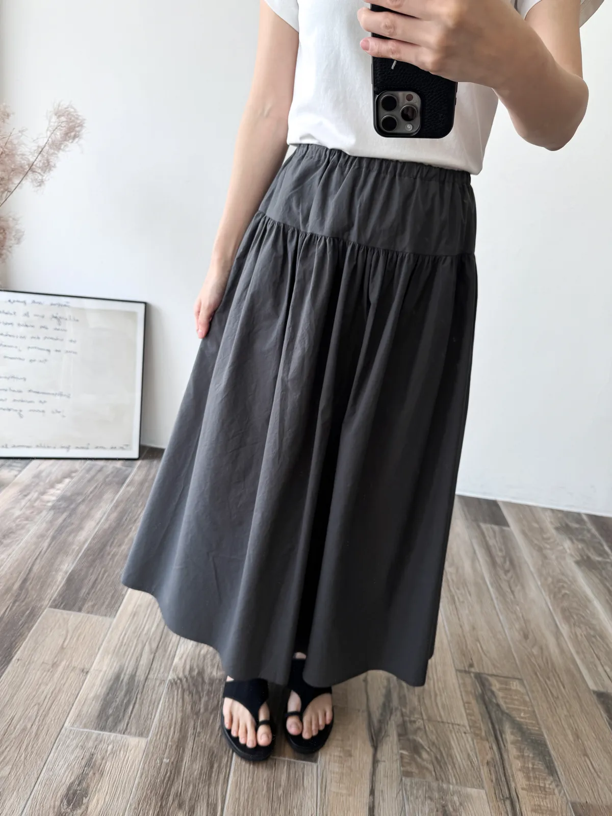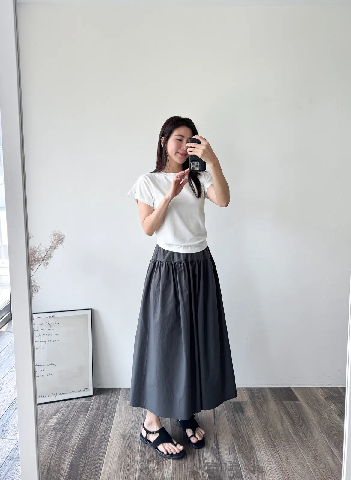 聚脂纖維 / 無彈性 /有內裡 這款好輕好薄夏天也完全沒問題的那種. 很喜歡肚子那邊多一條車線設計 讓裙子多了一點小設計感 但一樣素素的很好搭配~ 這款的抽繩是設計在背面內裡綁完後直接塞進去就可以 這樣肚子地方也不會凸凸的. Model 158/48 (腰26吋,臀35.5吋) detail//