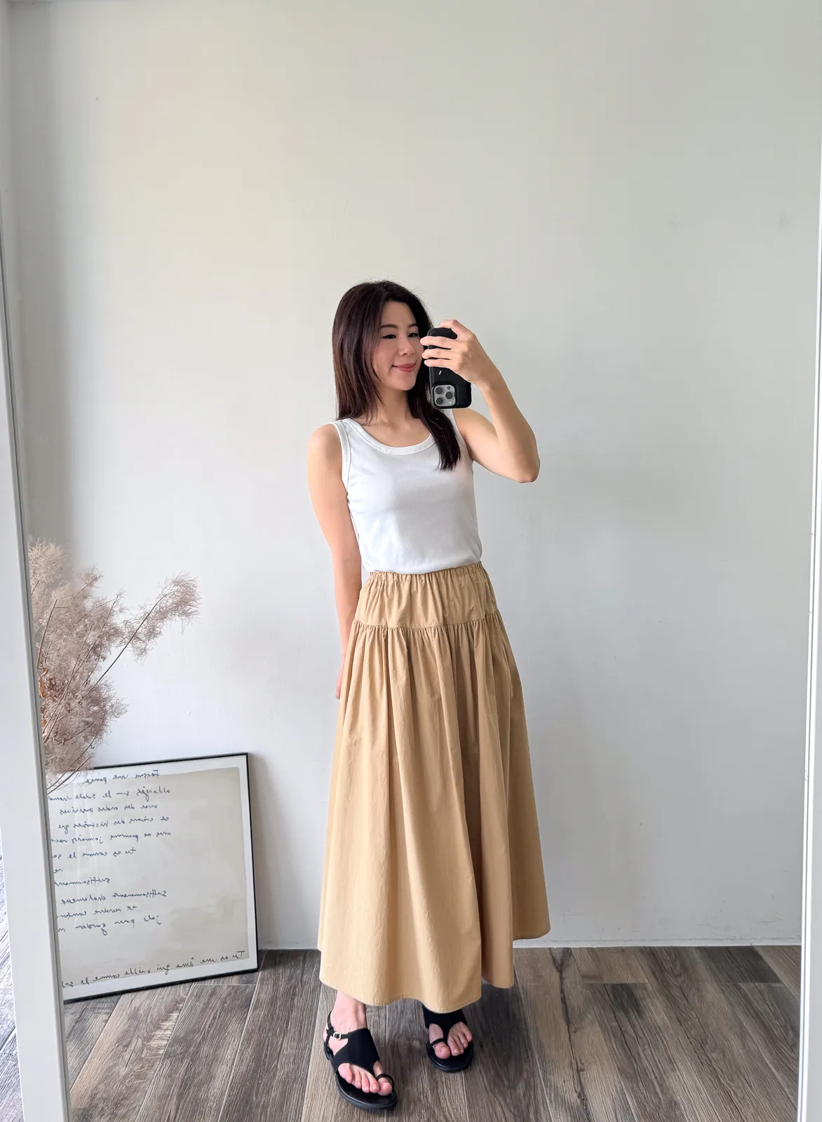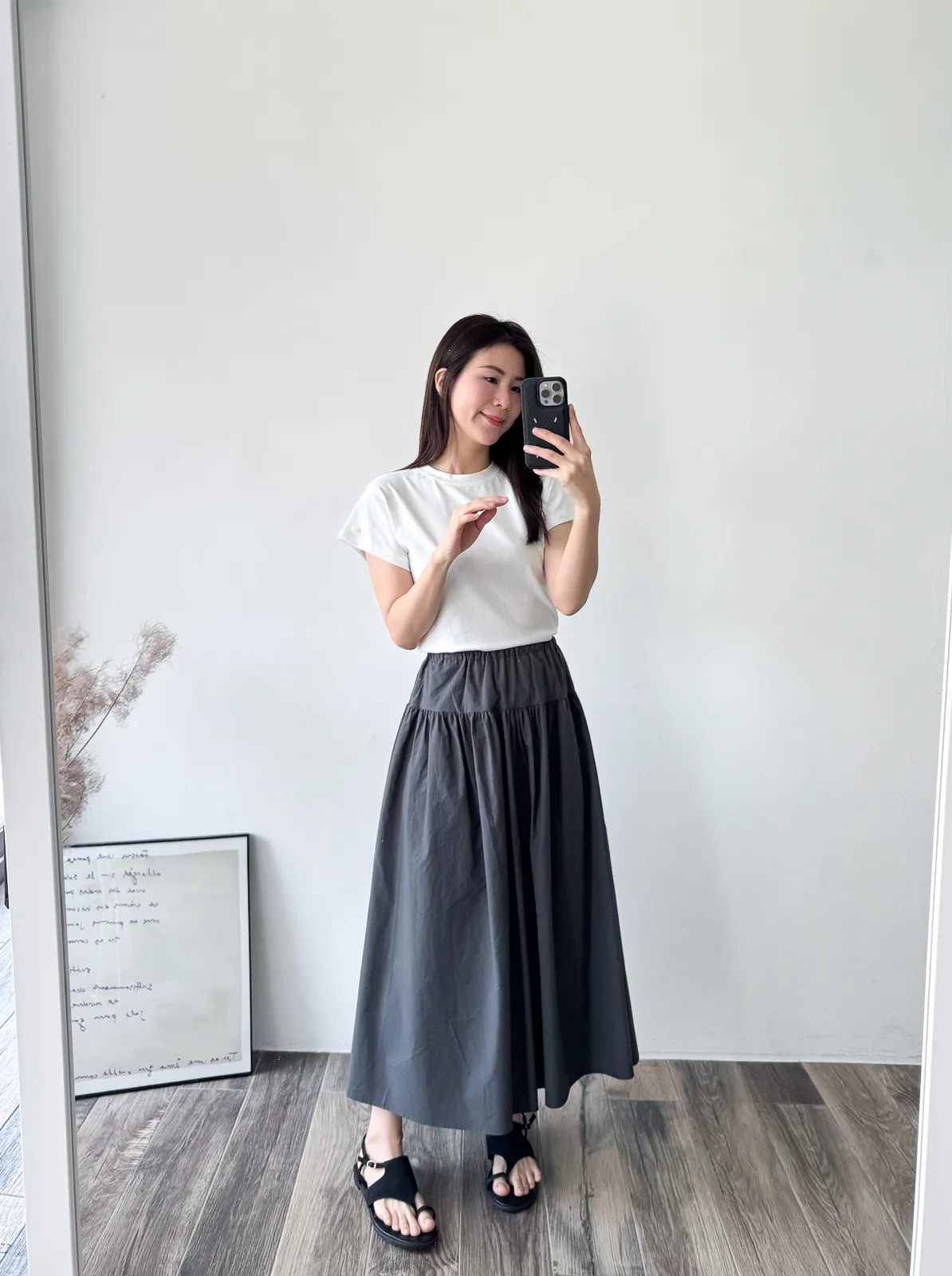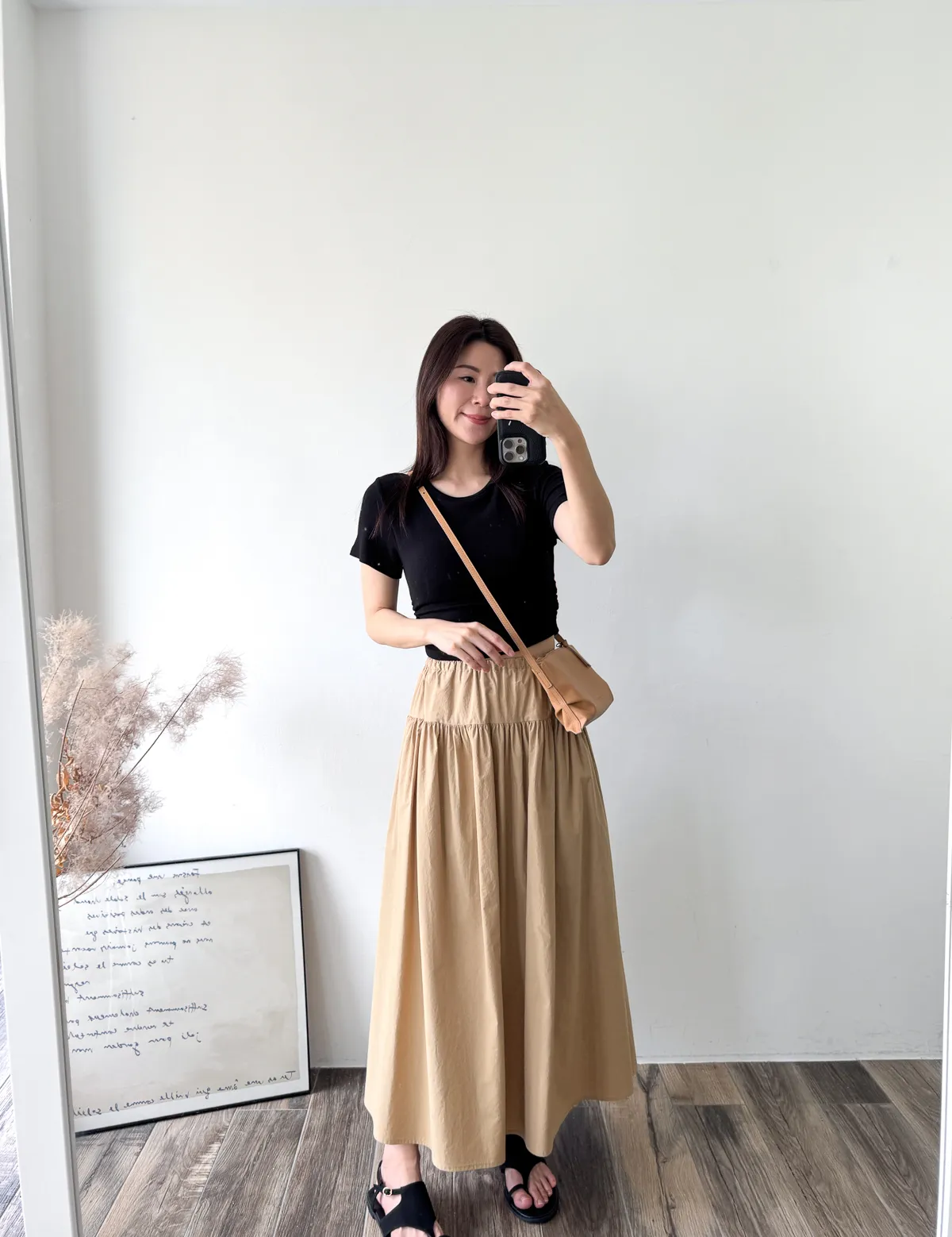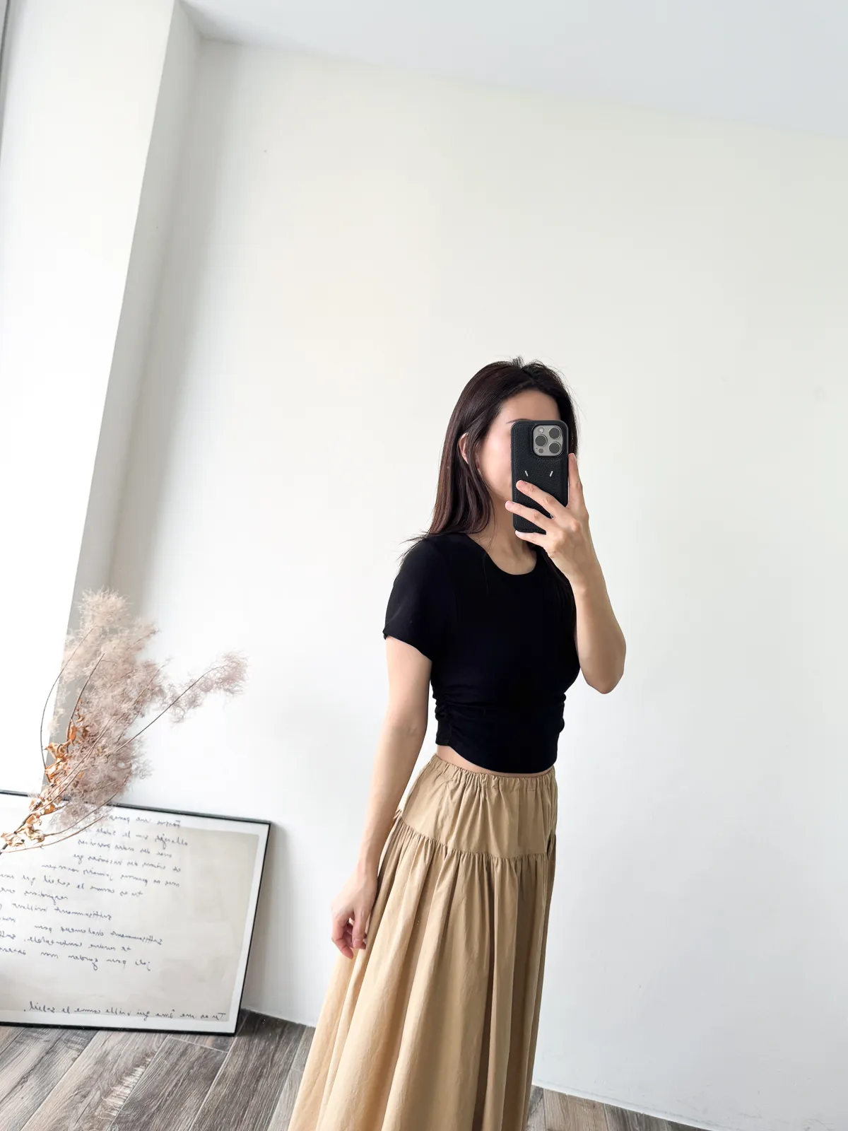 聚脂纖維 / 無彈性 /有內裡 這款好輕好薄夏天也完全沒問題的那種. 很喜歡肚子那邊多一條車線設計 讓裙子多了一點小設計感 但一樣素素的很好搭配~ 這款的抽繩是設計在背面內裡綁完後直接塞進去就可以 這樣肚子地方也不會凸凸的. Model 158/48 (腰26吋,臀35.5吋) detail//