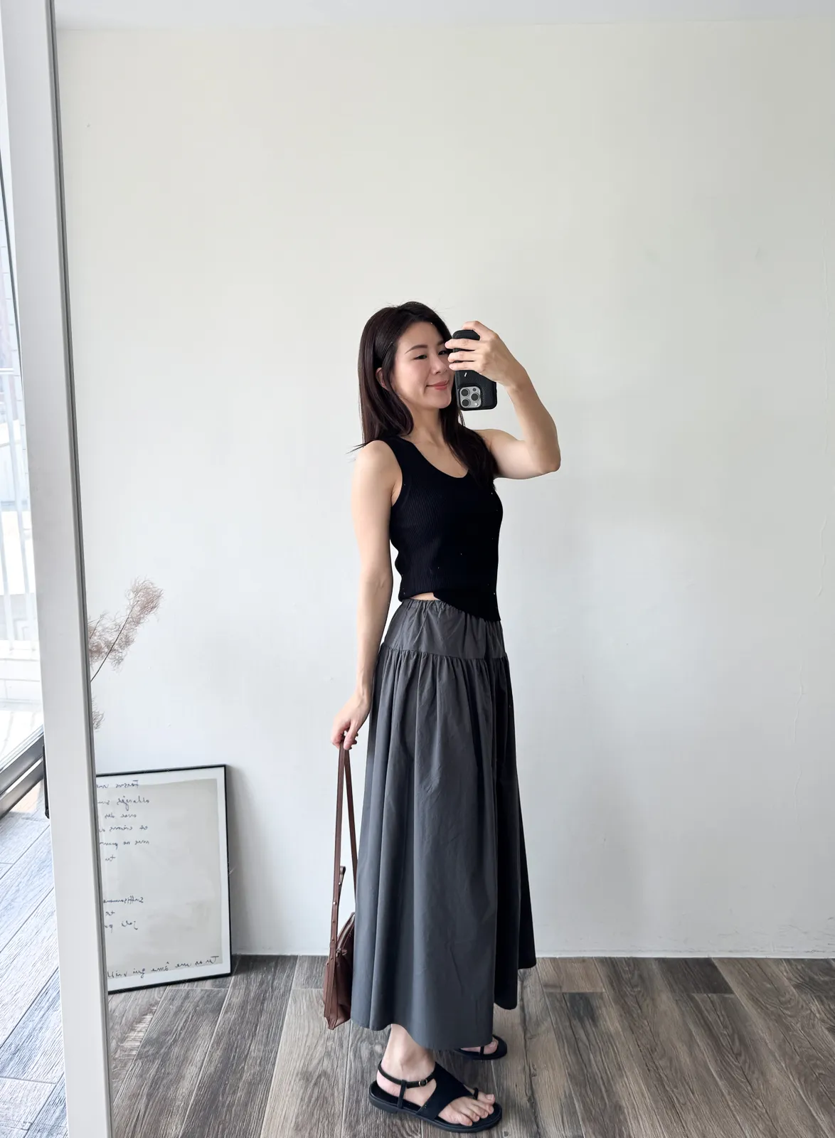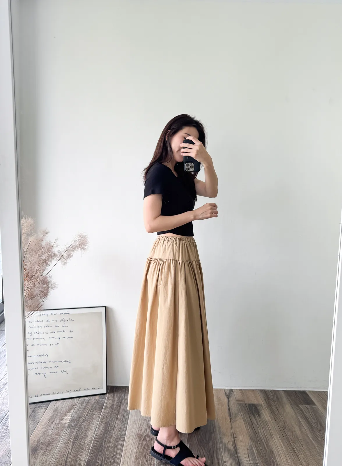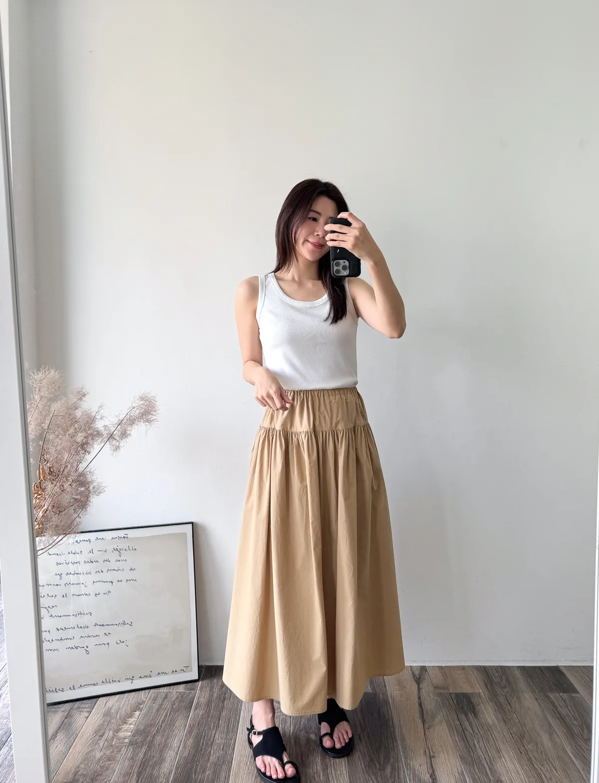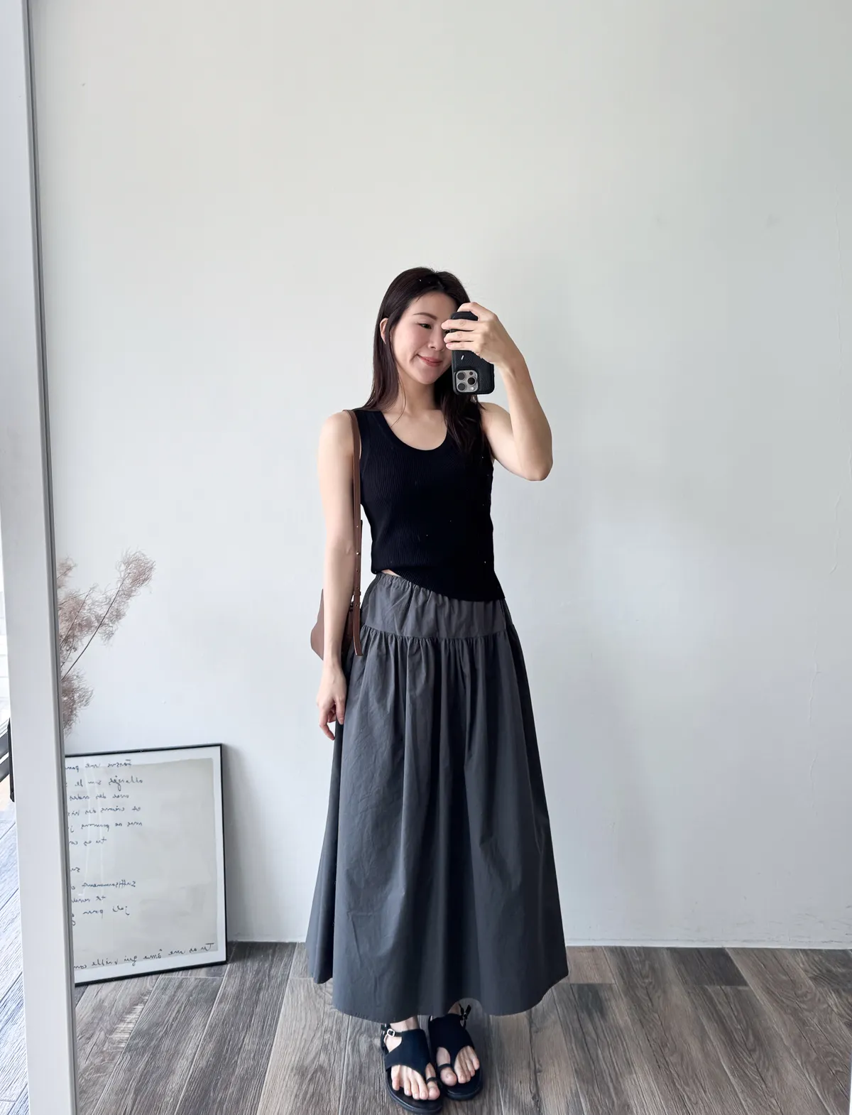 聚脂纖維 / 無彈性 /有內裡 這款好輕好薄夏天也完全沒問題的那種. 很喜歡肚子那邊多一條車線設計 讓裙子多了一點小設計感 但一樣素素的很好搭配~ 這款的抽繩是設計在背面內裡綁完後直接塞進去就可以 這樣肚子地方也不會凸凸的. Model 158/48 (腰26吋,臀35.5吋) detail//
