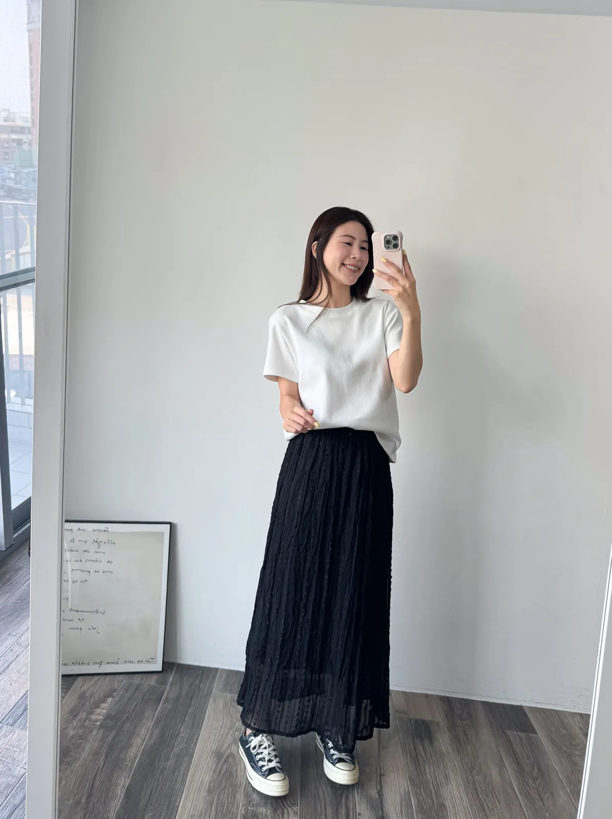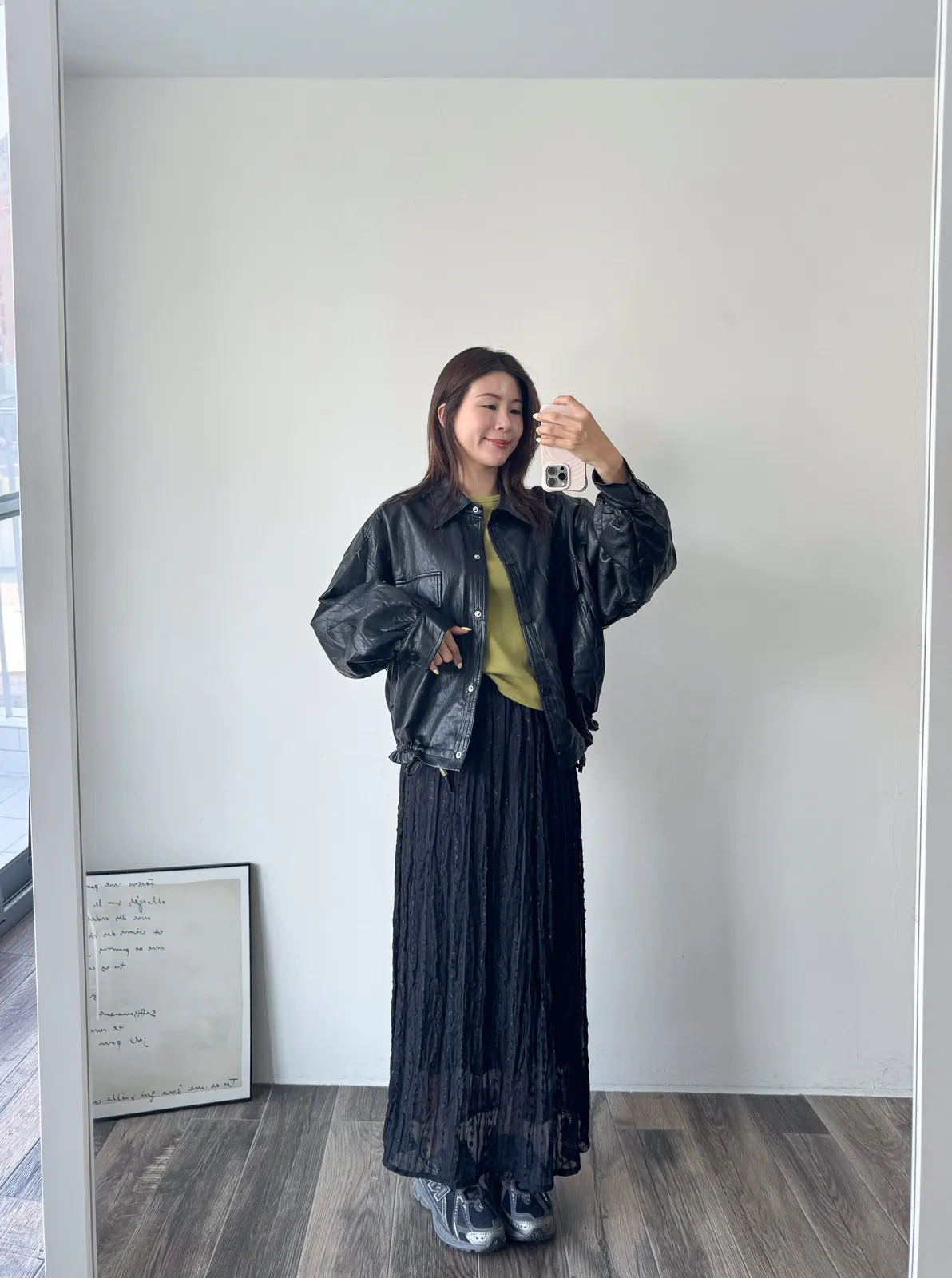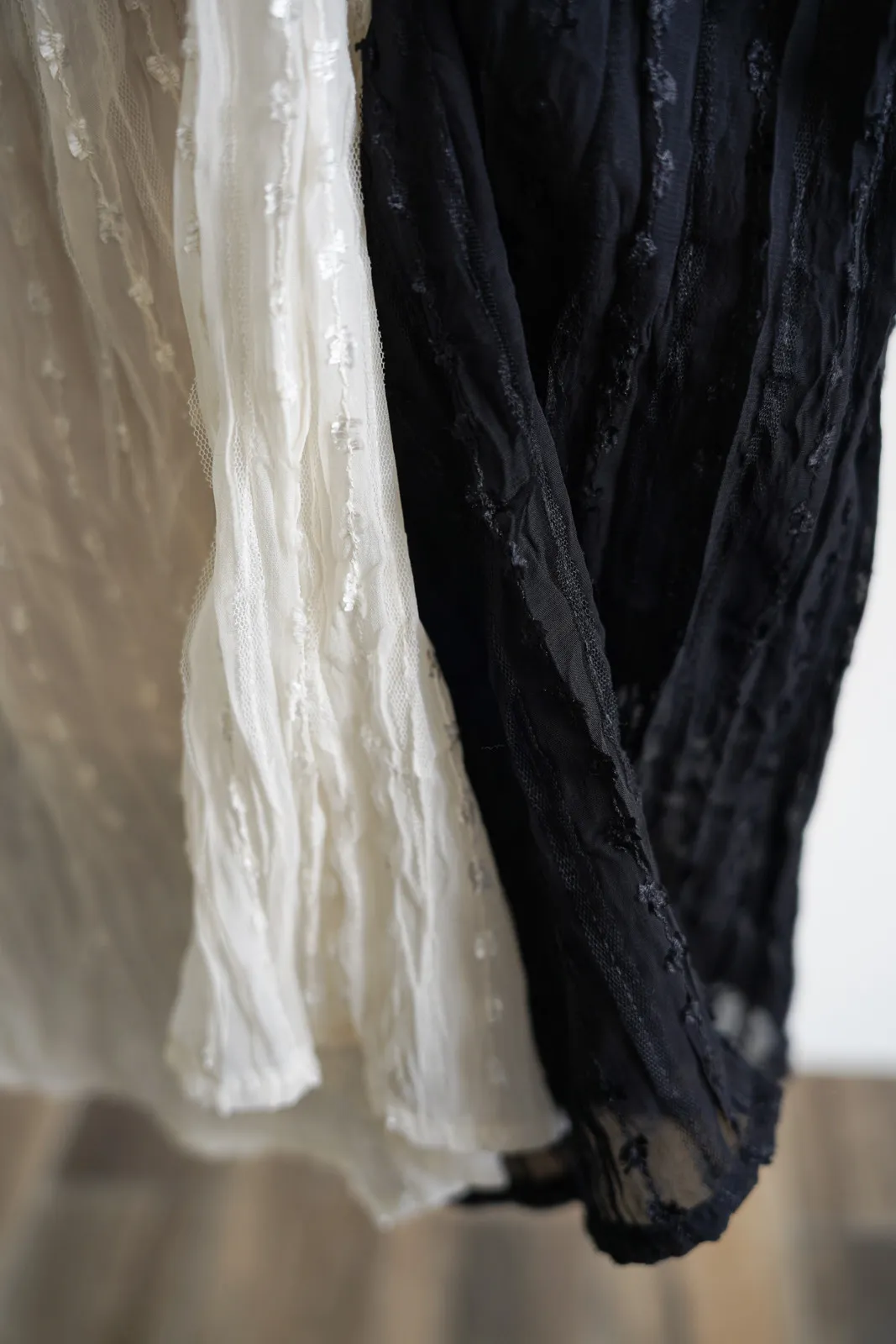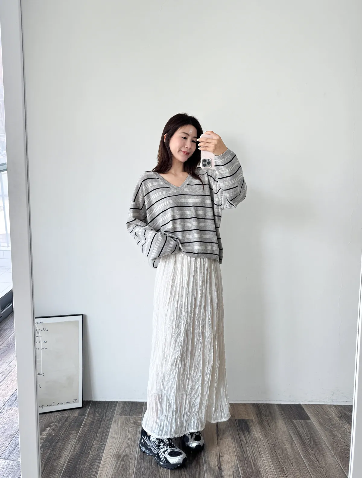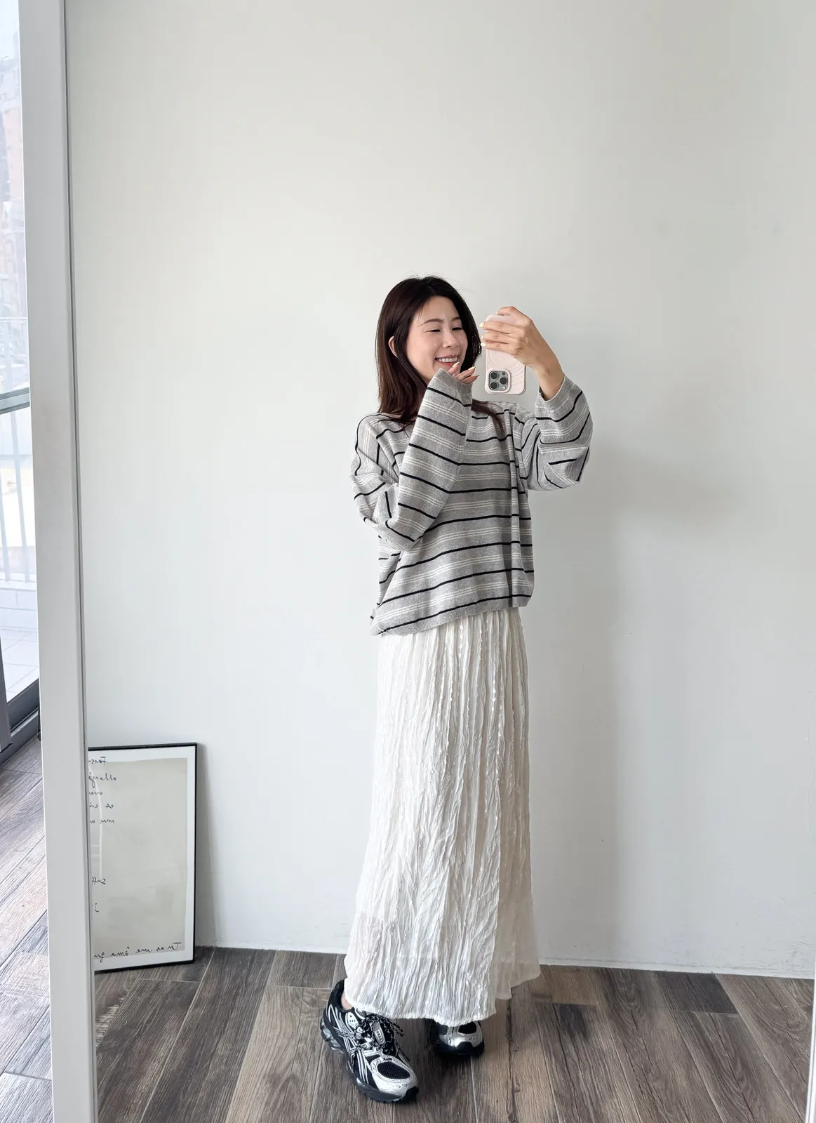 雪紡紗 / 有內裏 / 有彈性 這款也大推~ 喜歡女孩一點可以入手這款! 近看布料才可以看出共有三種不同材質組合而成 底部是素面細雪紡紗拼接粗紗的直線條紋 最後點點部分其實是帶點亮面的毛毛! 整件故意做皺皺布料穿起來莫名的很顯瘦和修飾呢~ Model 158/48 (腰25吋 臀35.5吋) detail//