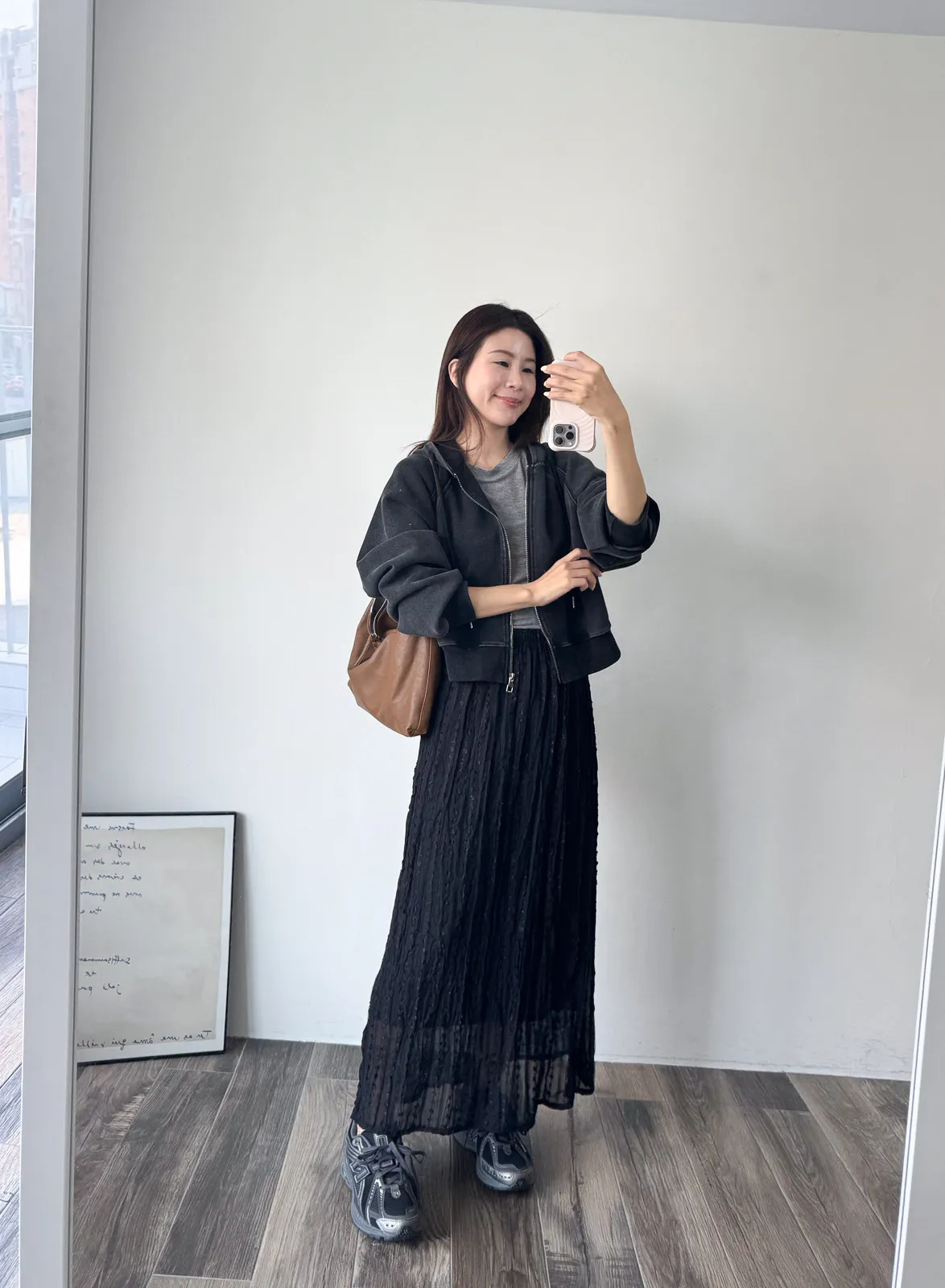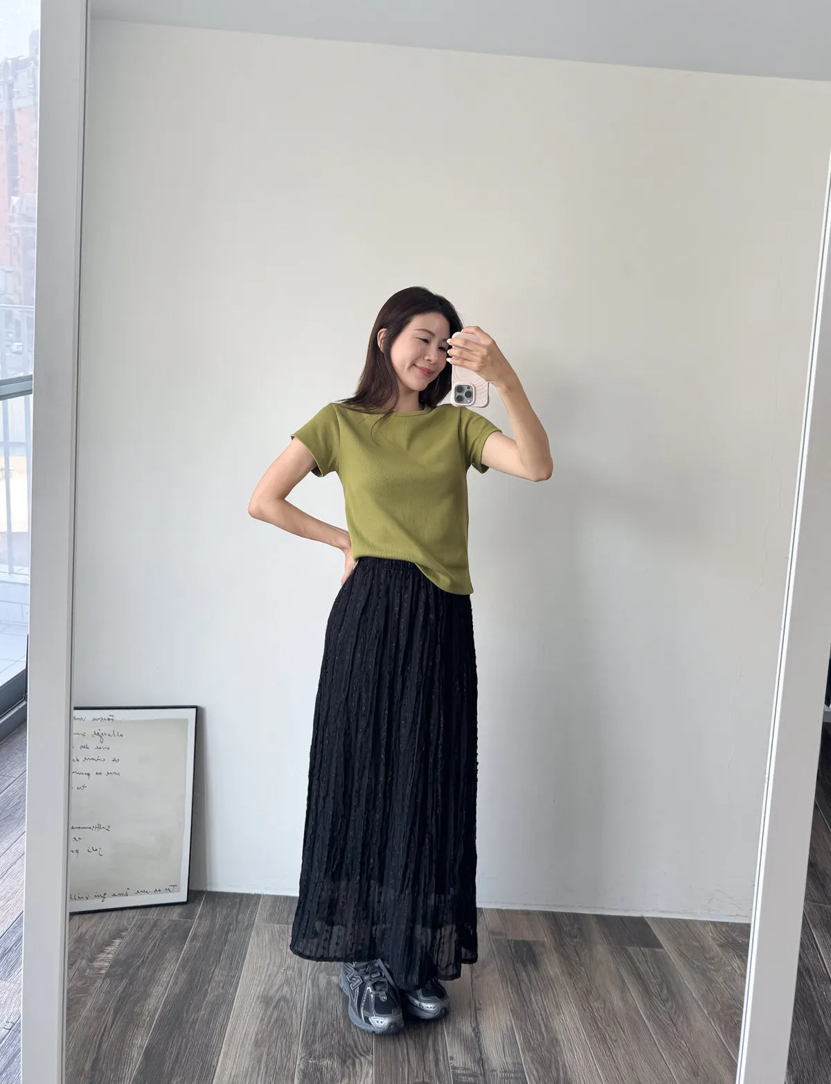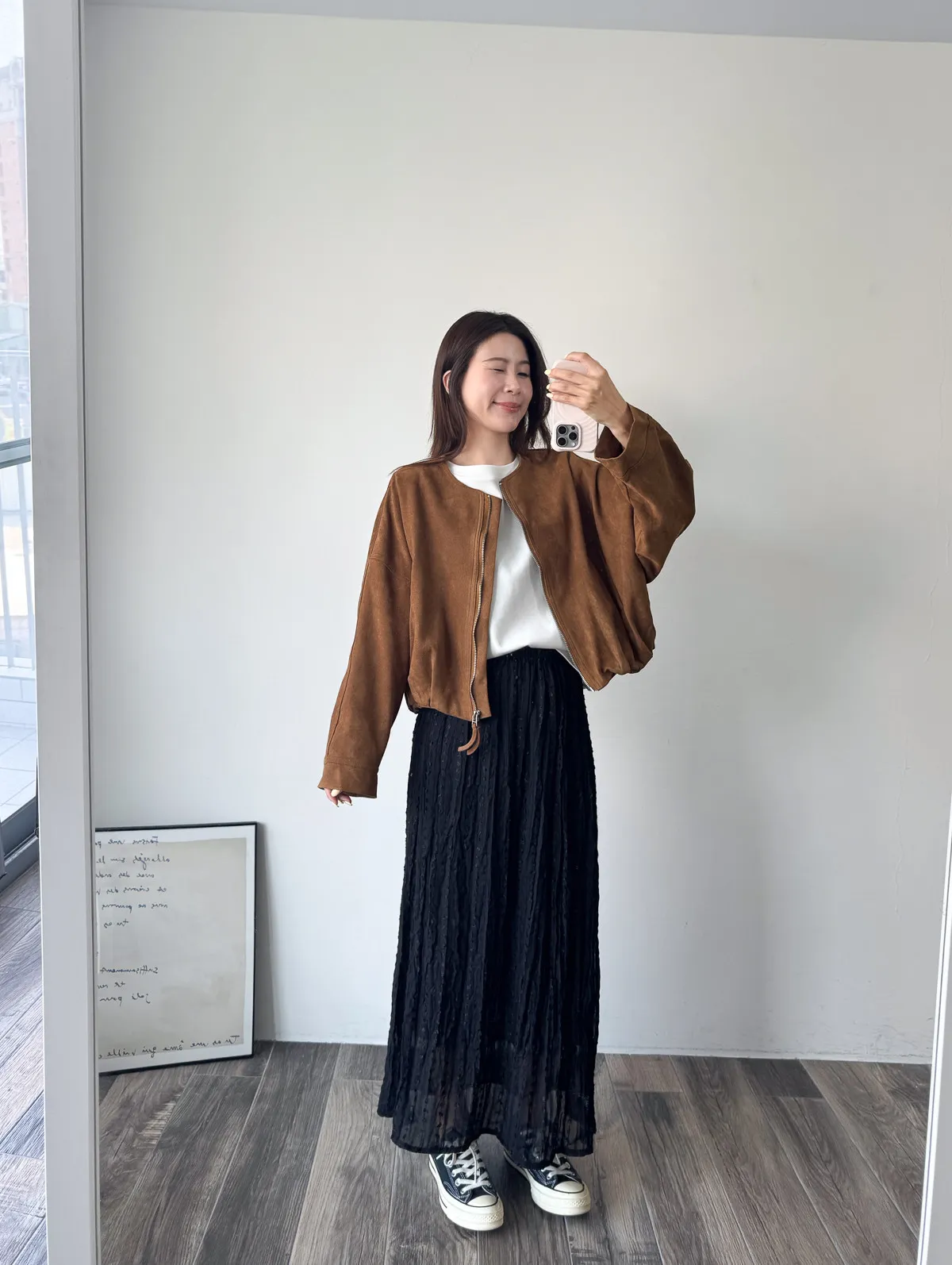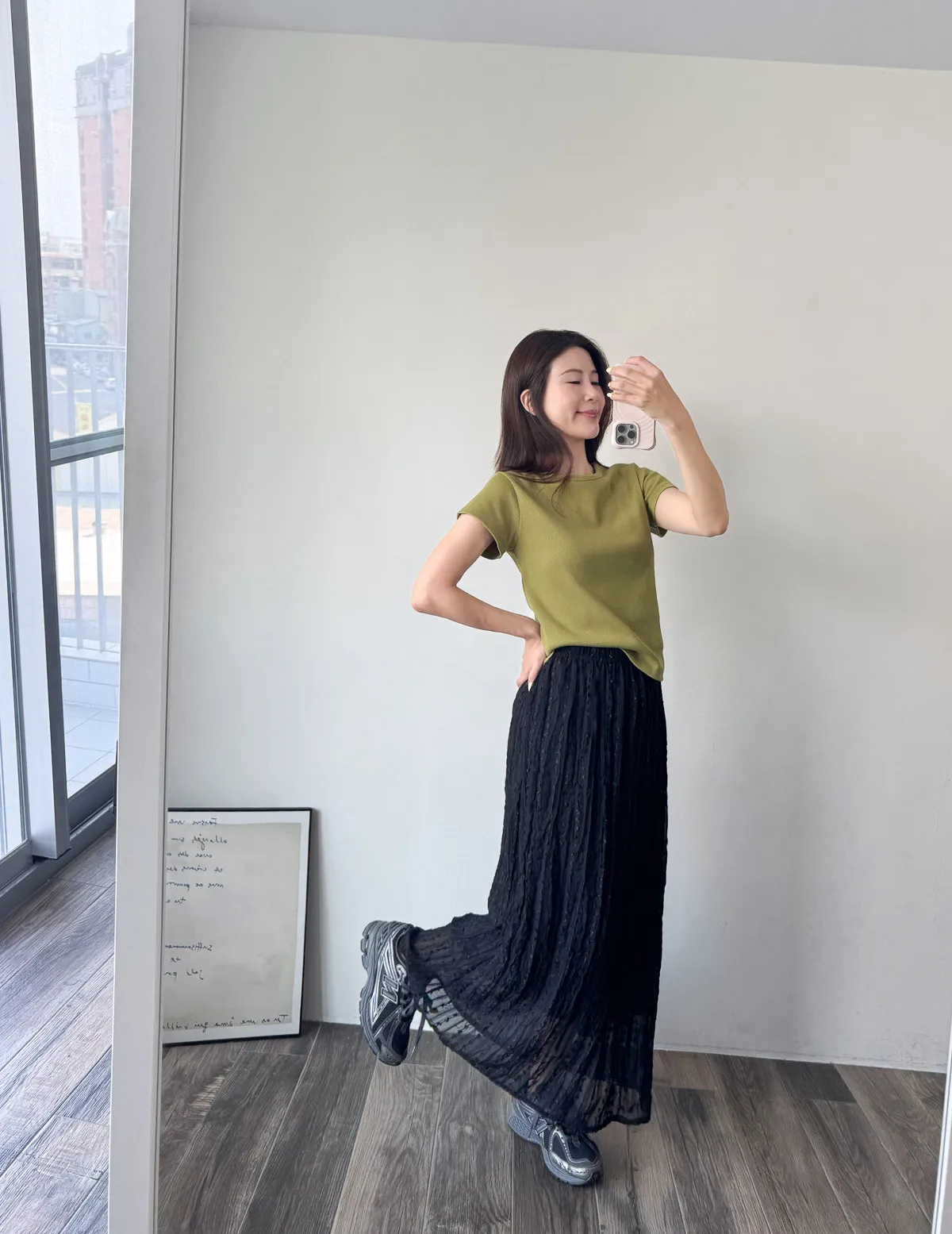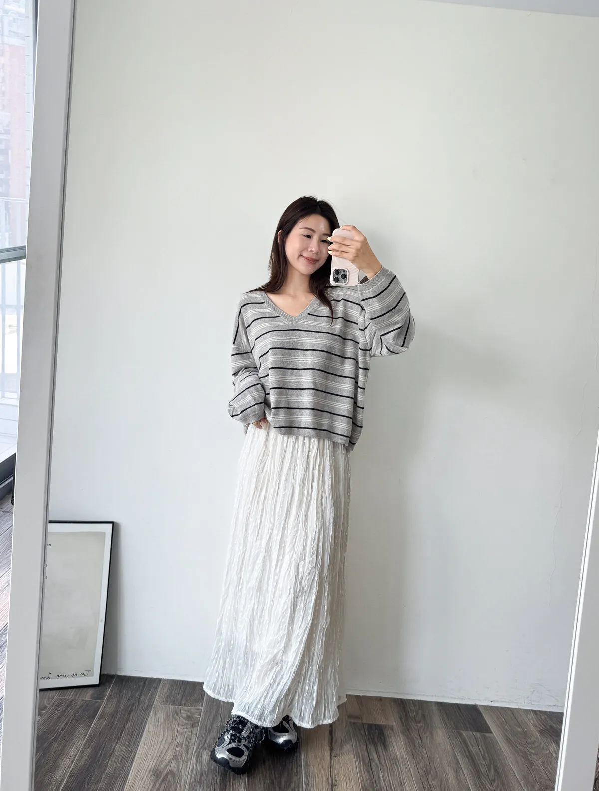 雪紡紗 / 有內裏 / 有彈性 這款也大推~ 喜歡女孩一點可以入手這款! 近看布料才可以看出共有三種不同材質組合而成 底部是素面細雪紡紗拼接粗紗的直線條紋 最後點點部分其實是帶點亮面的毛毛! 整件故意做皺皺布料穿起來莫名的很顯瘦和修飾呢~ Model 158/48 (腰25吋 臀35.5吋) detail//