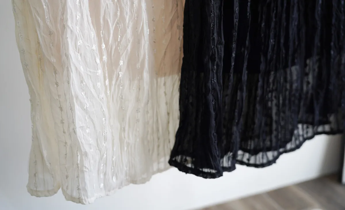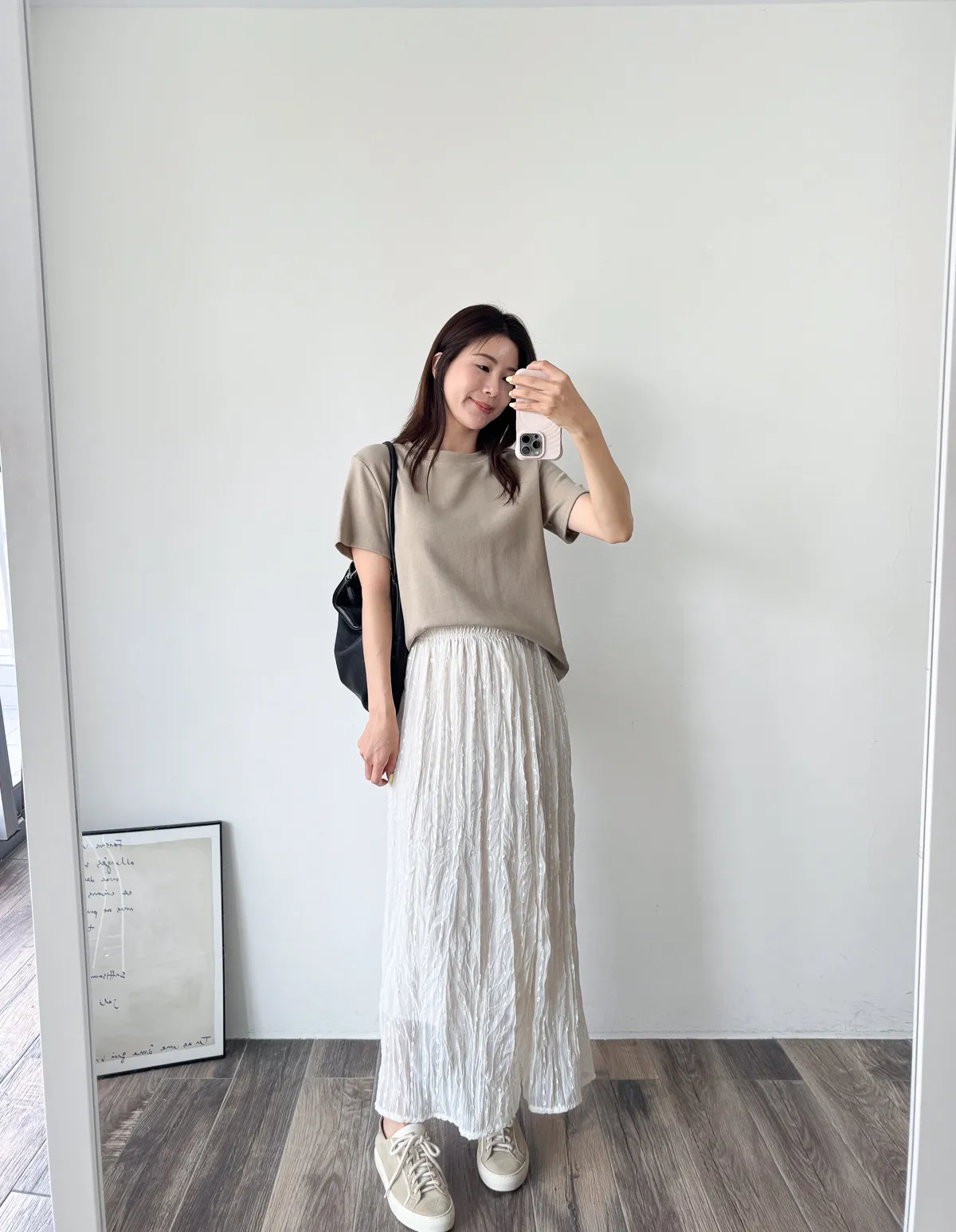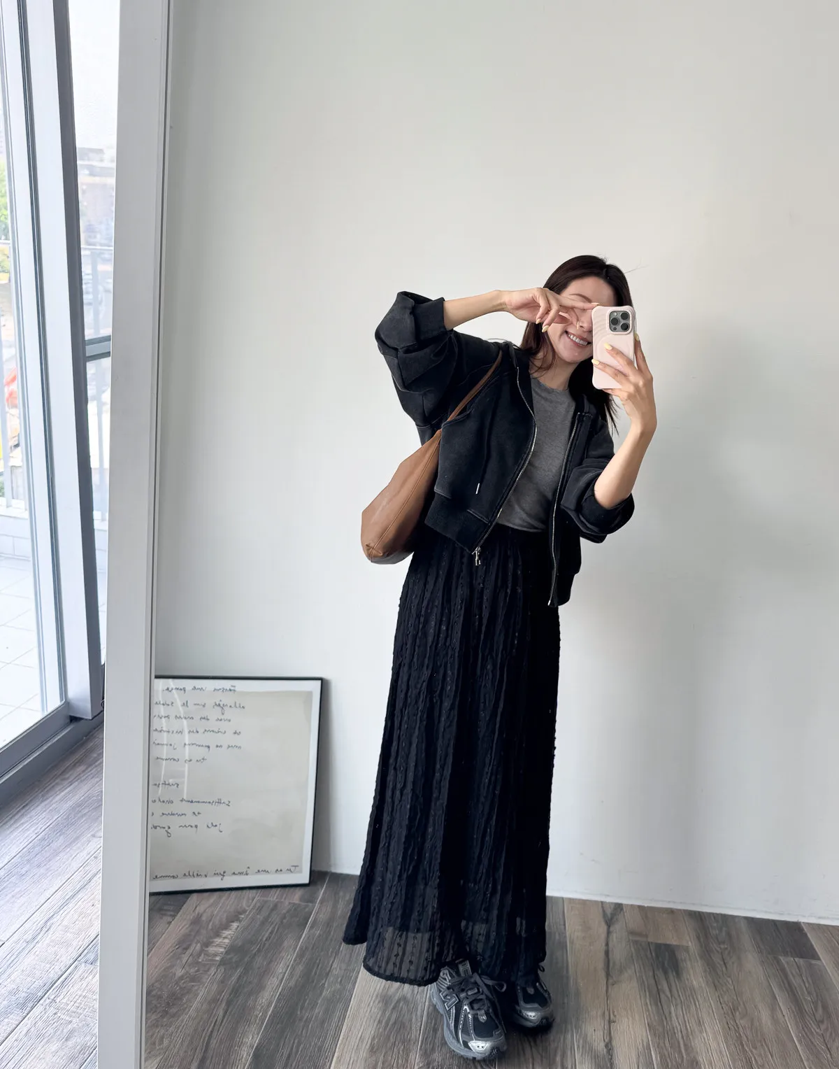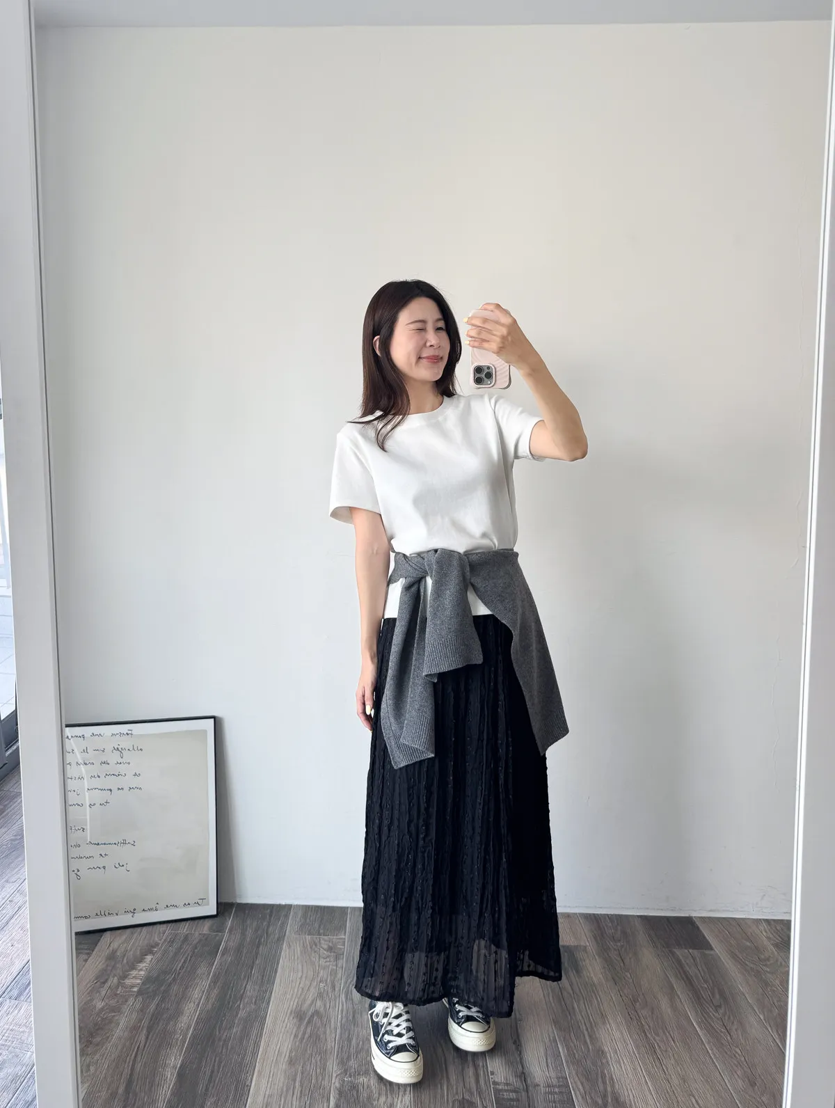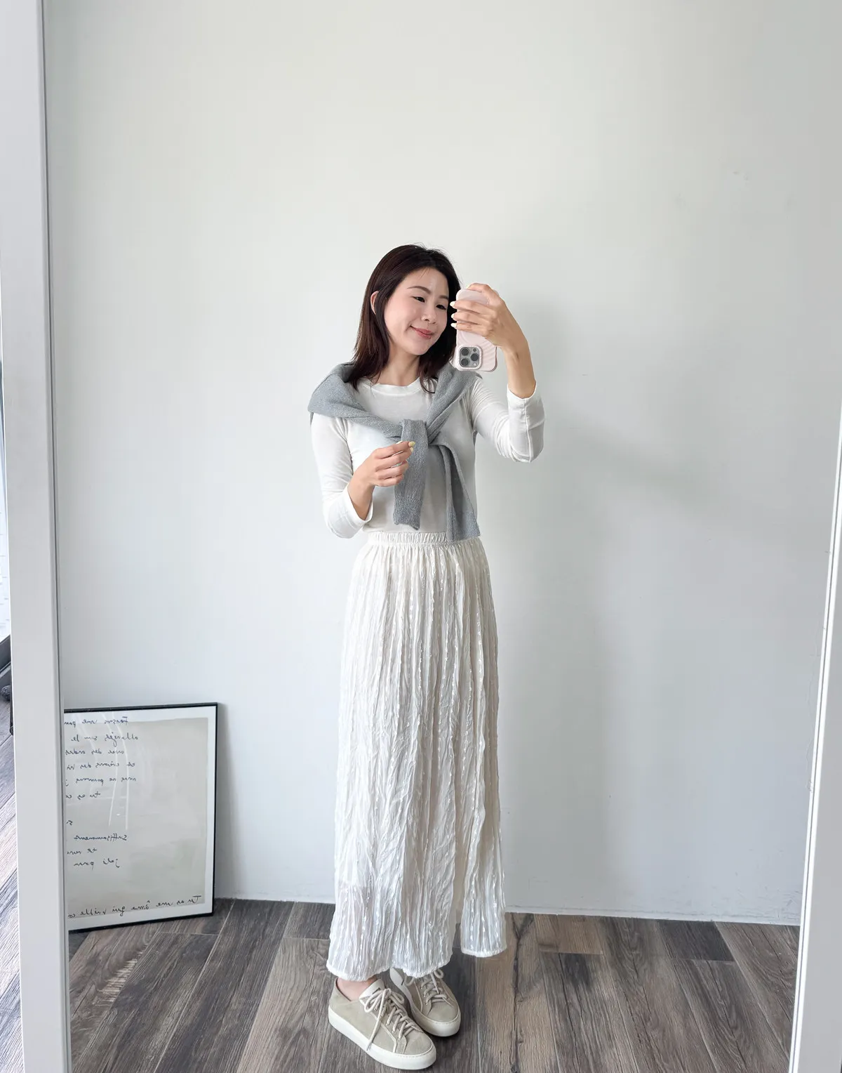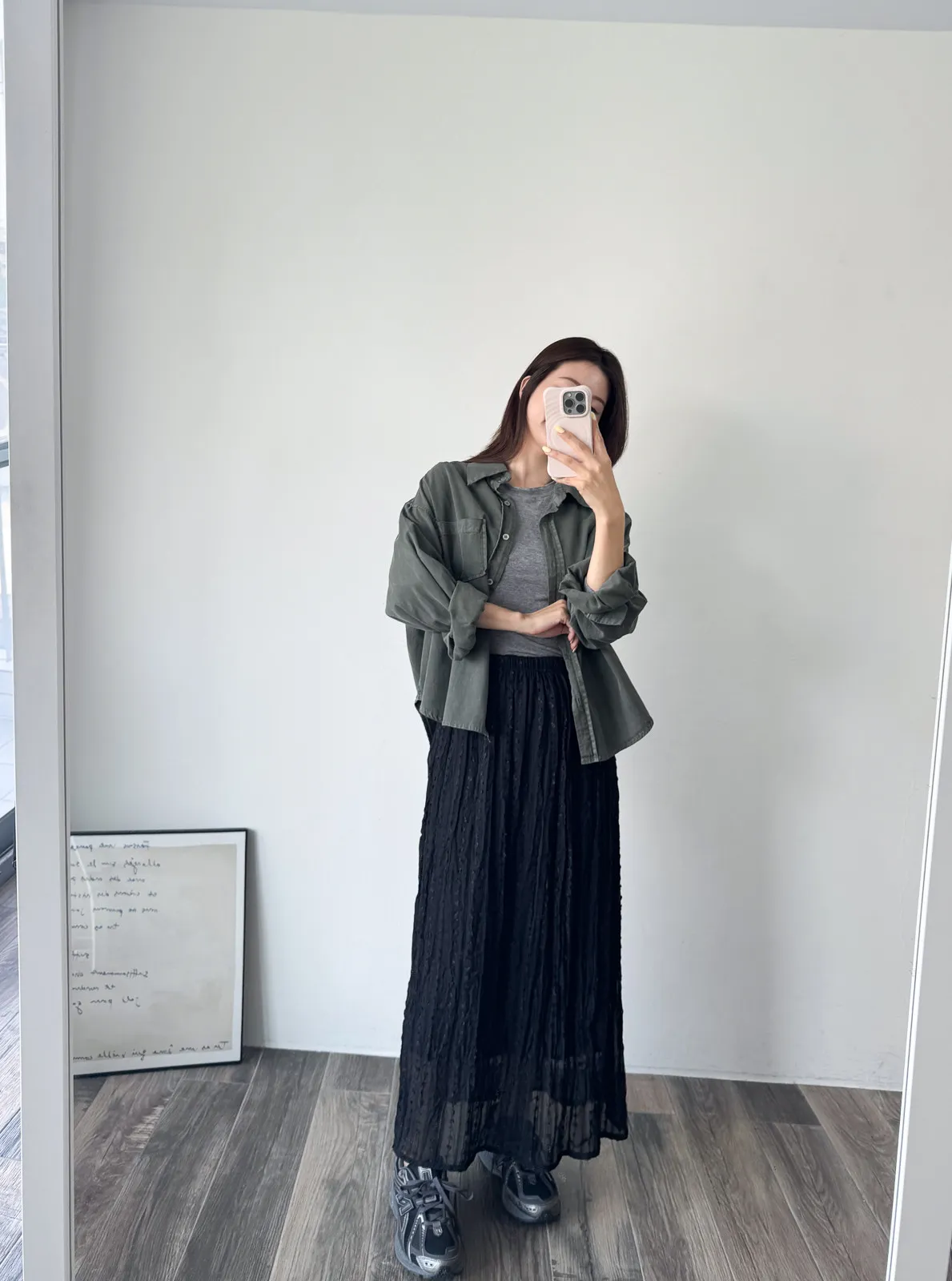 雪紡紗 / 有內裏 / 有彈性 這款也大推~ 喜歡女孩一點可以入手這款! 近看布料才可以看出共有三種不同材質組合而成 底部是素面細雪紡紗拼接粗紗的直線條紋 最後點點部分其實是帶點亮面的毛毛! 整件故意做皺皺布料穿起來莫名的很顯瘦和修飾呢~ Model 158/48 (腰25吋 臀35.5吋) detail//