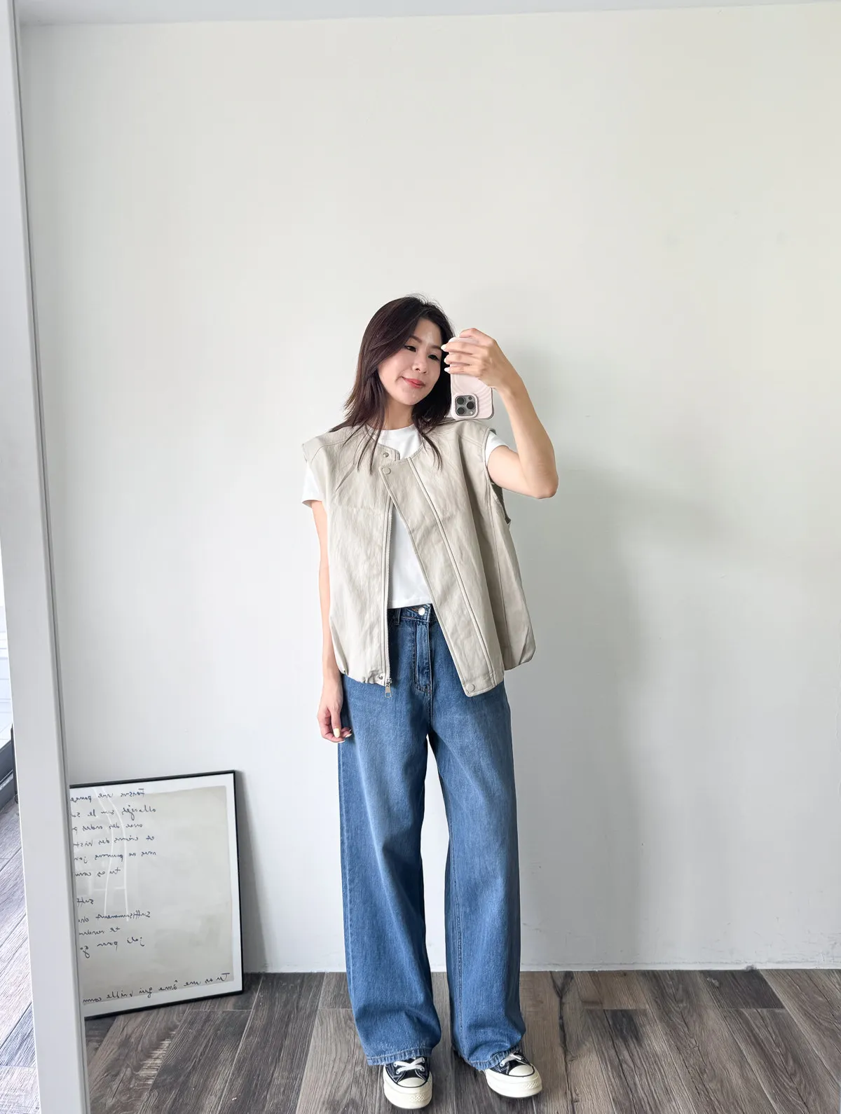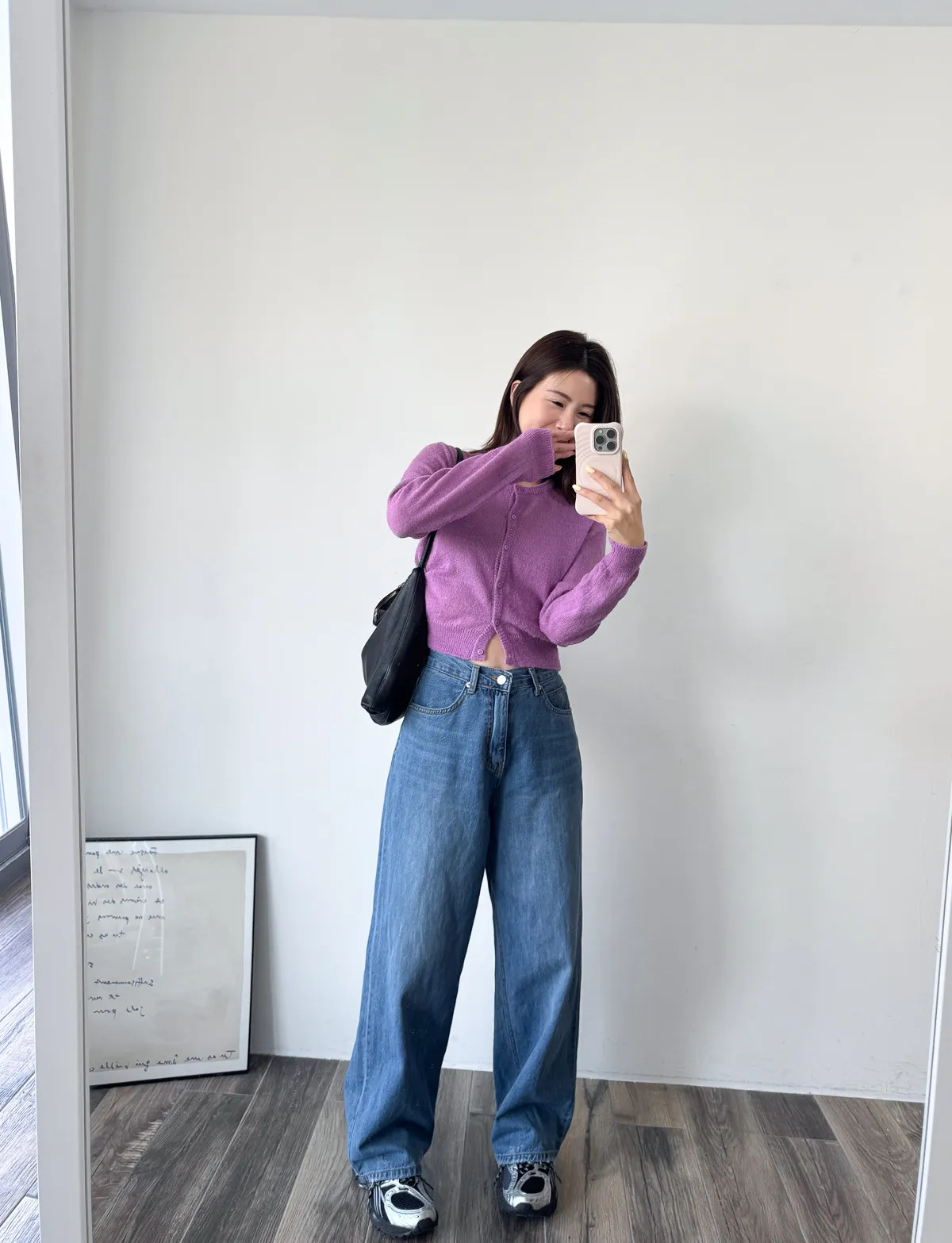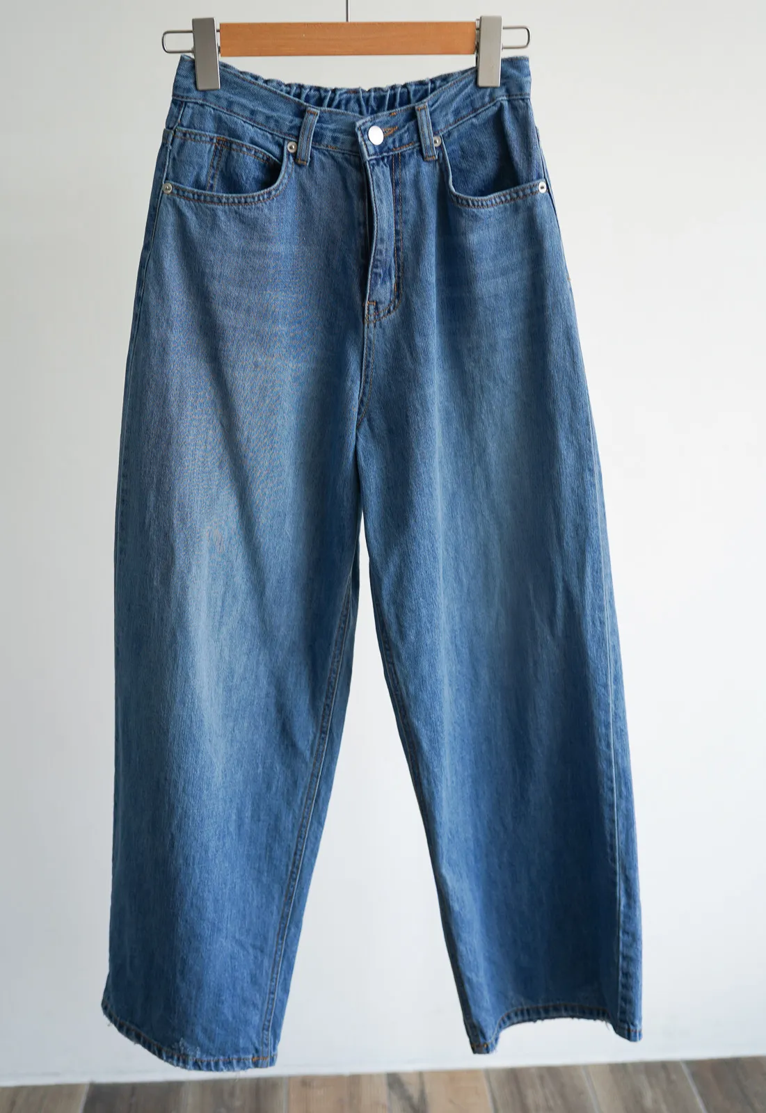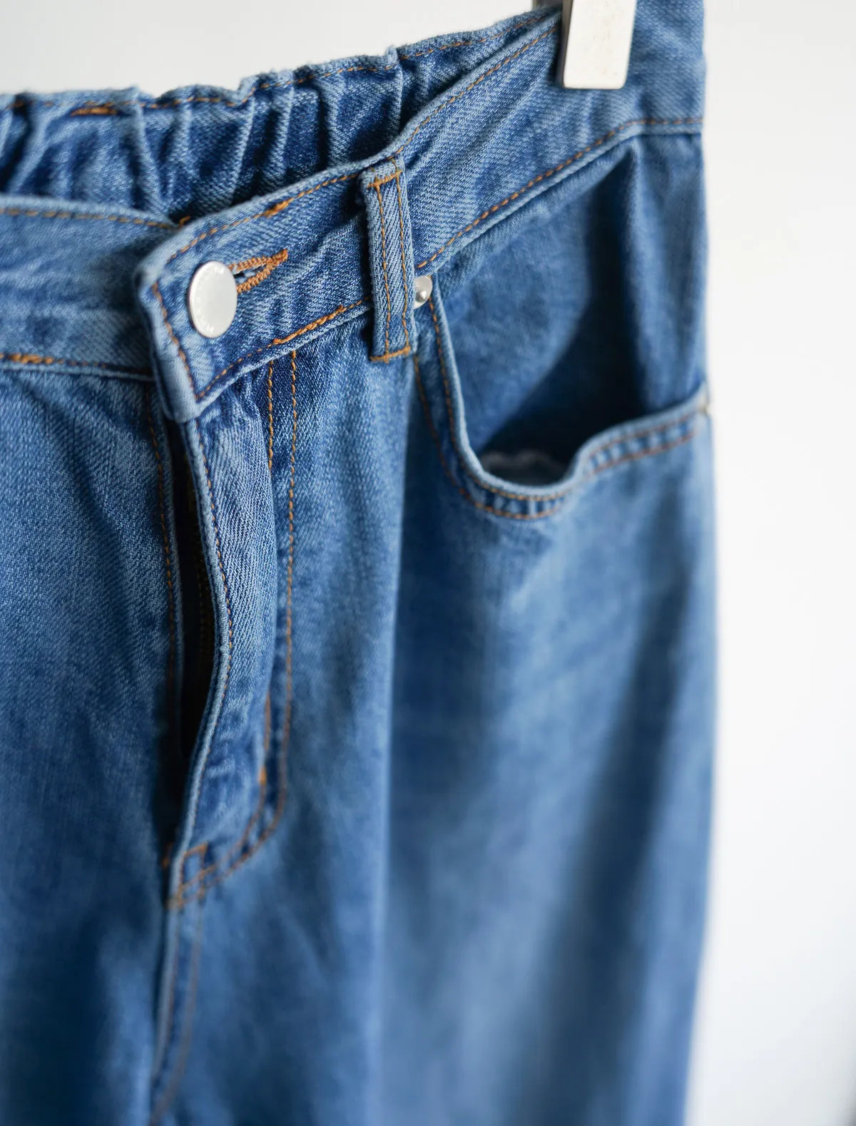 牛仔料 / 無彈性 / 後鬆緊 / 中高腰 這款穿上去就可以感覺到布料的細緻和親膚感 我自己超滿意!!! 版型整體是寬褲剪裁到褲管的地方有稍微窄一點點 高個穿九分感也很好看 我158穿落一點在鞋面兩種不同風格都很有型! Model 158/48 (腰25吋 臀35.5吋) 平常穿S,這款穿S不鬆不緊 detail//
