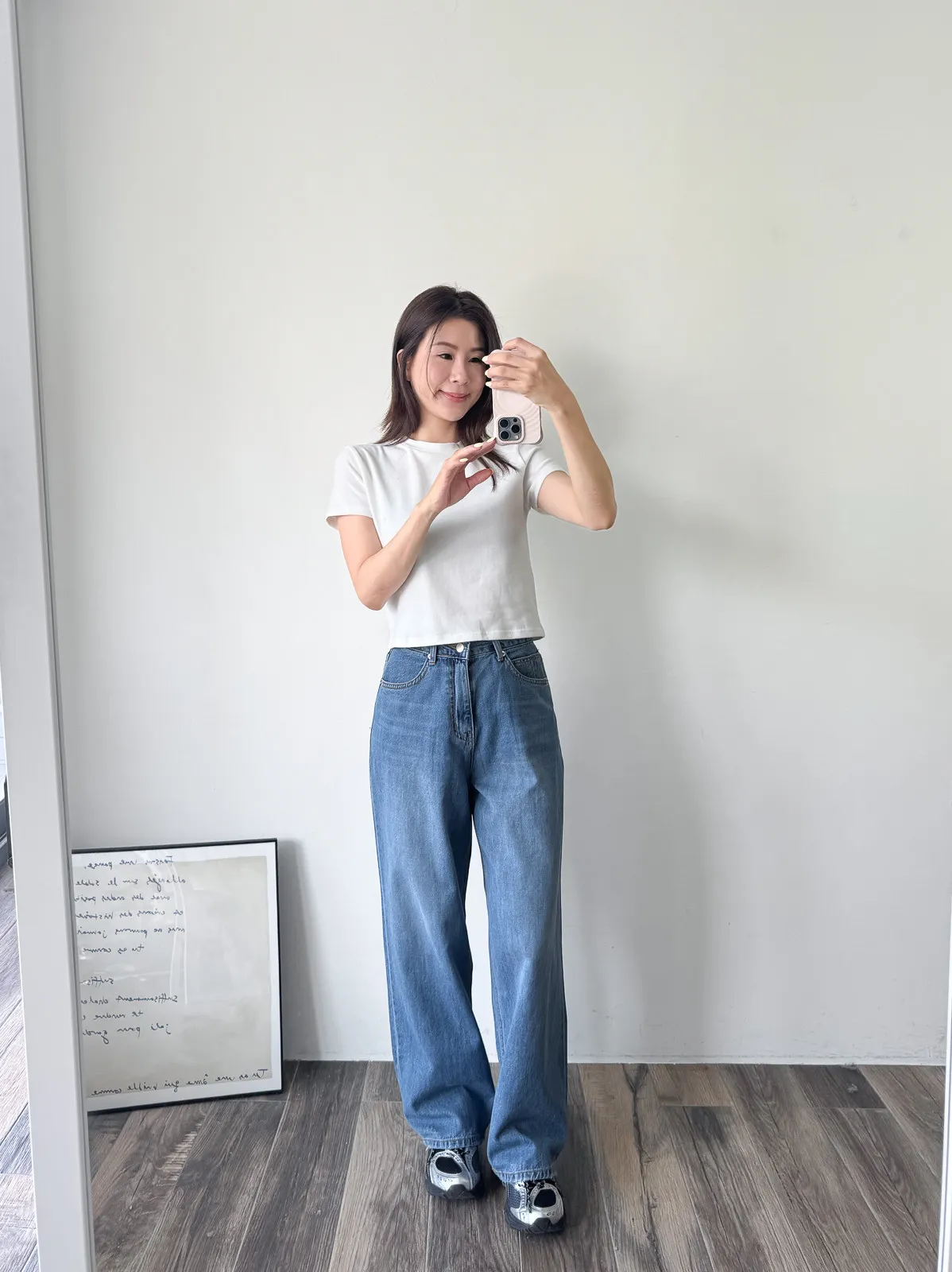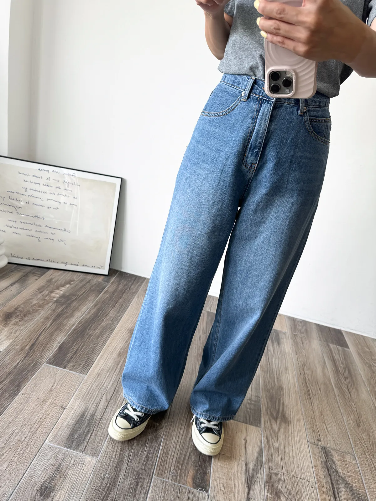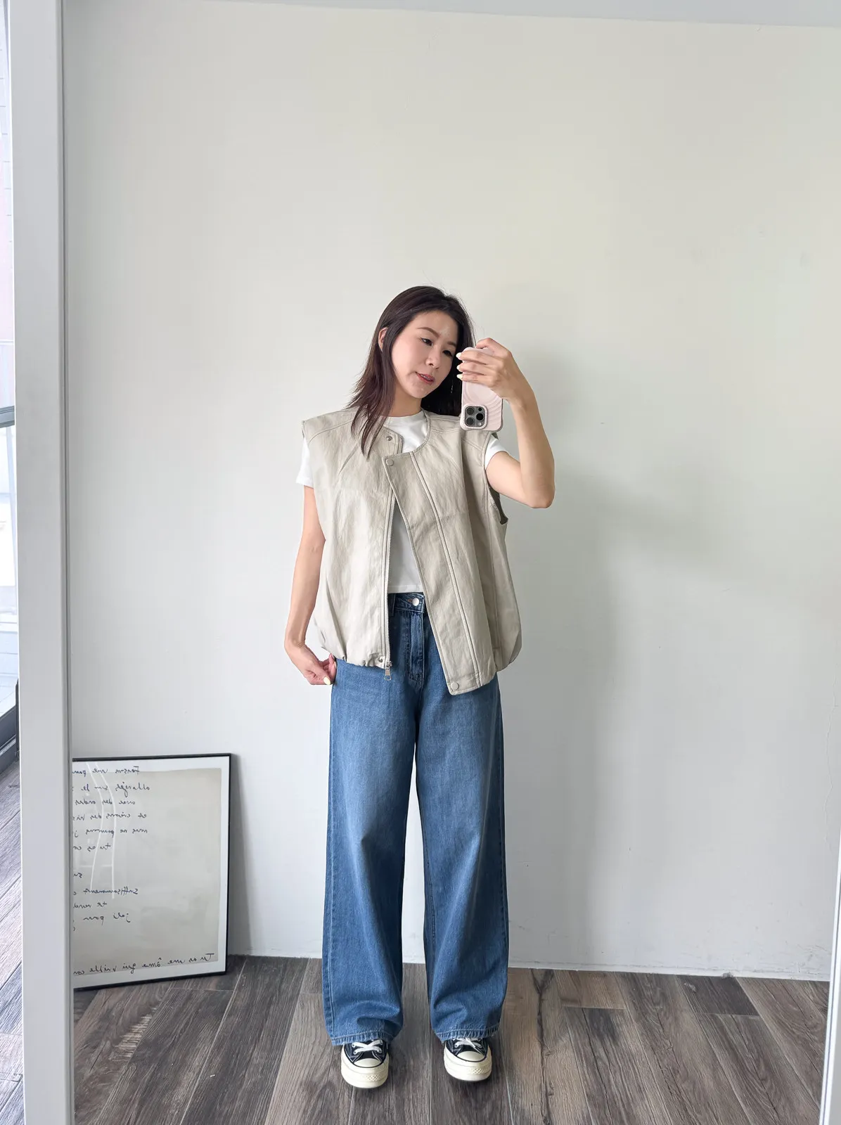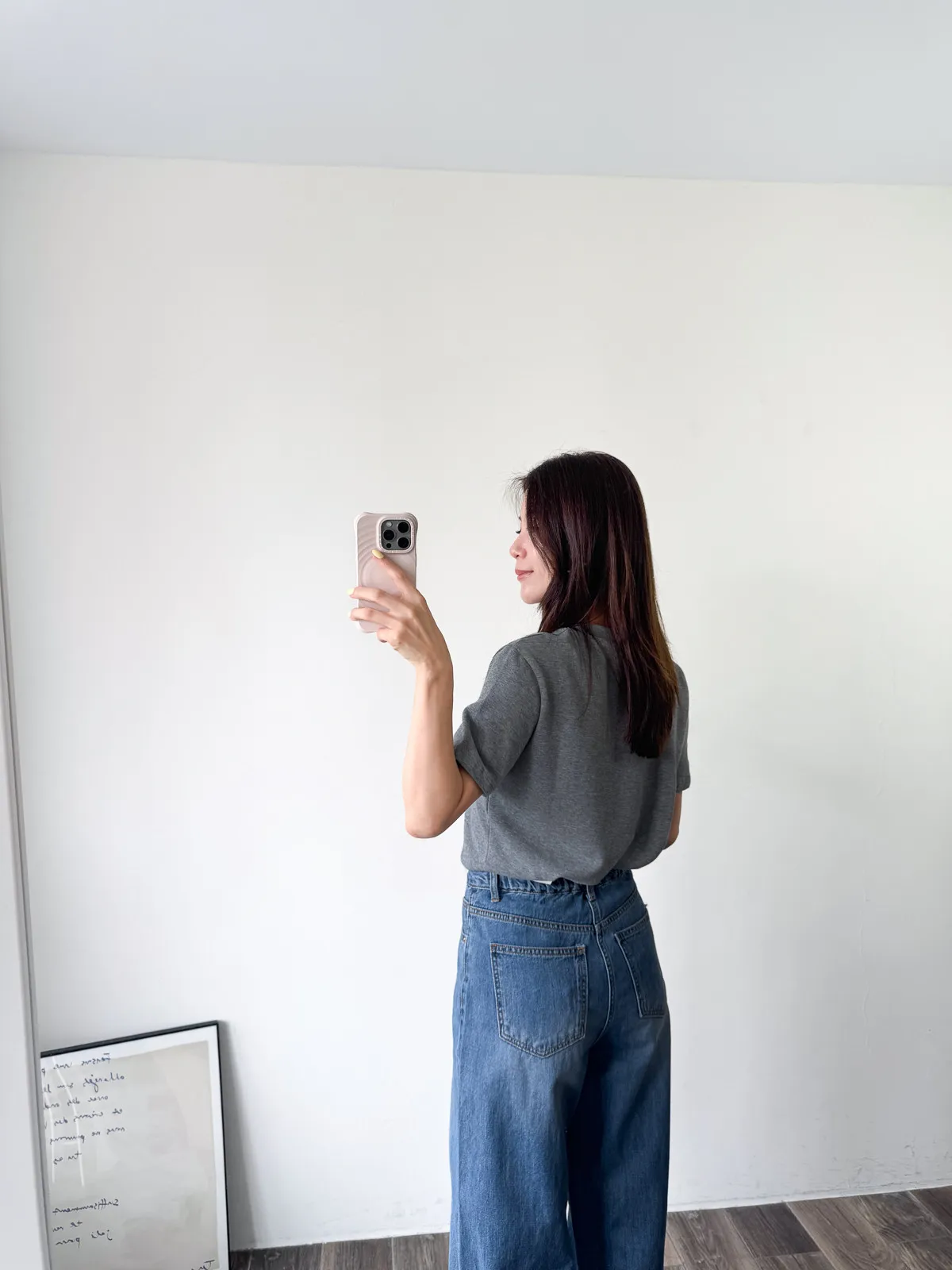牛仔料 / 無彈性 / 後鬆緊 / 中高腰 這款穿上去就可以感覺到布料的細緻和親膚感 我自己超滿意!!! 版型整體是寬褲剪裁到褲管的地方有稍微窄一點點 高個穿九分感也很好看 我158穿落一點在鞋面兩種不同風格都很有型! Model 158/48 (腰25吋 臀35.5吋) 平常穿S,這款穿S不鬆不緊 detail//