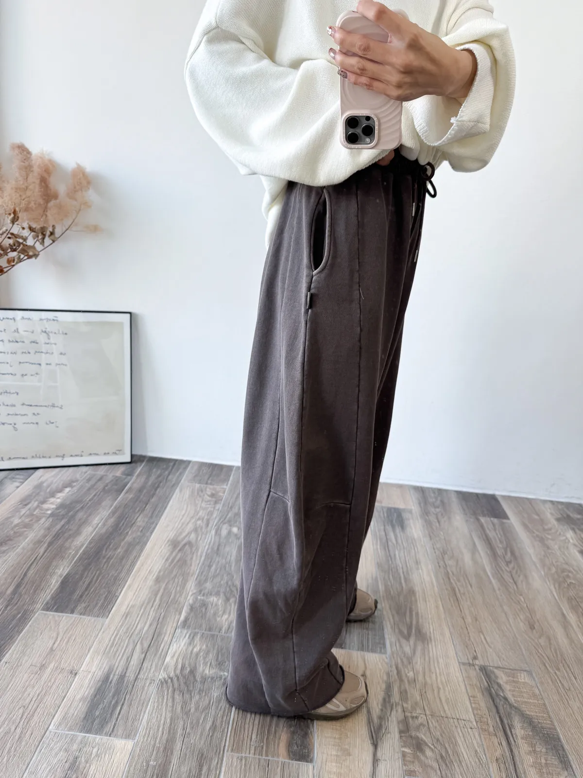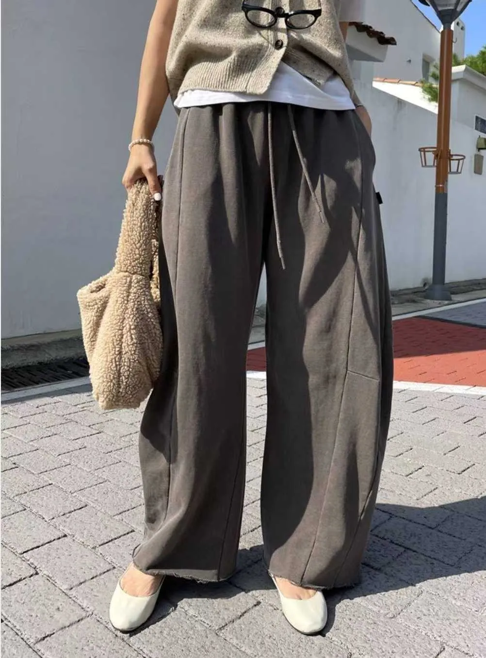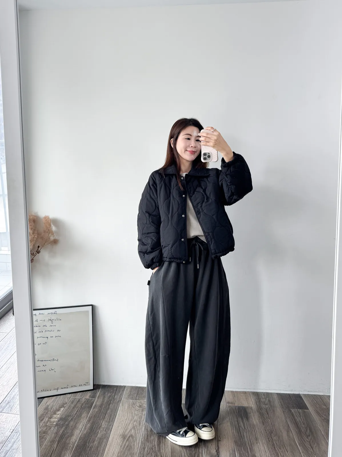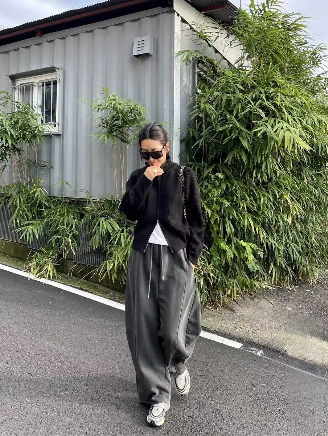 水洗棉 / 有彈性 /褲頭鬆緊+抽繩 小個穿會有比較明顯的繭型褲型~ ML身形或是高個一點撐起褲子會更順身 看韓國麻豆穿超好看!! 顏色也是很漂亮的水洗色調 深灰和深咖都是秋冬百搭也不會太過強眼的色調! Model 158/48(腰26 臀35.5吋) detail/