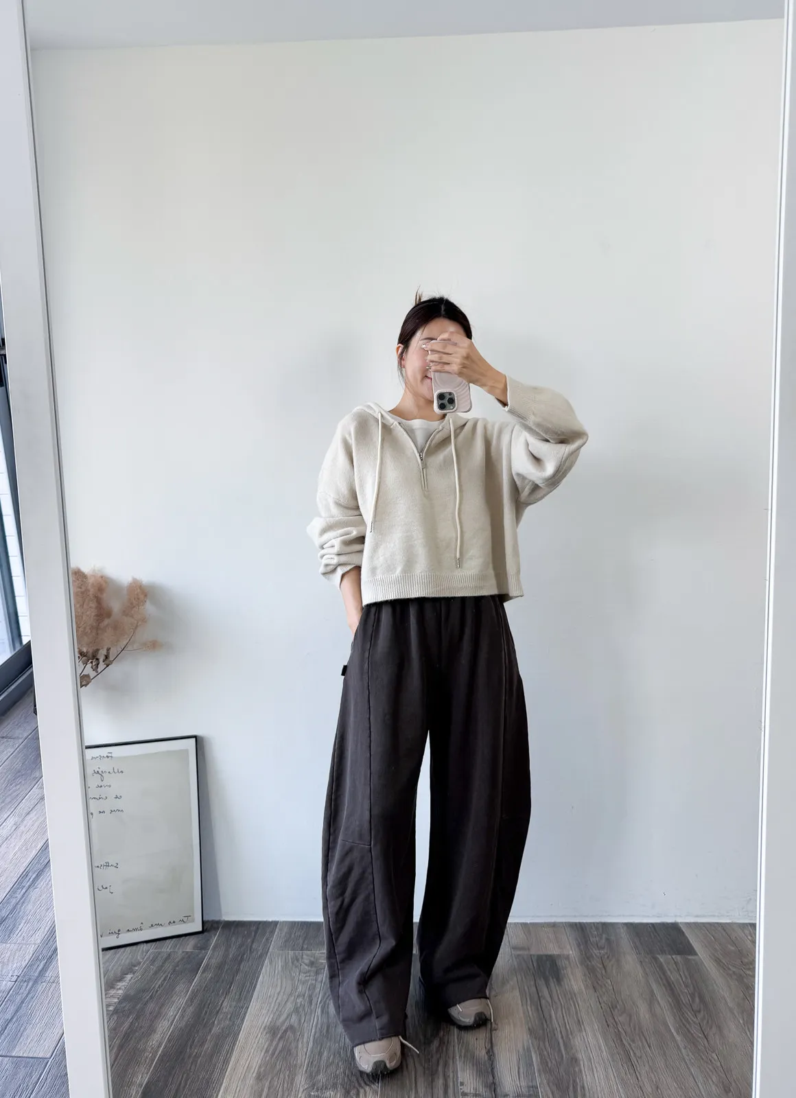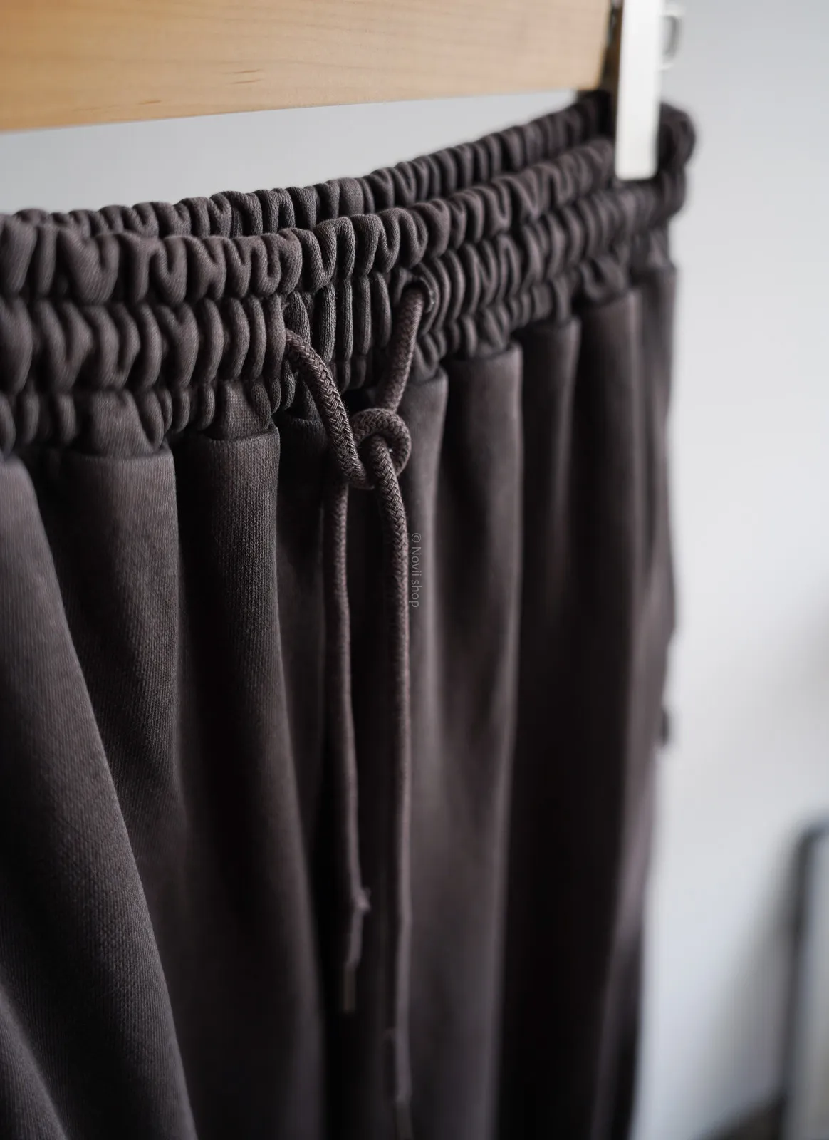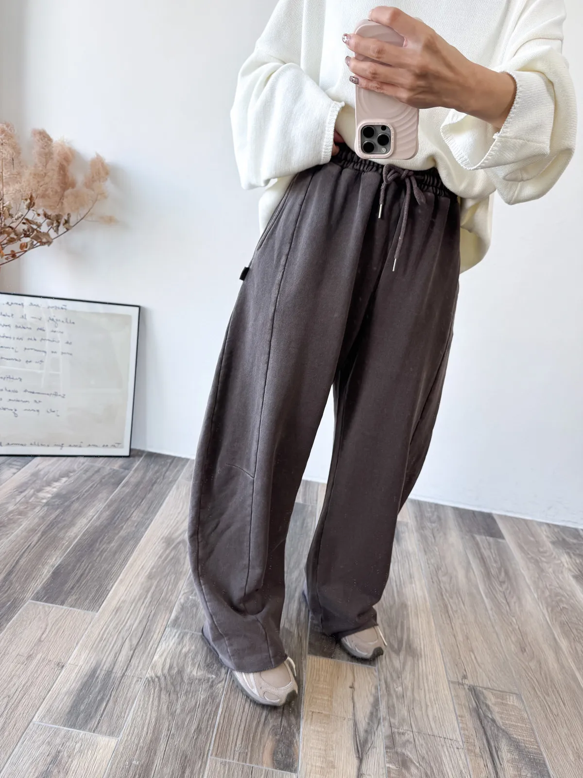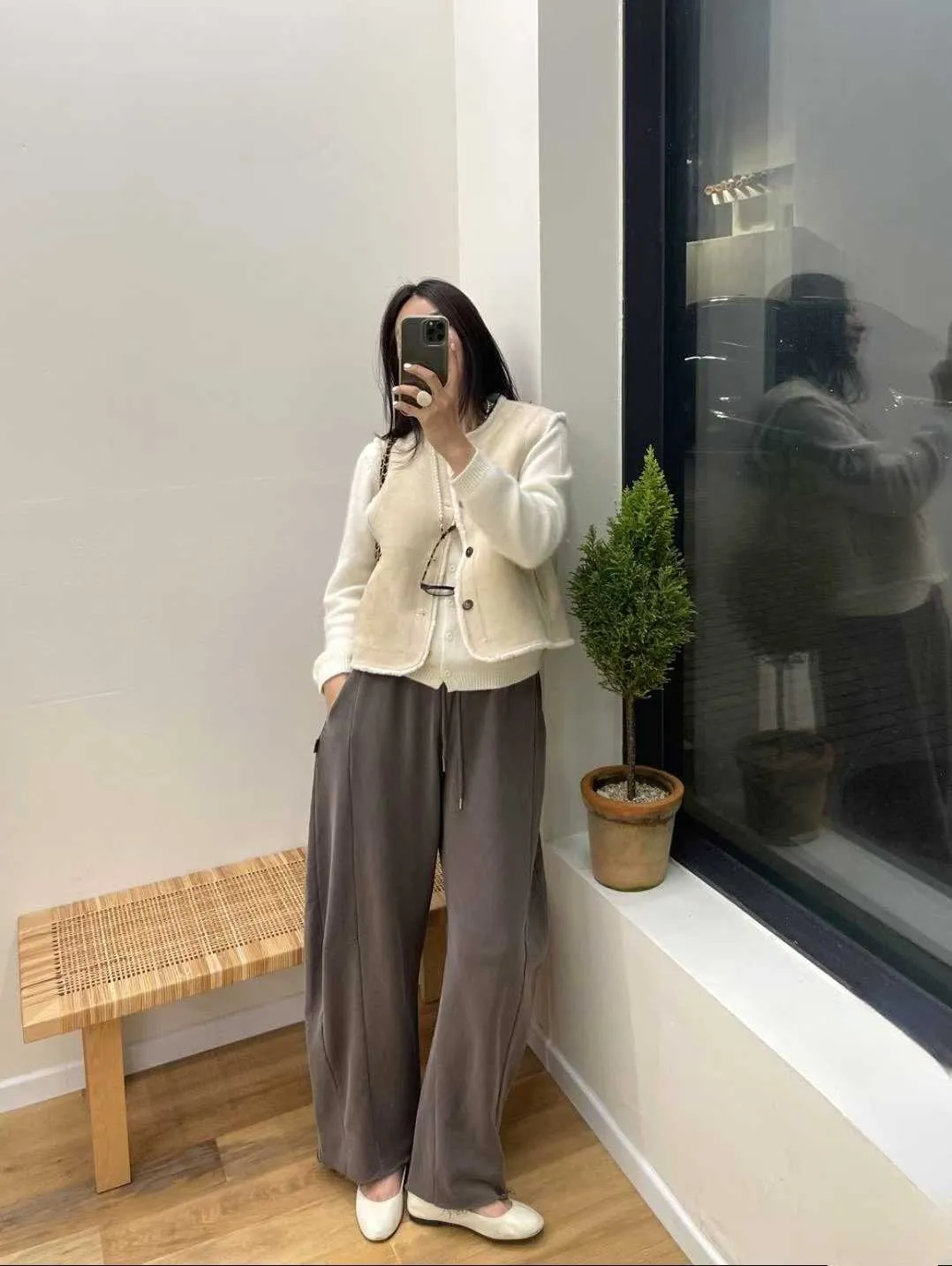 水洗棉 / 有彈性 /褲頭鬆緊+抽繩 小個穿會有比較明顯的繭型褲型~ ML身形或是高個一點撐起褲子會更順身 看韓國麻豆穿超好看!! 顏色也是很漂亮的水洗色調 深灰和深咖都是秋冬百搭也不會太過強眼的色調! Model 158/48(腰26 臀35.5吋) detail/