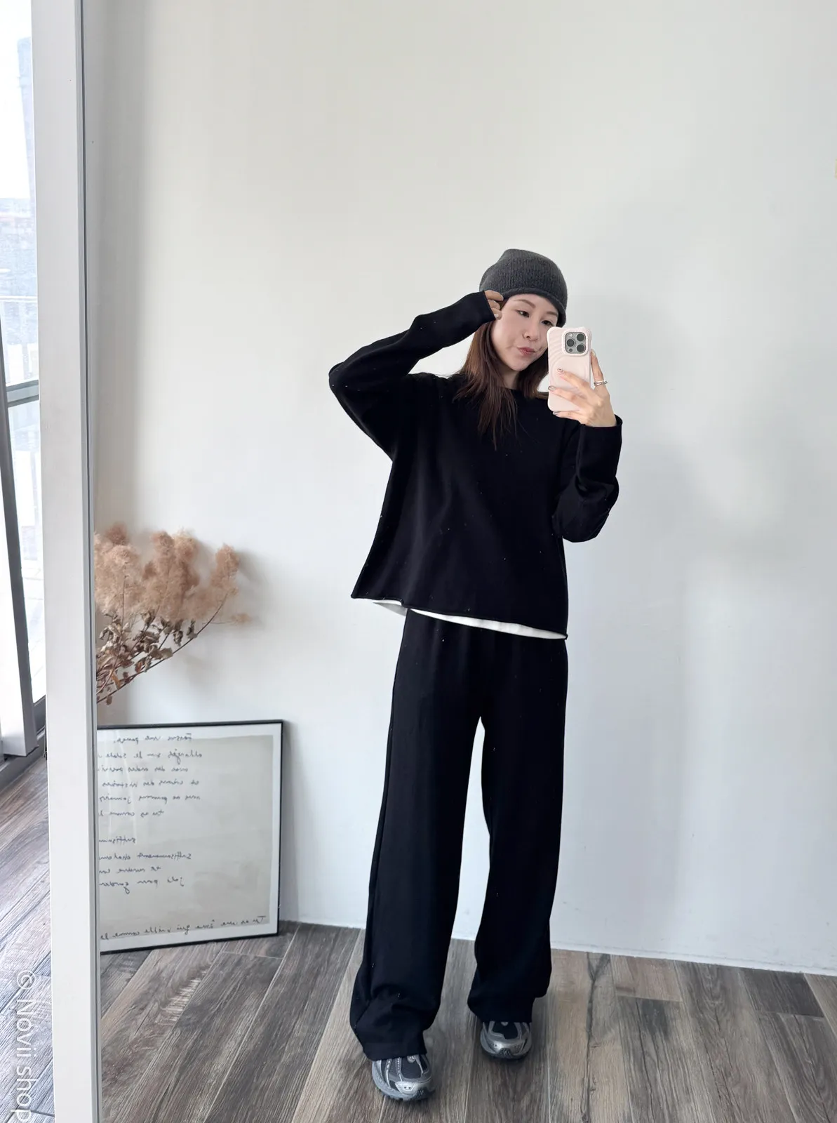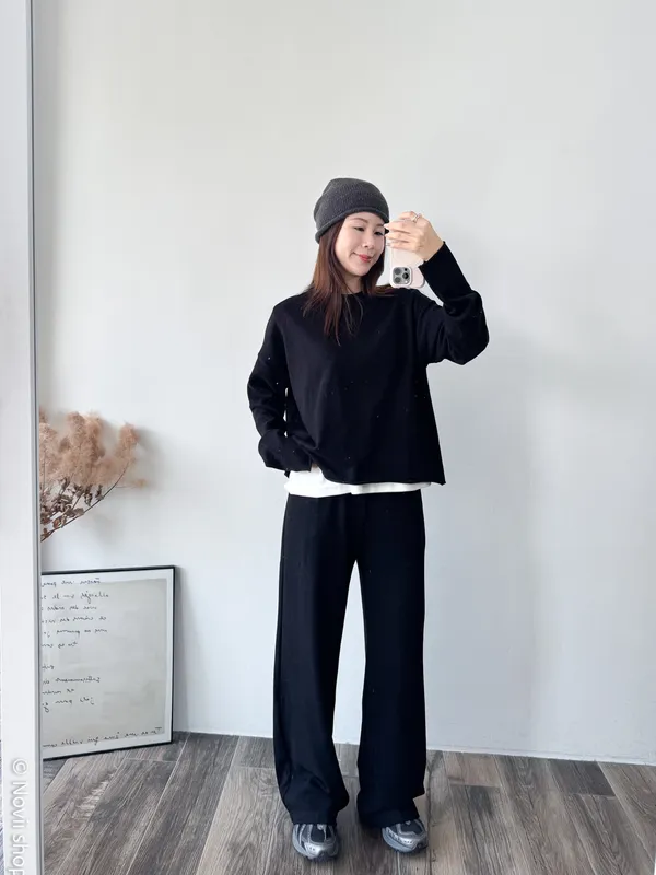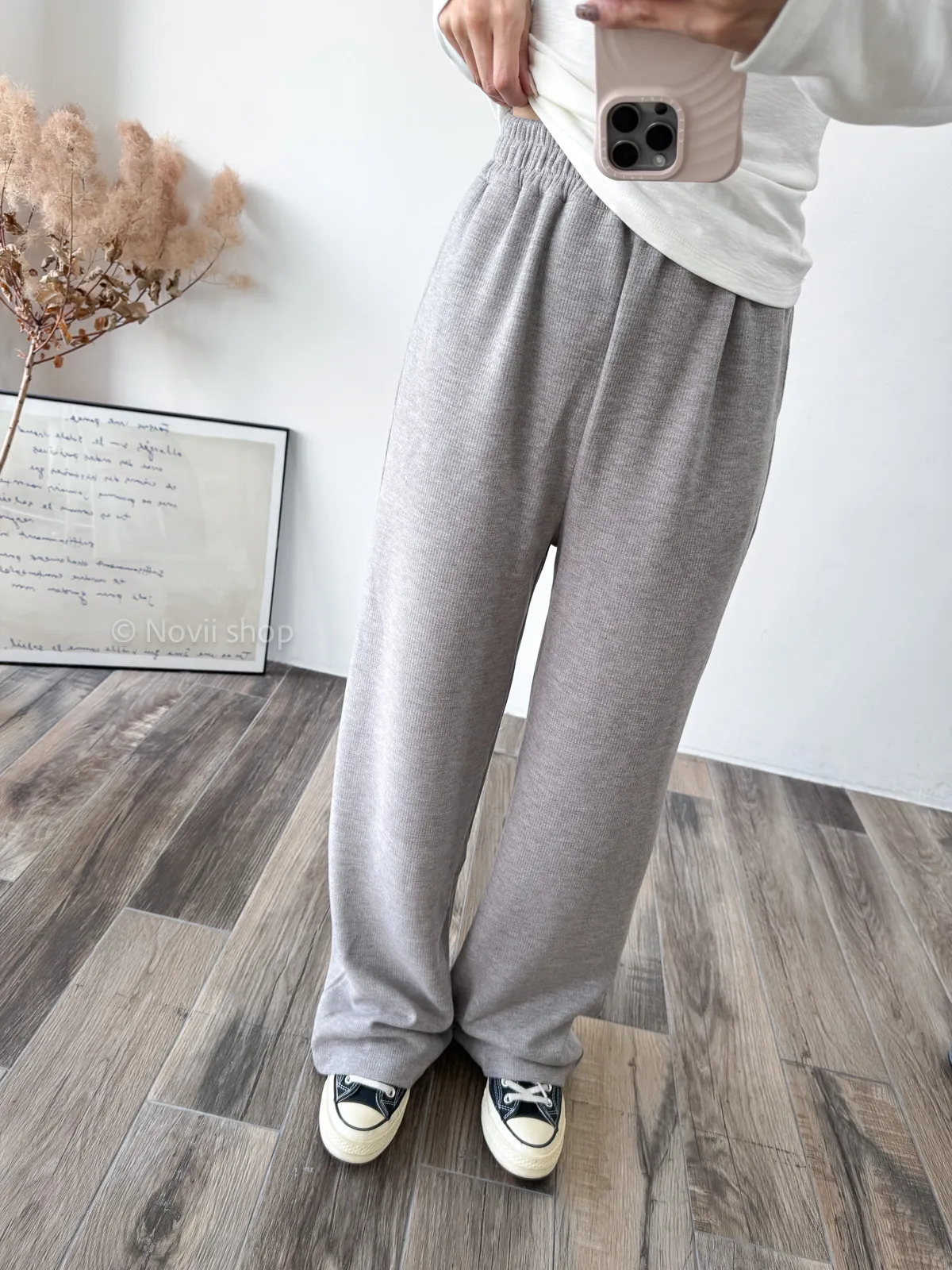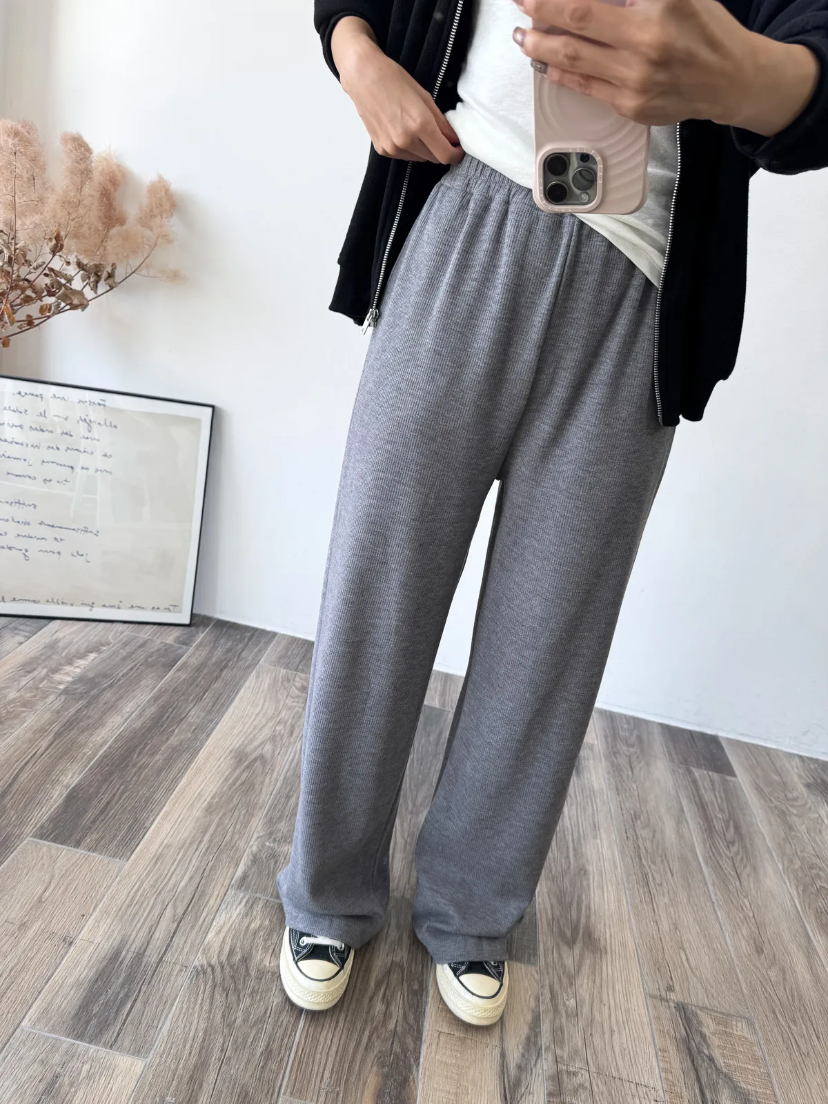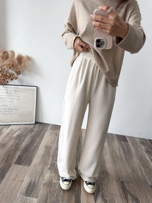 細坑條面/ 有彈性 / 褲頭鬆緊帶 超級舒服的面料~ 外層摸起來柔柔滑滑會忍不住一直摸XD 版型S~L都OK褲頭彈性很大,有口袋(加分) 版型順順的直筒加上布料的垂墜度穿起來非常修身 直筒版型配上冬天大學T好看又舒服!我自己超愛XD *made in china Model 158/48(腰26 臀35.5吋)