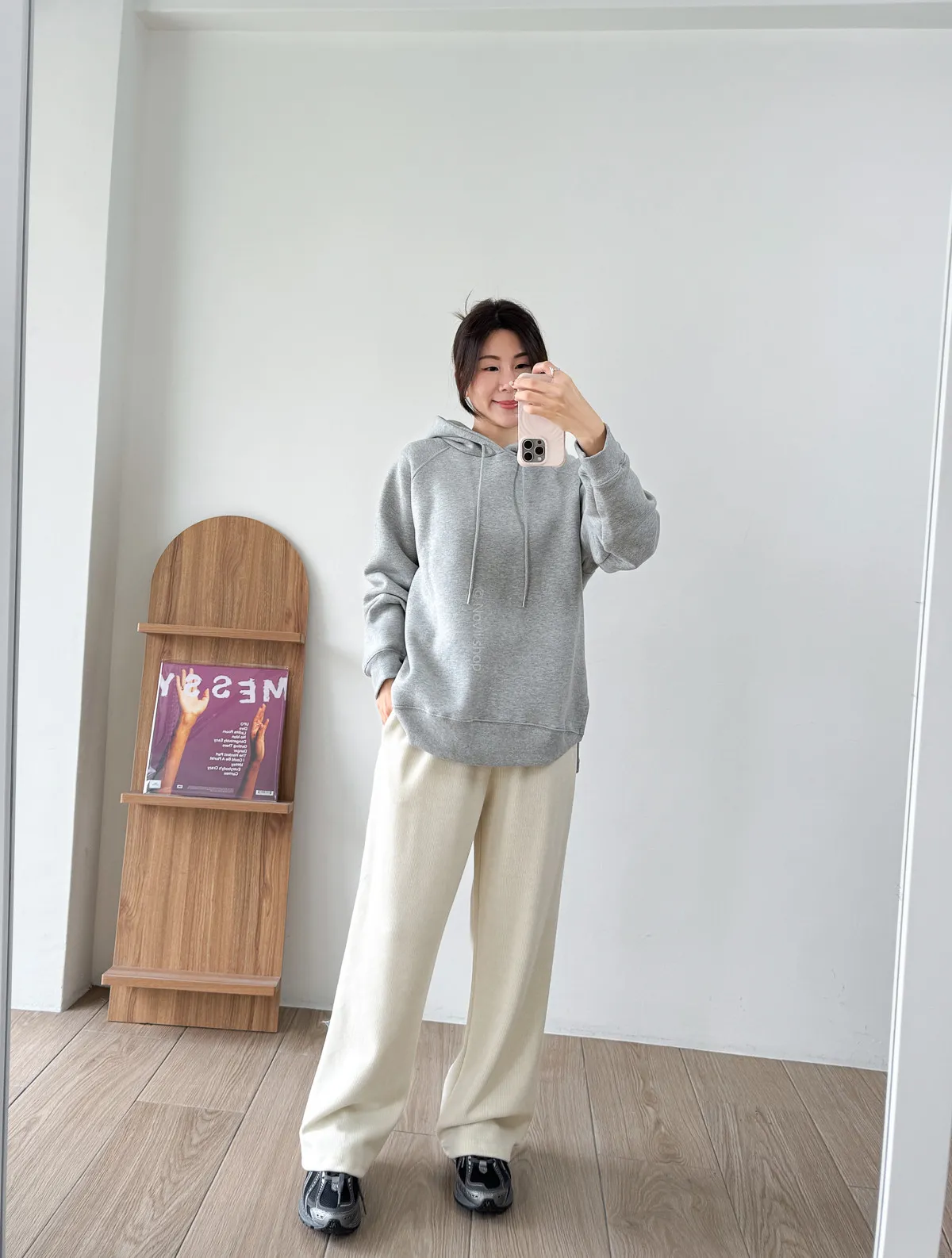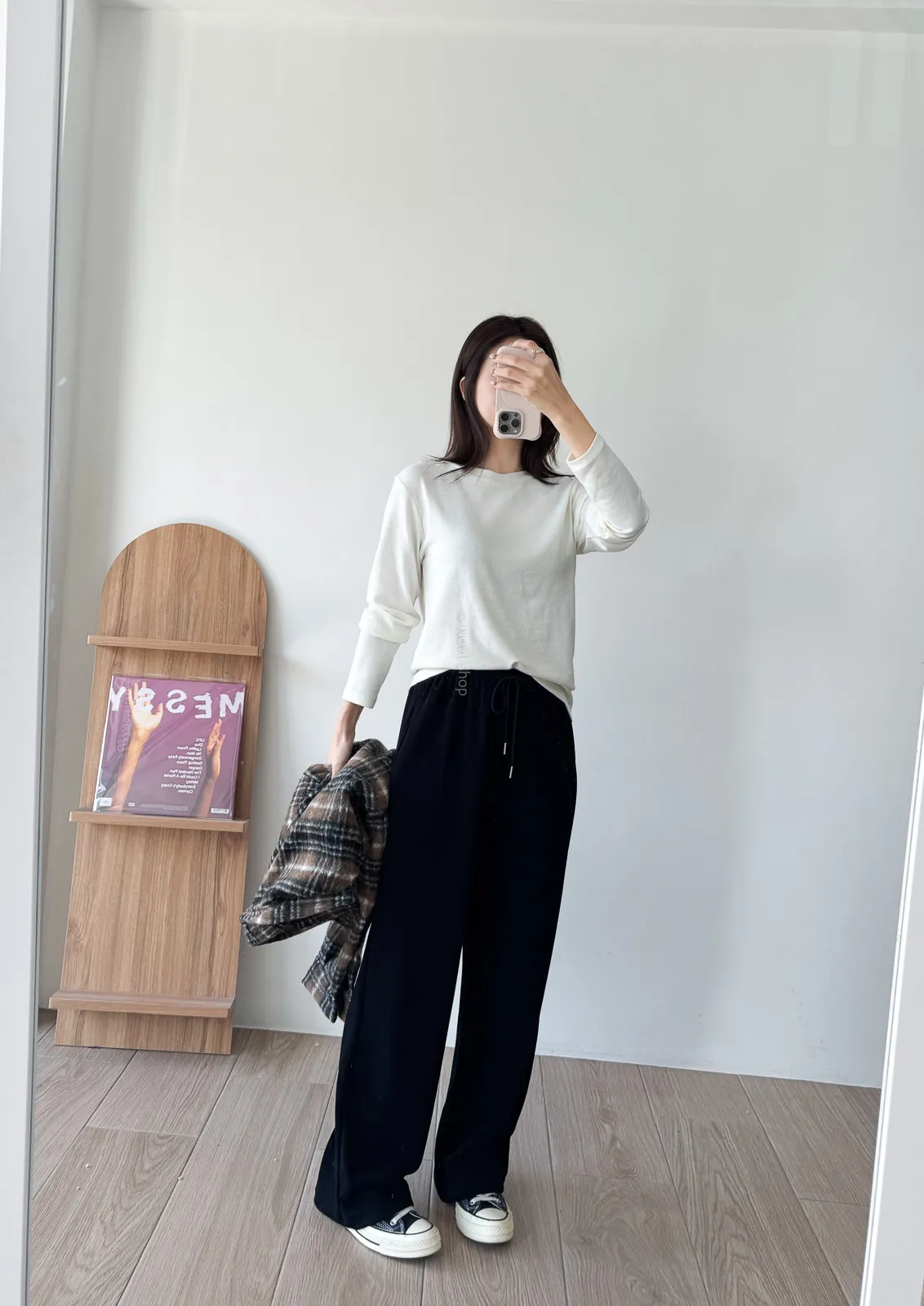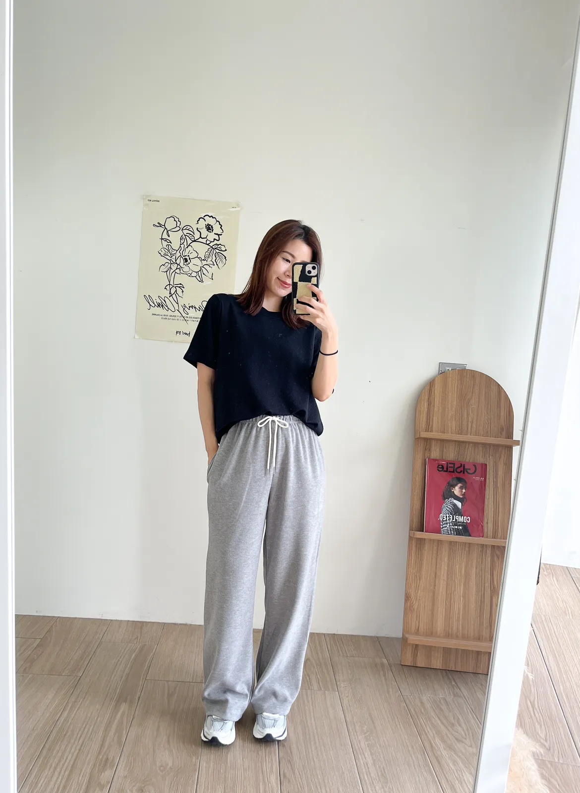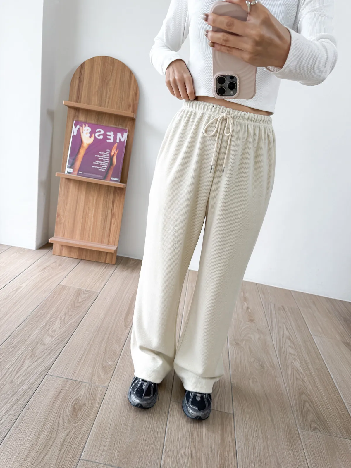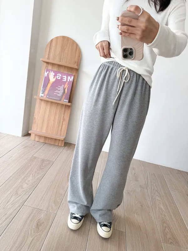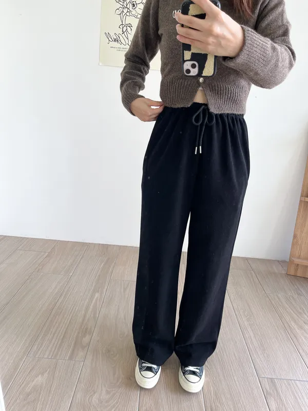 棉質 / 有彈性 / 鬆緊帶褲頭+抽繩這件超級舒服的!!!材質非常親膚 垂墜度也很棒微寬鬆版型 把腿修得直直的大腿屁股肉全部藏起來這種完全是我的愛褲~ 要直接包三色的那種XD - model - 阿樂 158/49 (腰26吋/臀35.5吋)