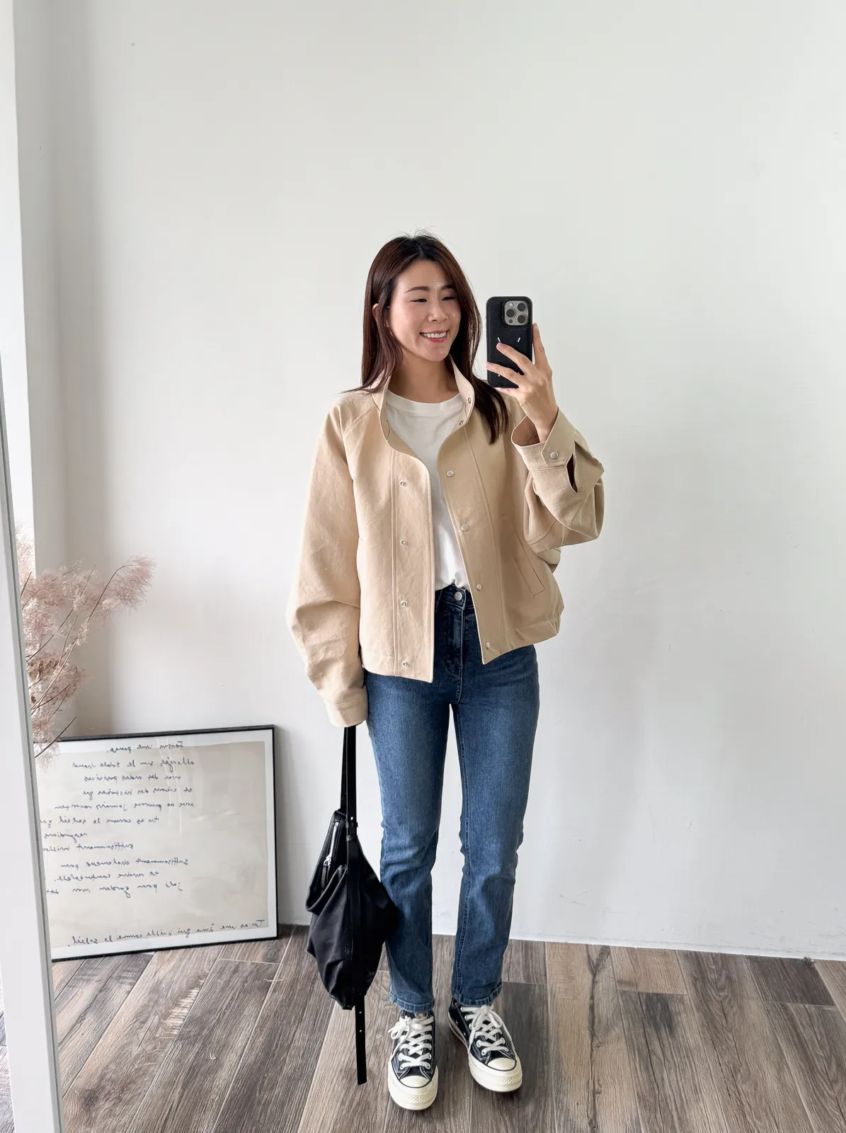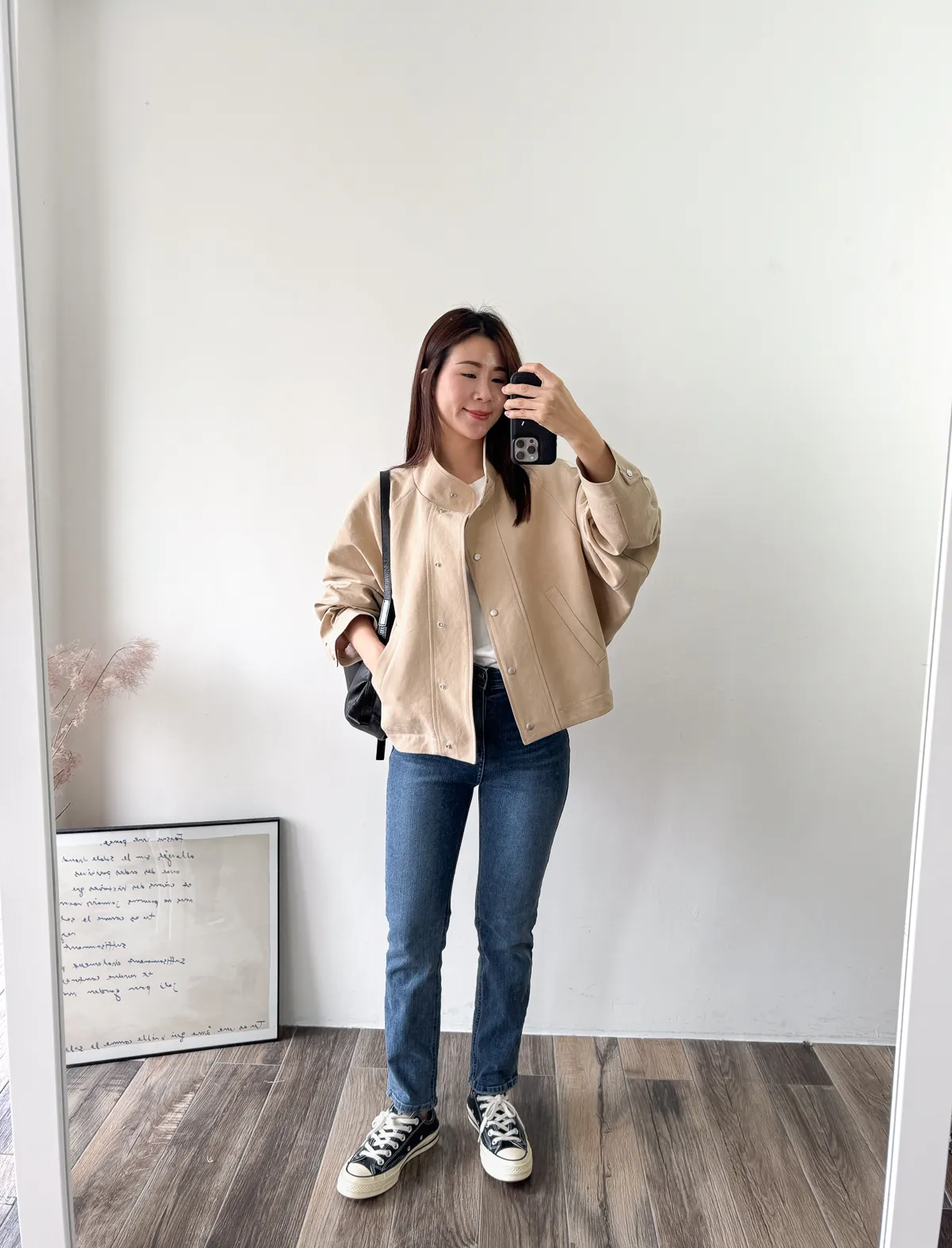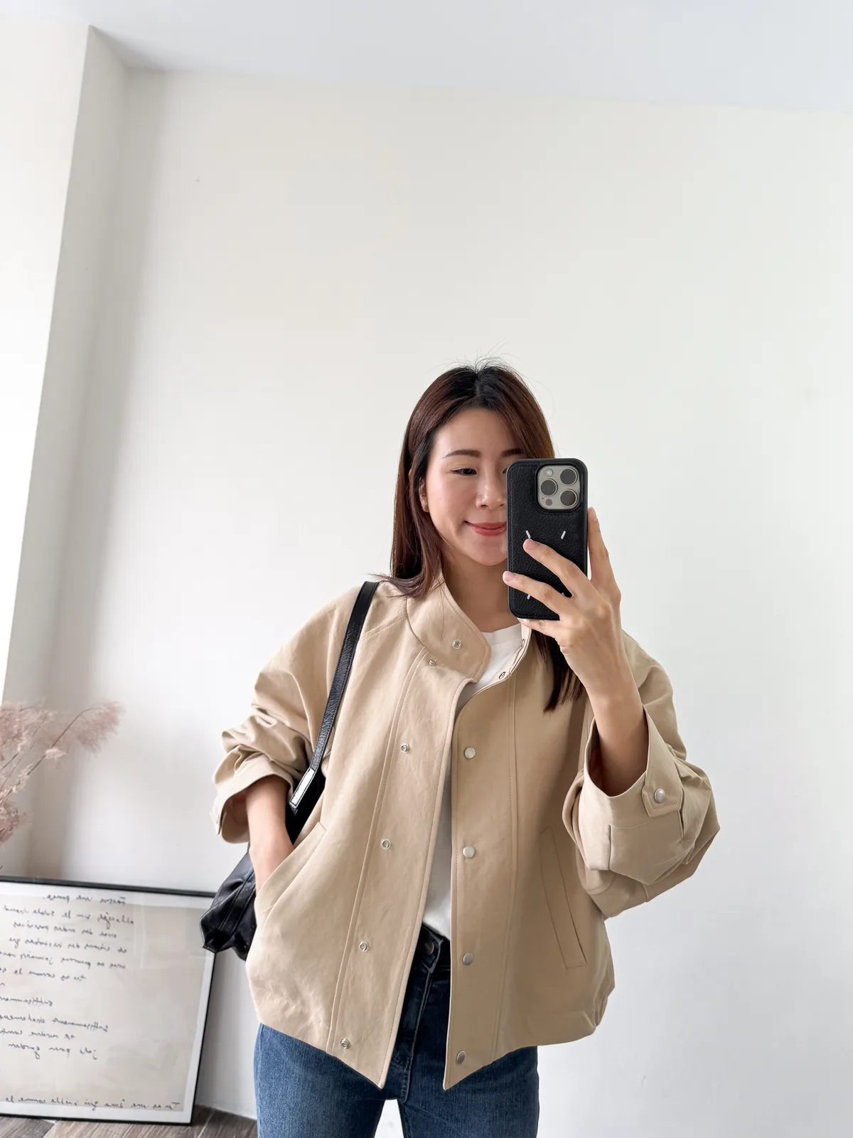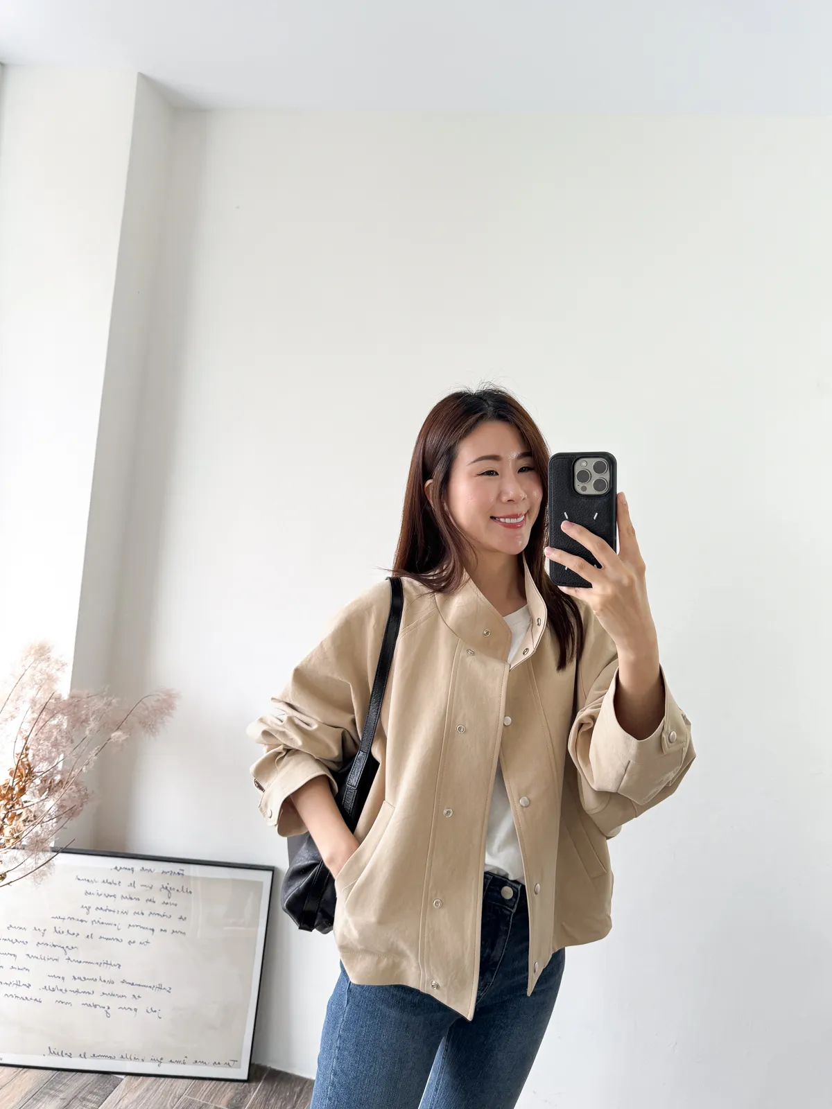 卡其面 / 有內裏 / 無彈性 這件不得料~ 看韓國好多廠商出類似款 這款布料、版型和挺度完全到位! 就是隨意配上一件牛仔褲,卡其褲等等 就可以讓整體穿搭加分許多 變得很有型 外層觸感有點霧面感觸感滑順好摸. 小立領的地方我也很喜歡 有些挺度卻又有些柔軟不會直挺挺兩片卡在脖子那邊. 整體版型我覺得很好看~ 短版簡單俐落,活動也很方便 是可以穿好幾年的耐看款 推薦給大家!! Model 158/48 (腰26 臀35.5吋) detail//