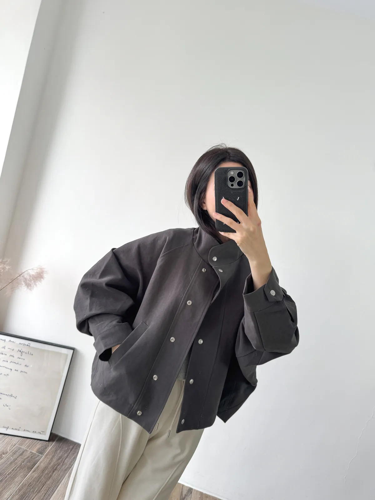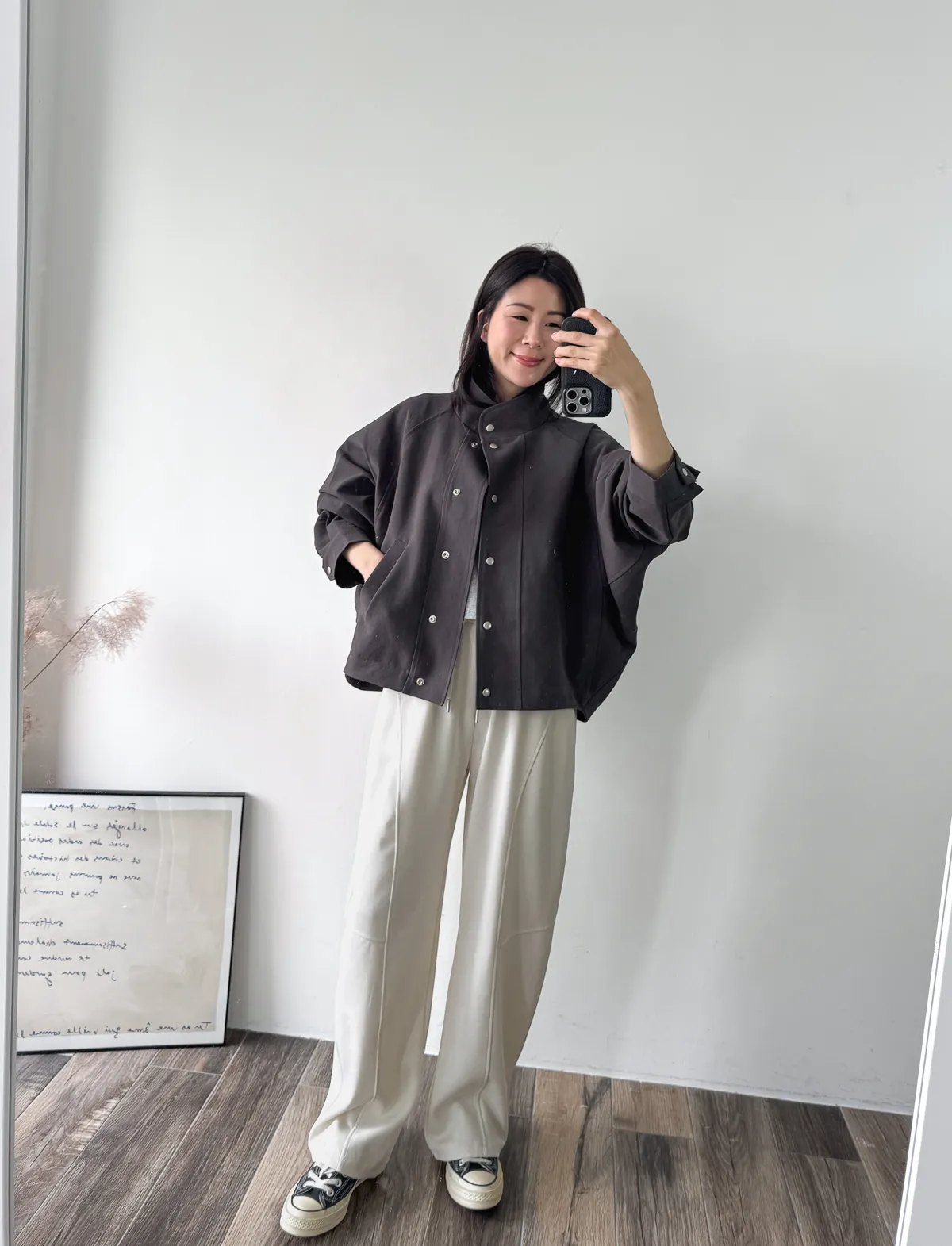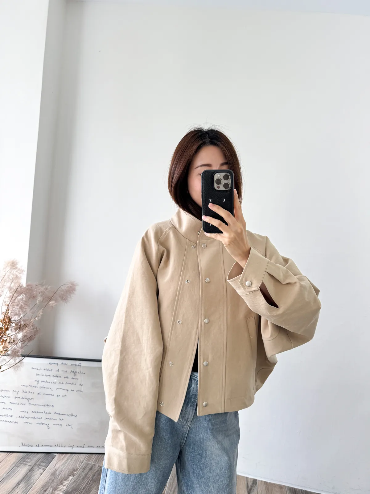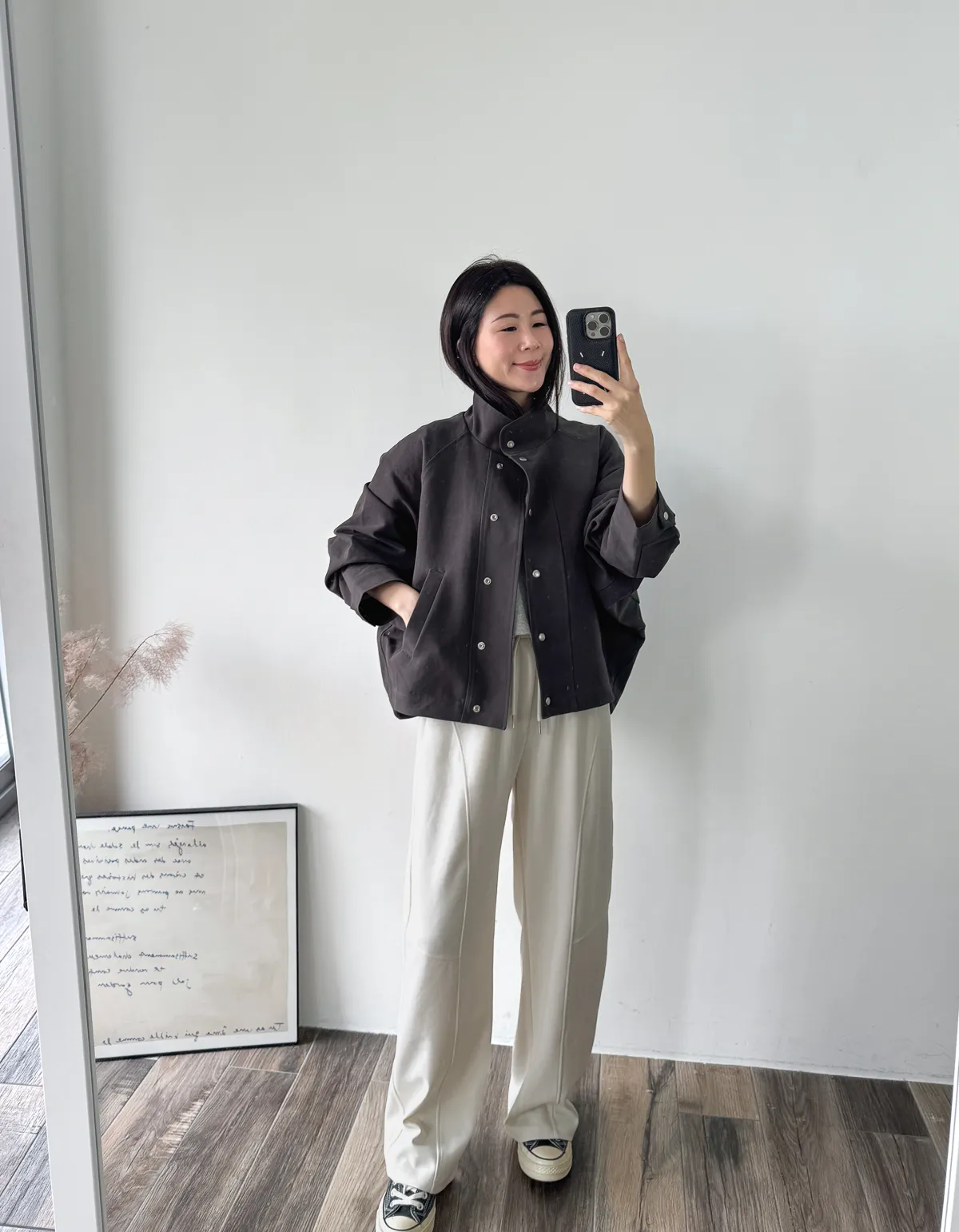 卡其面 / 有內裏 / 無彈性 這件不得料~ 看韓國好多廠商出類似款 這款布料、版型和挺度完全到位! 就是隨意配上一件牛仔褲,卡其褲等等 就可以讓整體穿搭加分許多 變得很有型 外層觸感有點霧面感觸感滑順好摸. 小立領的地方我也很喜歡 有些挺度卻又有些柔軟不會直挺挺兩片卡在脖子那邊. 整體版型我覺得很好看~ 短版簡單俐落,活動也很方便 是可以穿好幾年的耐看款 推薦給大家!! Model 158/48 (腰26 臀35.5吋) detail//