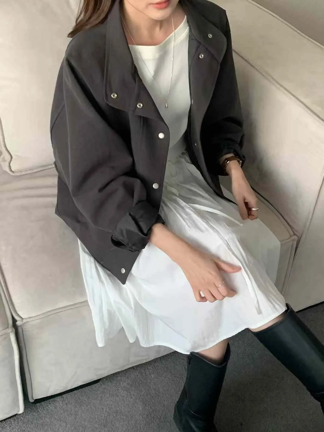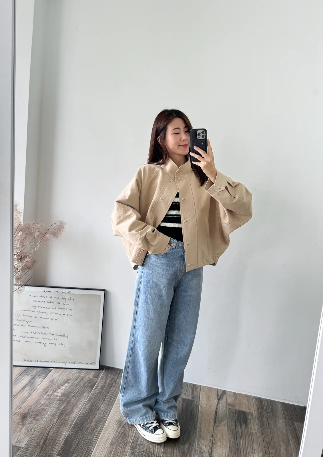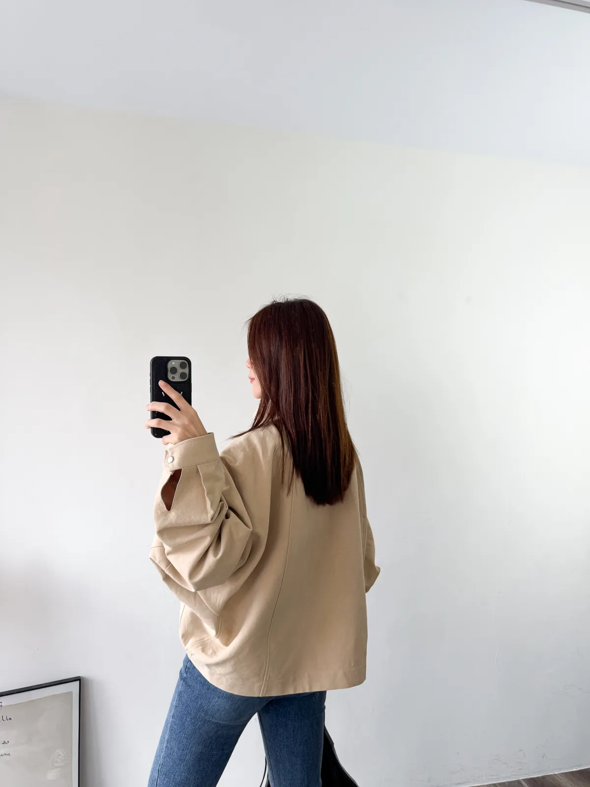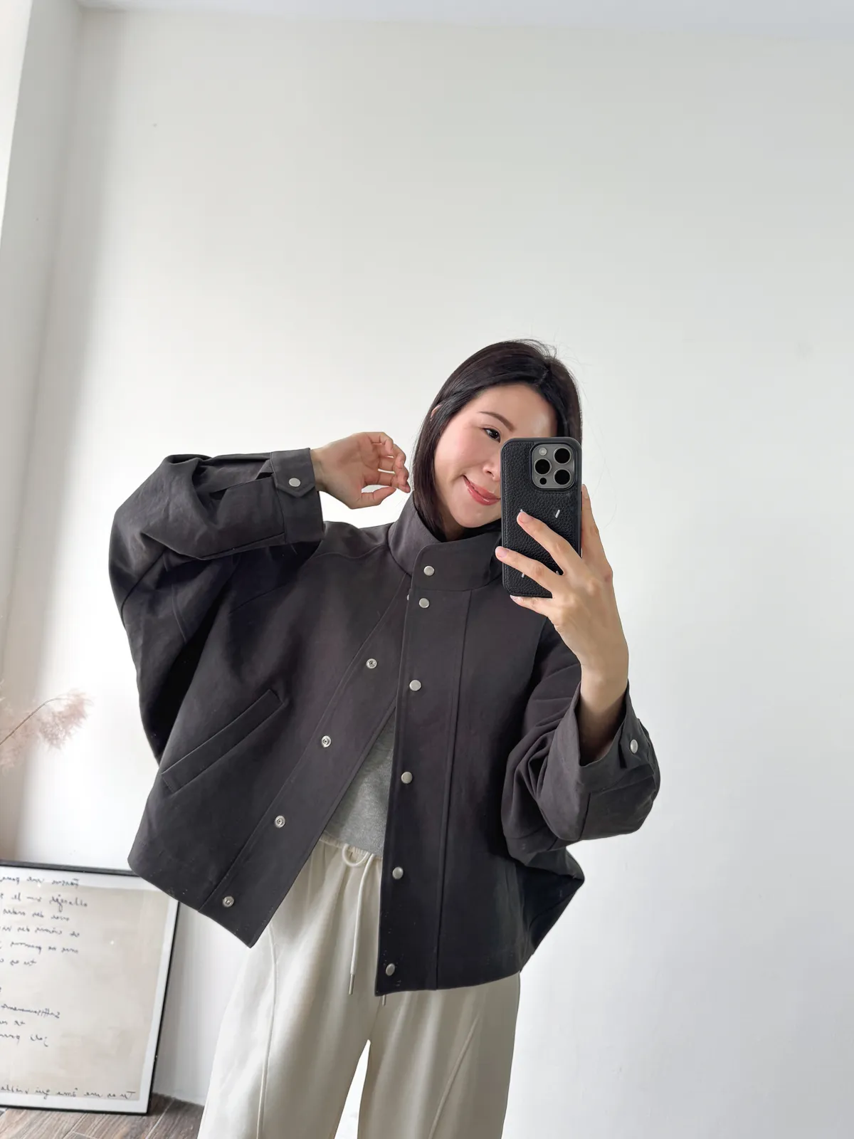 卡其面 / 有內裏 / 無彈性 這件不得料~ 看韓國好多廠商出類似款 這款布料、版型和挺度完全到位! 就是隨意配上一件牛仔褲,卡其褲等等 就可以讓整體穿搭加分許多 變得很有型 外層觸感有點霧面感觸感滑順好摸. 小立領的地方我也很喜歡 有些挺度卻又有些柔軟不會直挺挺兩片卡在脖子那邊. 整體版型我覺得很好看~ 短版簡單俐落,活動也很方便 是可以穿好幾年的耐看款 推薦給大家!! Model 158/48 (腰26 臀35.5吋) detail//