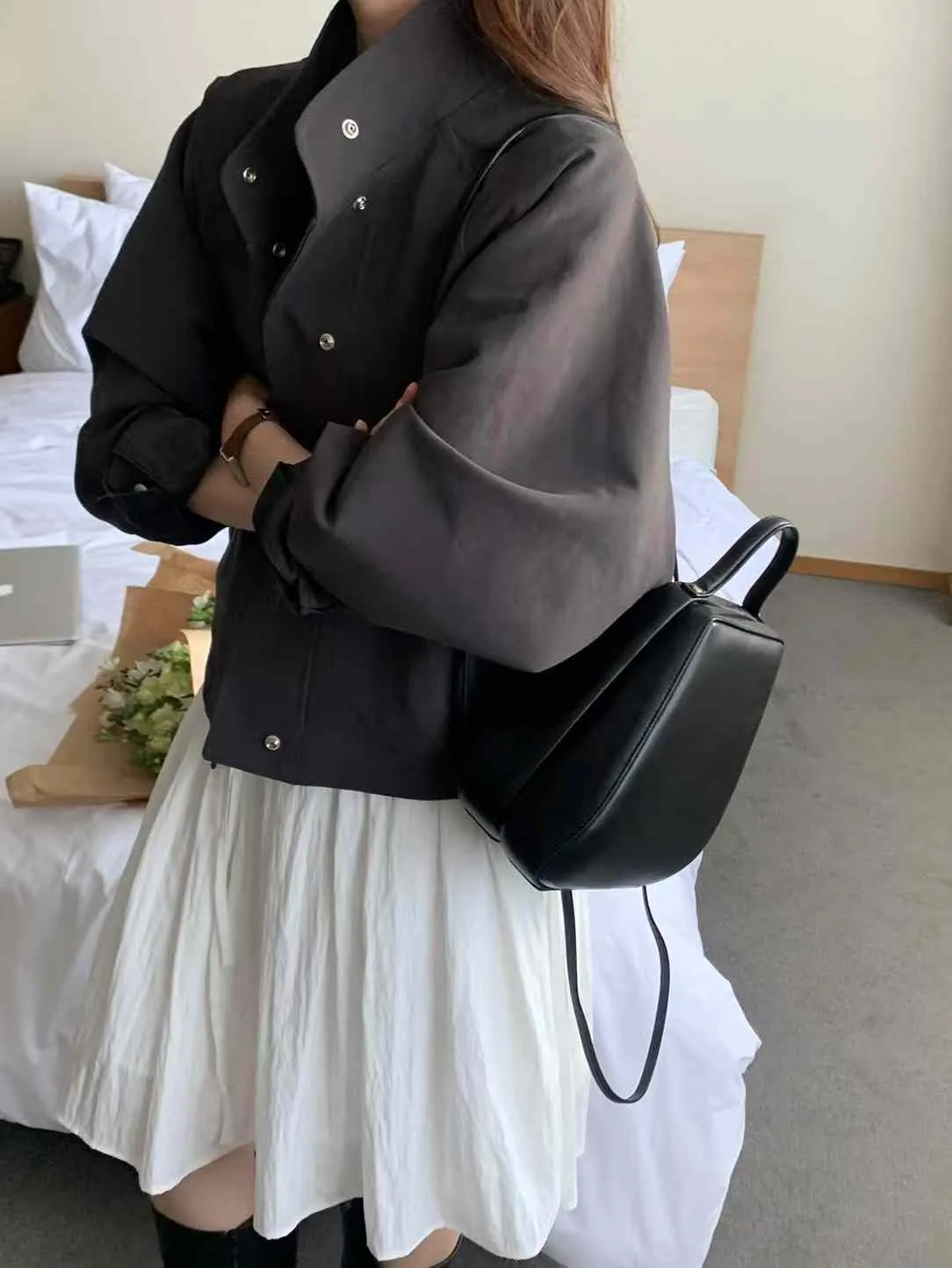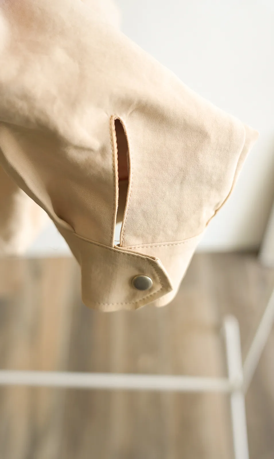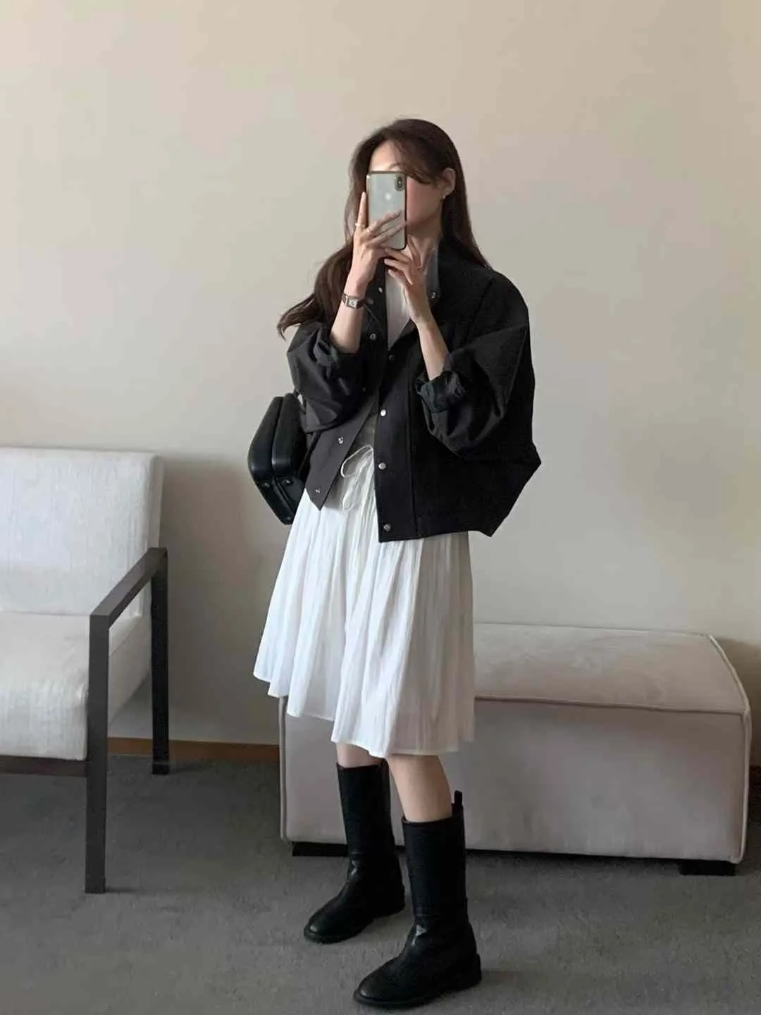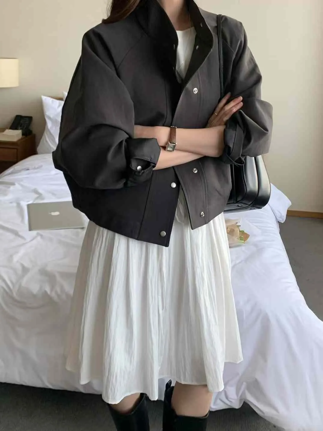 卡其面 / 有內裏 / 無彈性 這件不得料~ 看韓國好多廠商出類似款 這款布料、版型和挺度完全到位! 就是隨意配上一件牛仔褲,卡其褲等等 就可以讓整體穿搭加分許多 變得很有型 外層觸感有點霧面感觸感滑順好摸. 小立領的地方我也很喜歡 有些挺度卻又有些柔軟不會直挺挺兩片卡在脖子那邊. 整體版型我覺得很好看~ 短版簡單俐落,活動也很方便 是可以穿好幾年的耐看款 推薦給大家!! Model 158/48 (腰26 臀35.5吋) detail//