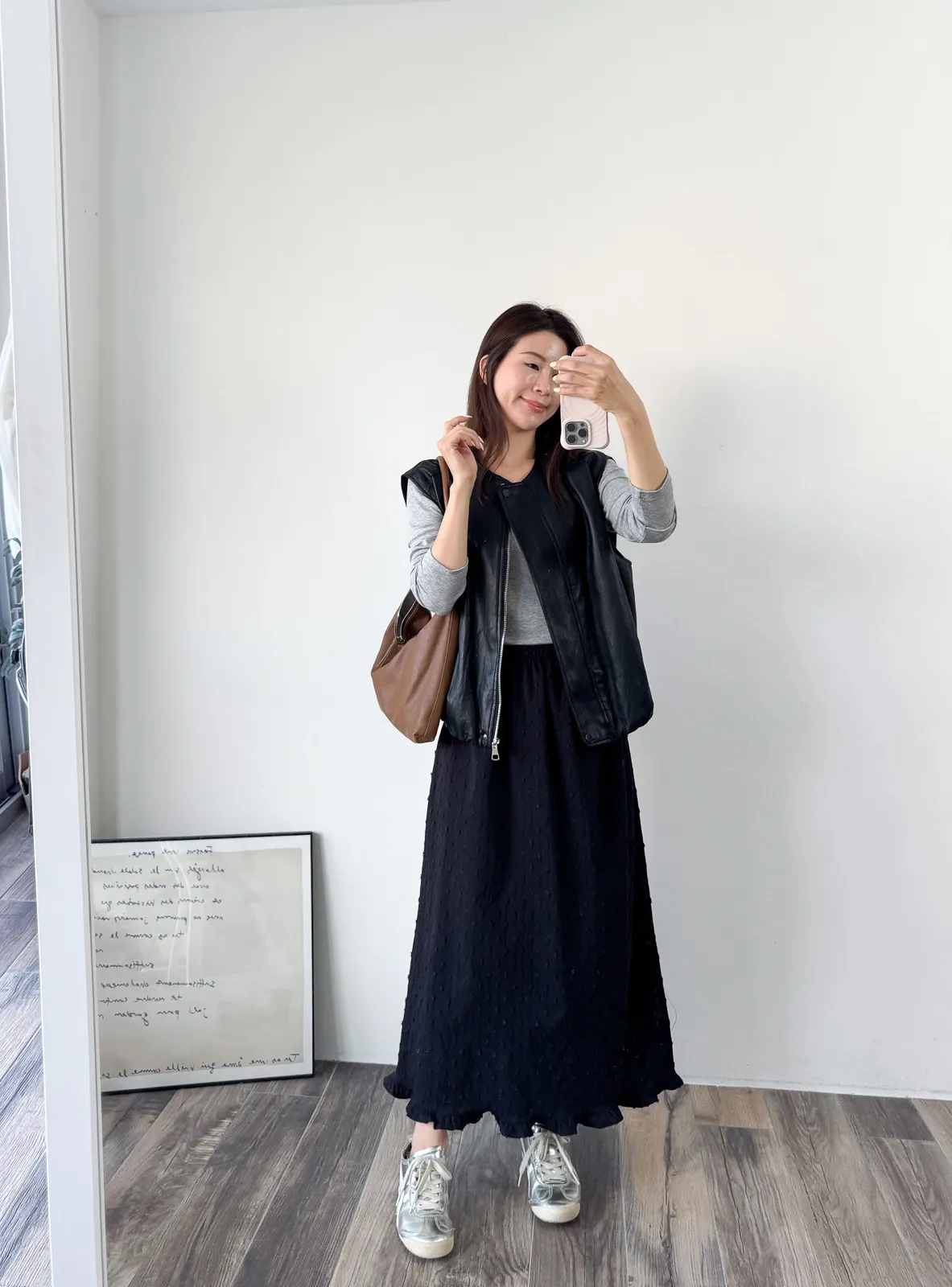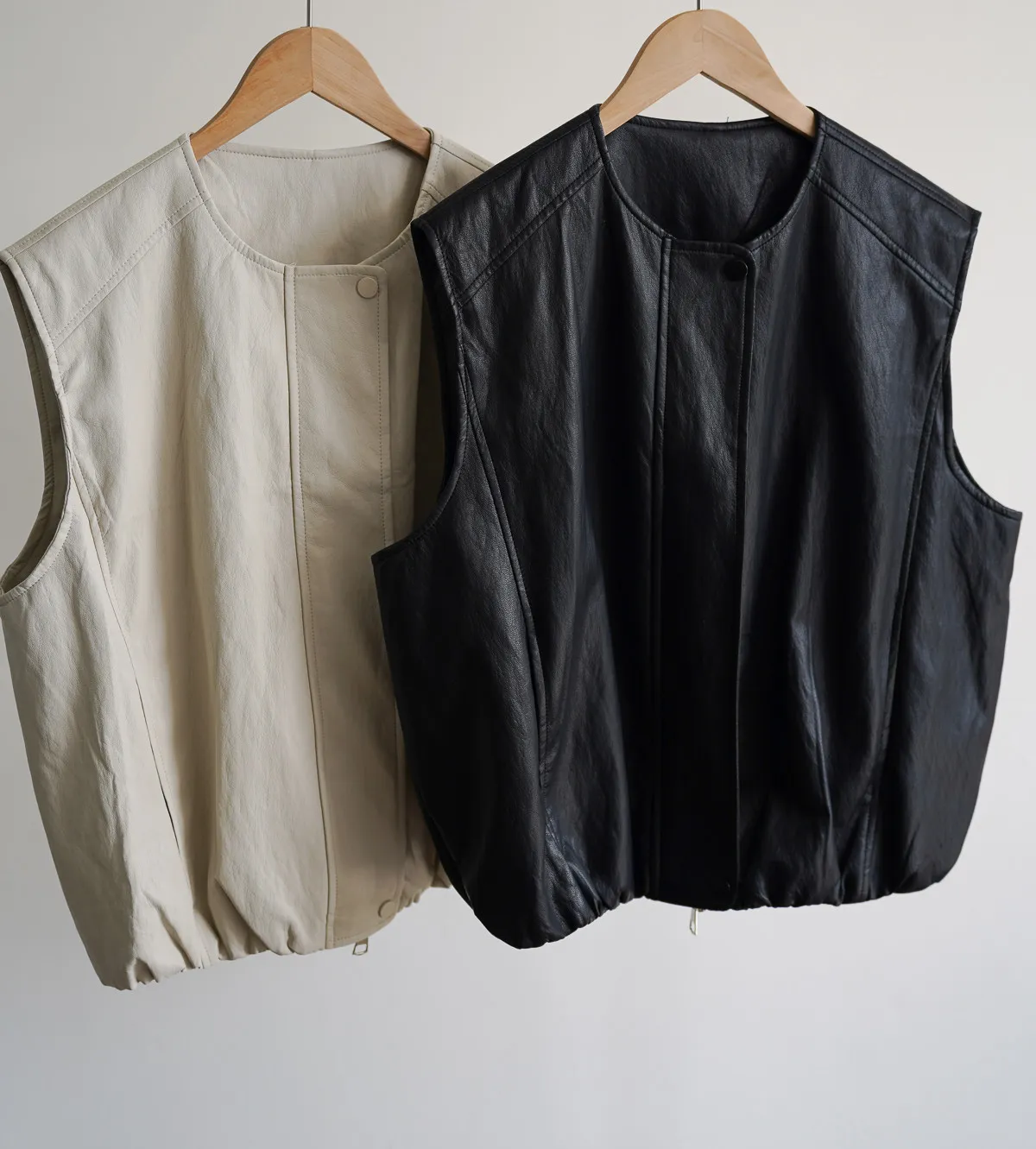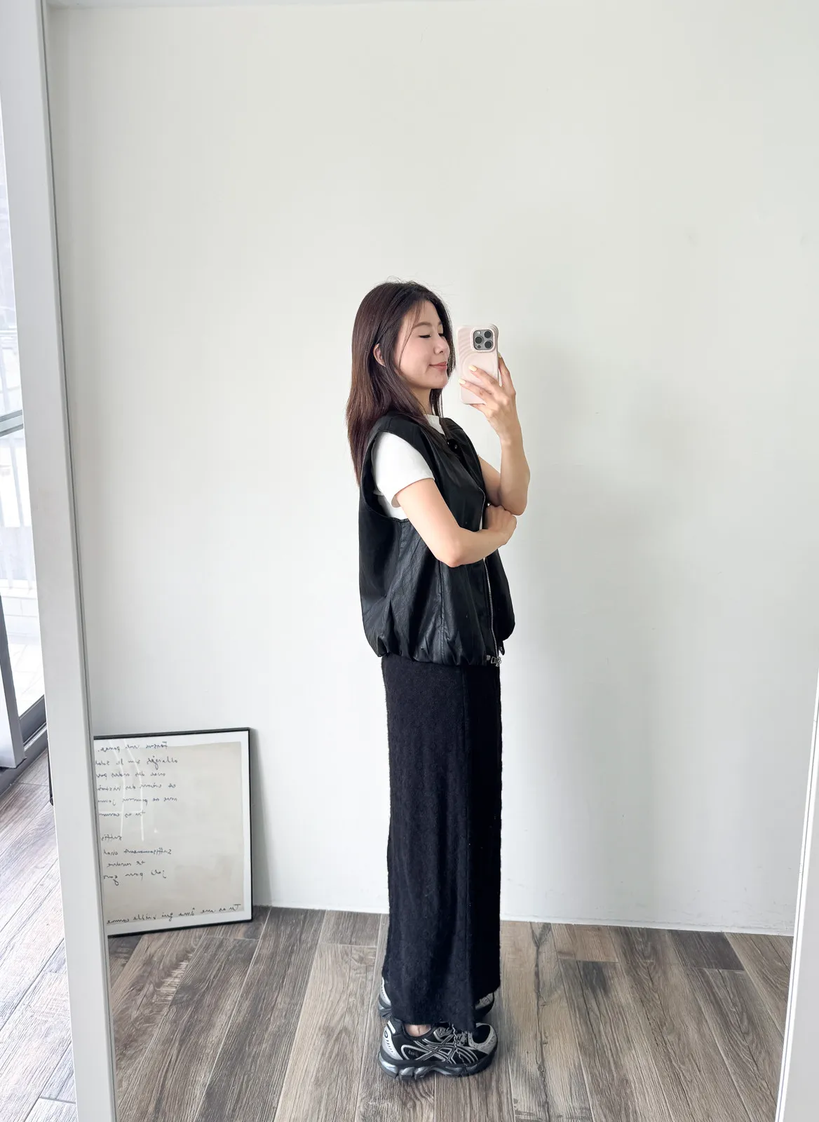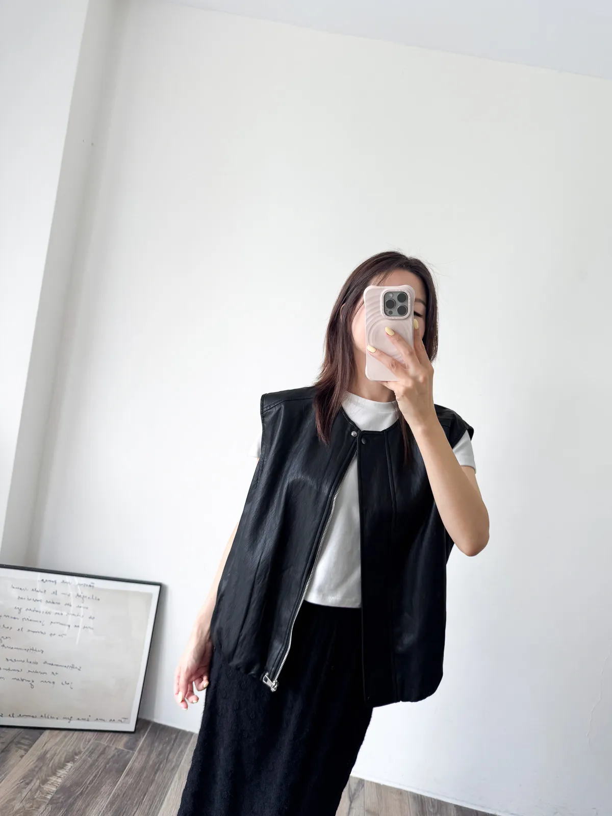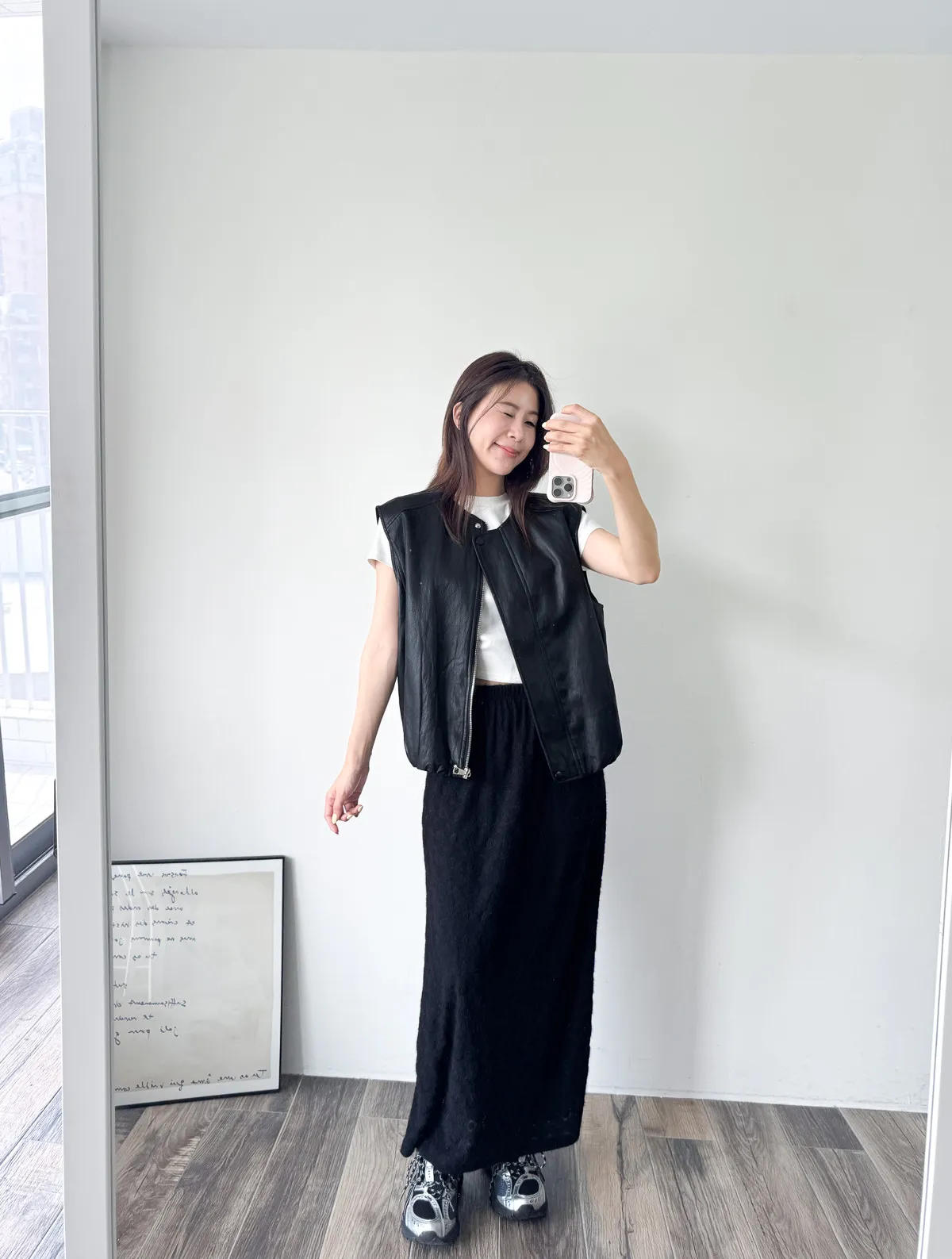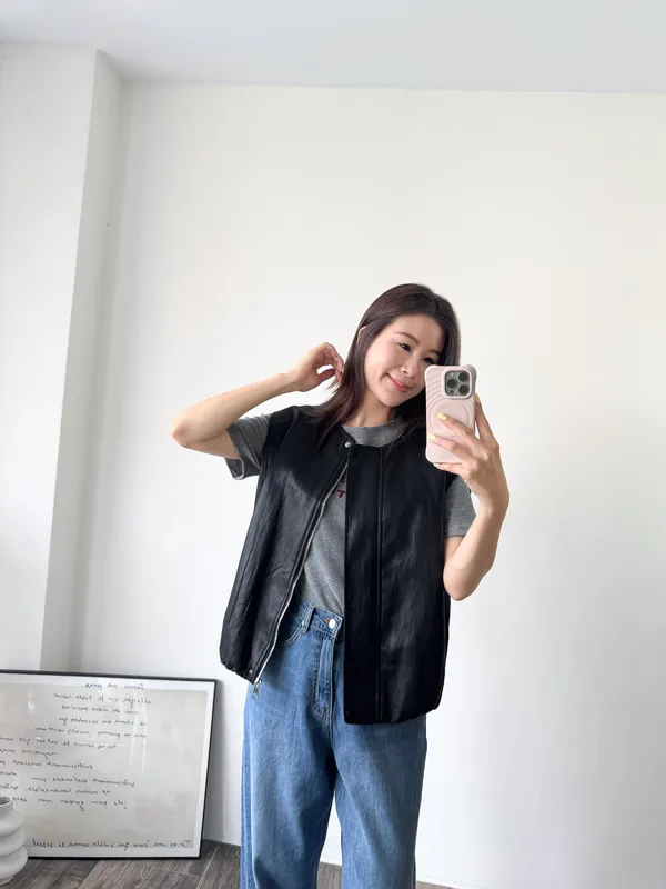 合成皮 / 有內裏 這款皮革背心太可愛了吧!! 隨便配都好看不管褲裝裙裝都難不倒它~ 素素的上衣只要套上它都可以立刻有型 下擺內縮鬆緊設計看起來微微膨感超可愛. 雖然黑色是最經典百搭, 但淺杏色也超級迷人搭配淺色調穿搭很讚! *made in china Model 158/48 (腰25吋 臀35.5吋) detail//
