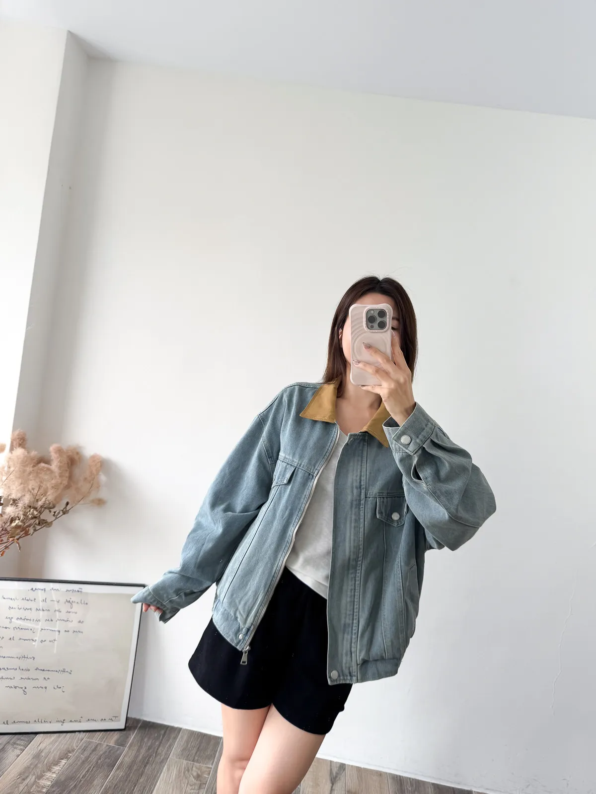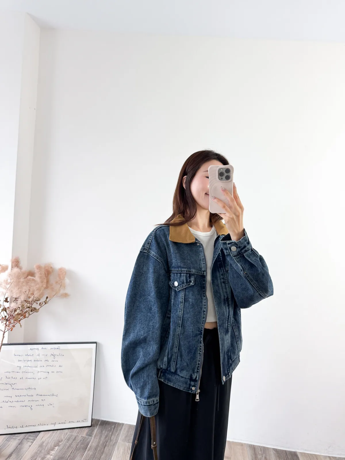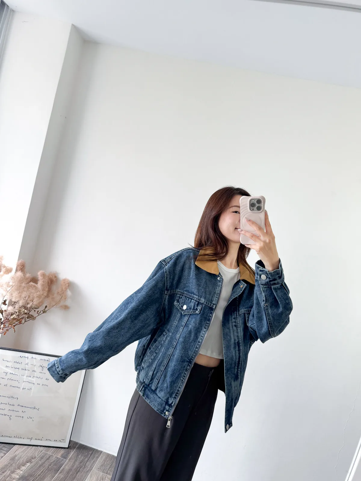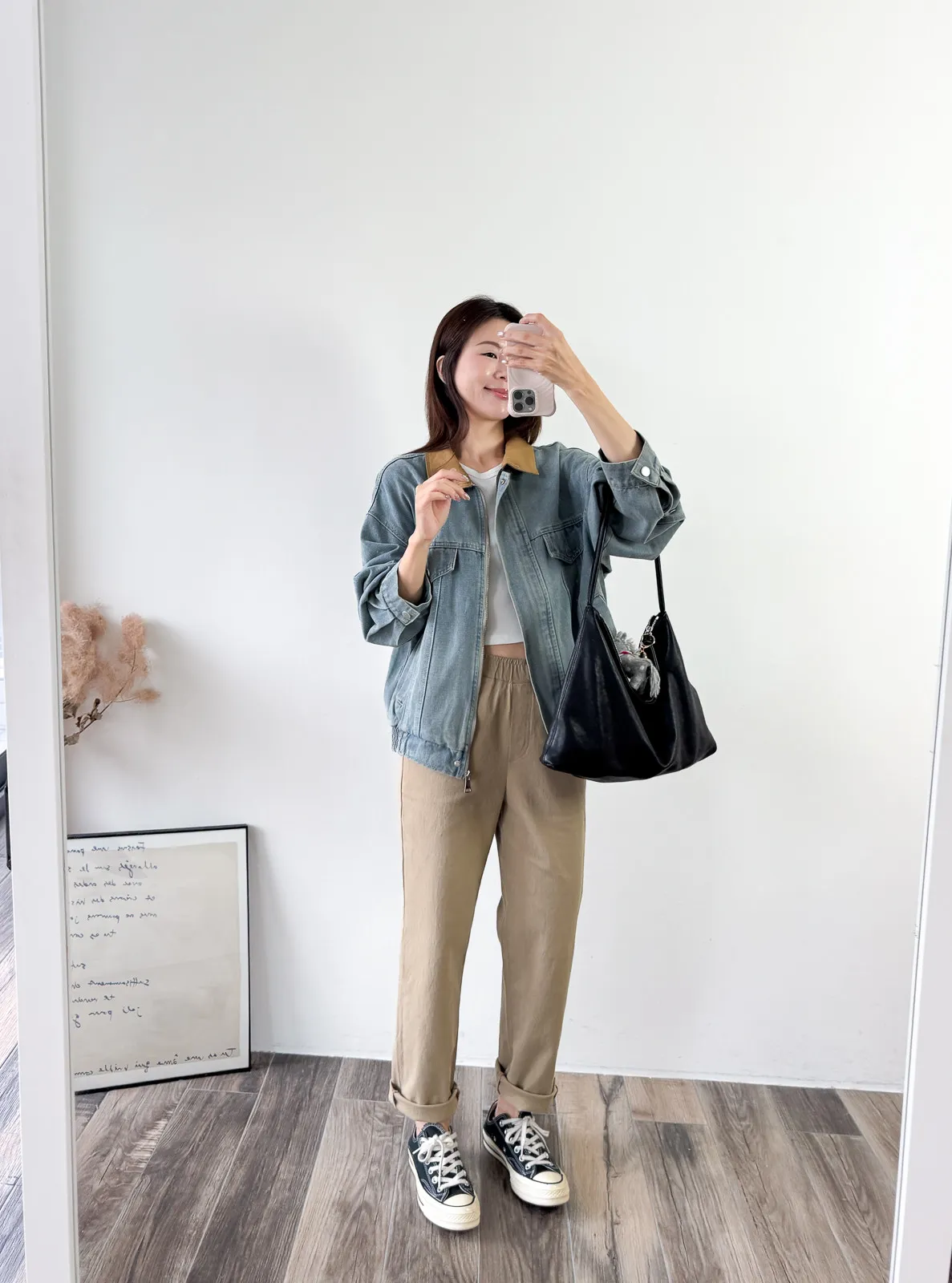 牛仔料 / 無彈性 / 無內裏 整件不會太過oversize 的版型 各種身形都能駕馭~ 因為沒有內裡也不用擔心會太厚重 穿在身上不會有負擔感! 今年依舊流行各種領配色外套 這款領子的配色及牛仔本布刷色搭配起來很好看 按起來還好,穿起來莫名的超好看! 有型又襯膚! 讚讚 *Made in china Model 158/48 (腰26吋 臀35.5吋)