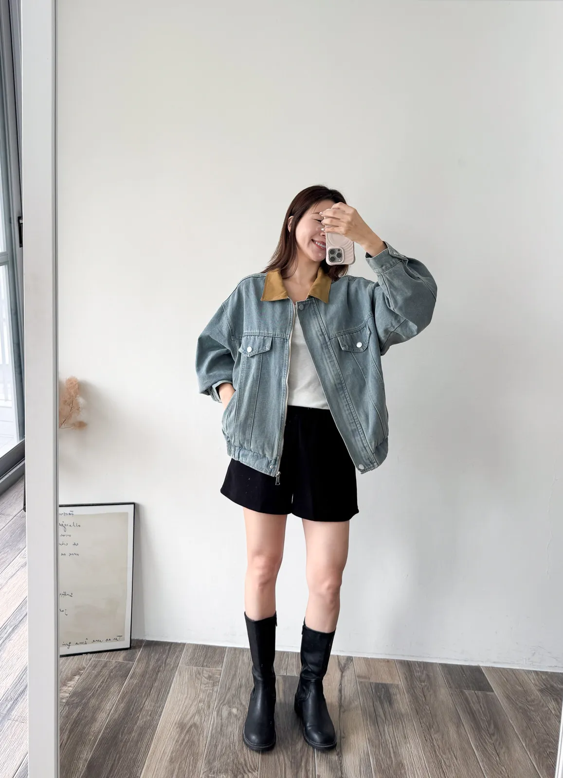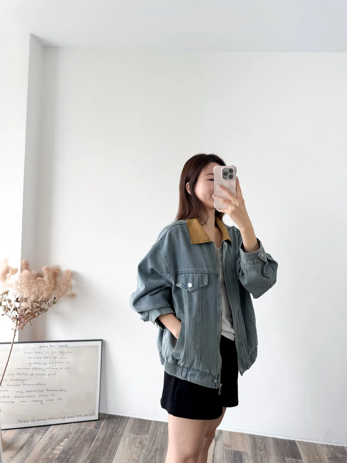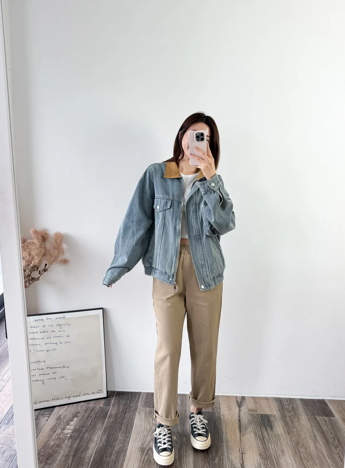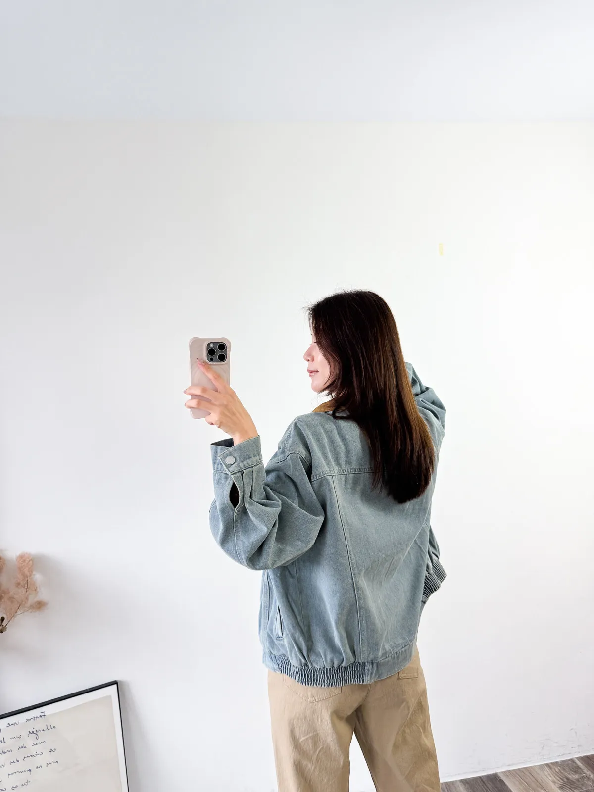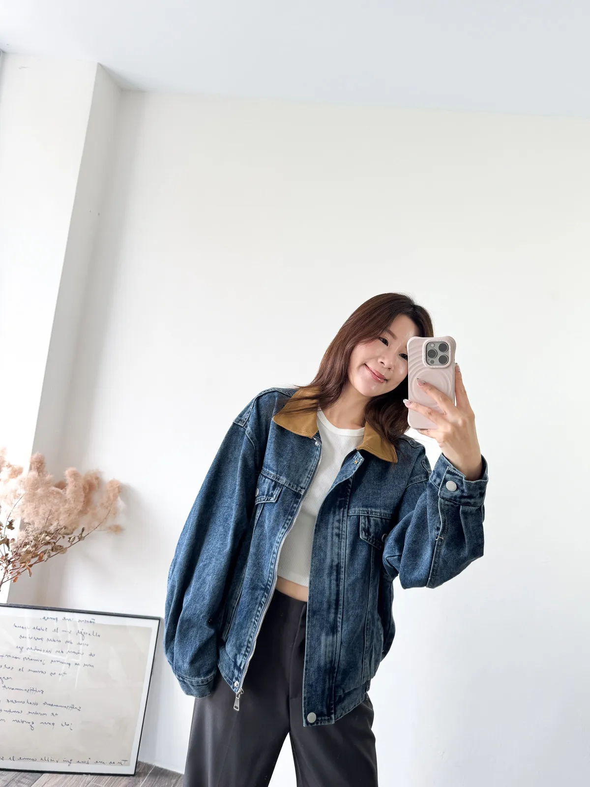 牛仔料 / 無彈性 / 無內裏 整件不會太過oversize 的版型 各種身形都能駕馭~ 因為沒有內裡也不用擔心會太厚重 穿在身上不會有負擔感! 今年依舊流行各種領配色外套 這款領子的配色及牛仔本布刷色搭配起來很好看 按起來還好,穿起來莫名的超好看! 有型又襯膚! 讚讚 *Made in china Model 158/48 (腰26吋 臀35.5吋)