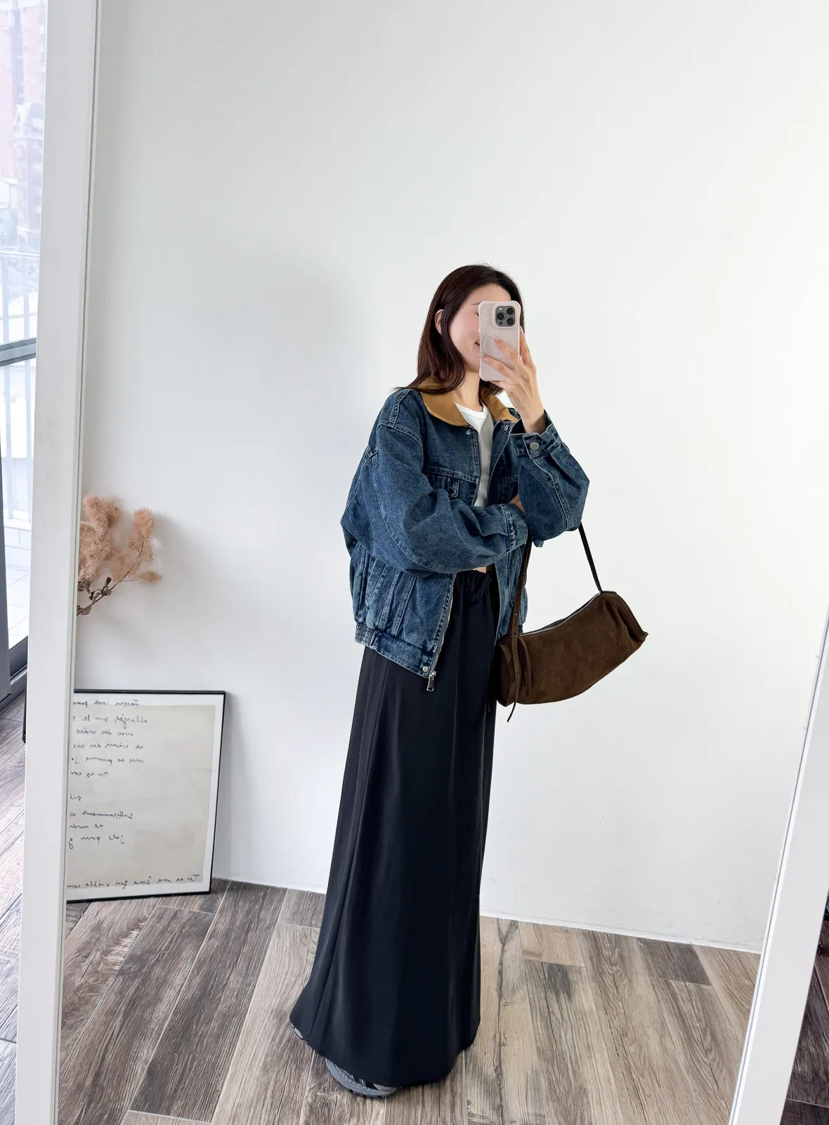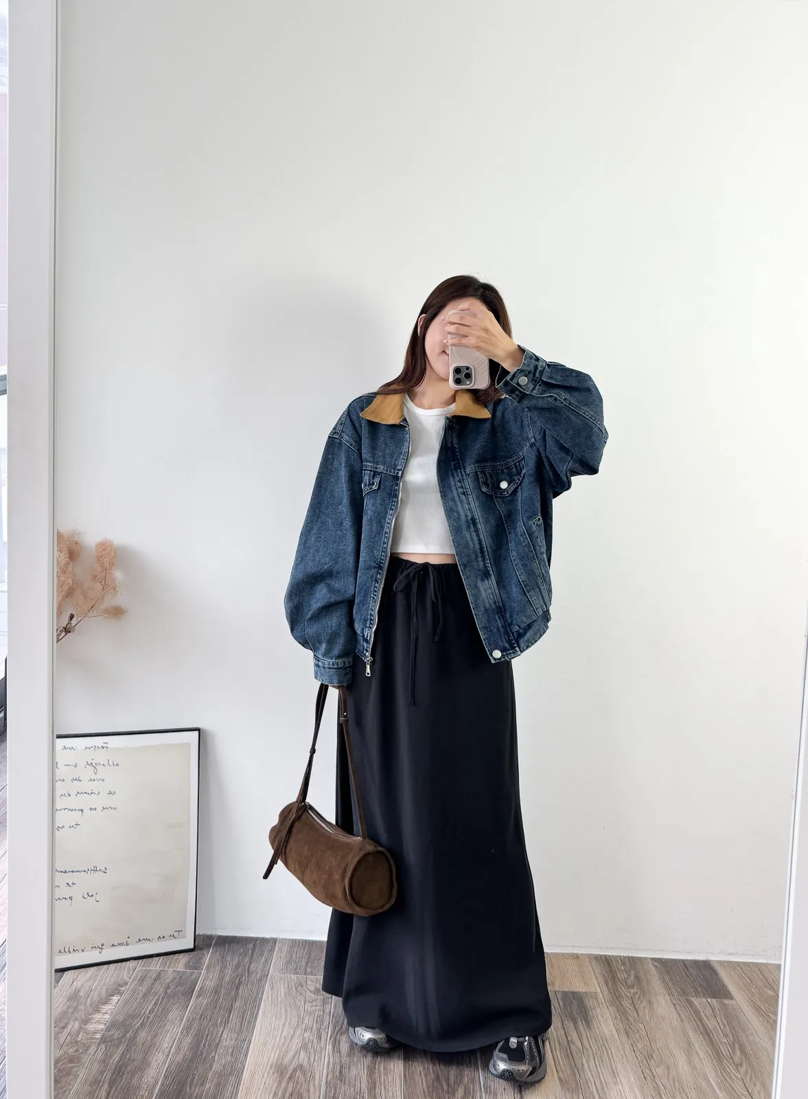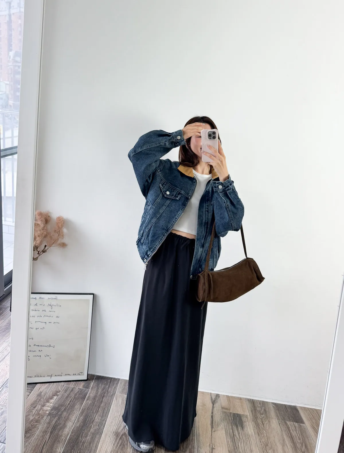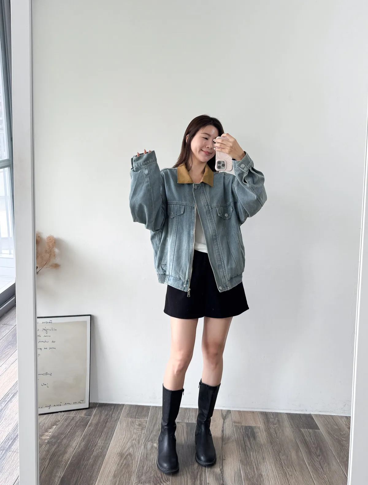牛仔料 / 無彈性 / 無內裏 整件不會太過oversize 的版型 各種身形都能駕馭~ 因為沒有內裡也不用擔心會太厚重 穿在身上不會有負擔感! 今年依舊流行各種領配色外套 這款領子的配色及牛仔本布刷色搭配起來很好看 按起來還好,穿起來莫名的超好看! 有型又襯膚! 讚讚 *Made in china Model 158/48 (腰26吋 臀35.5吋)