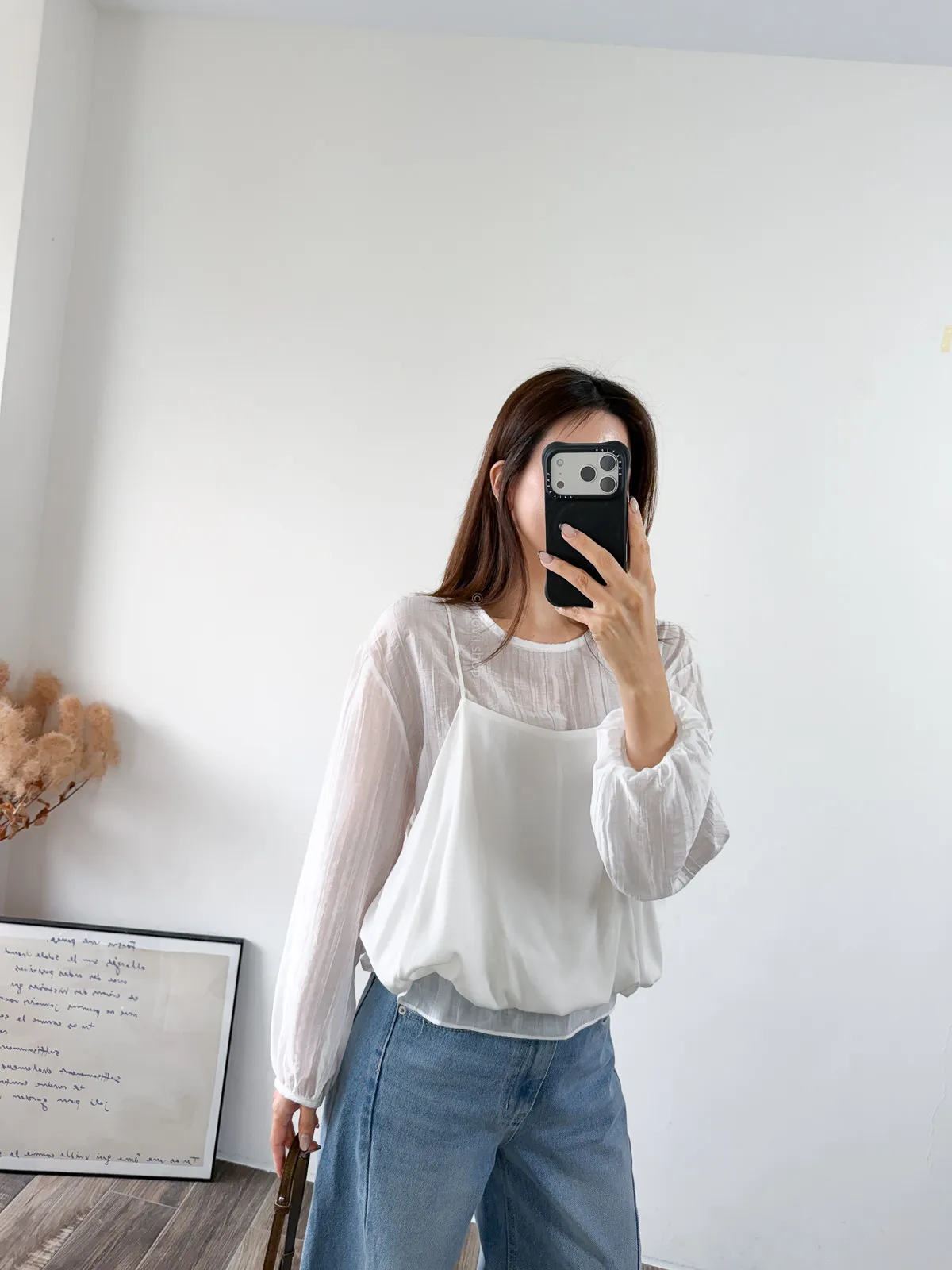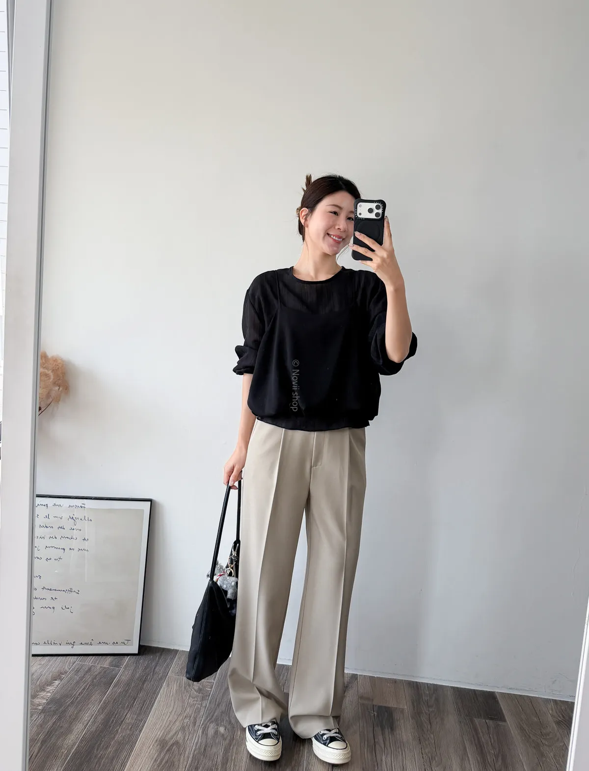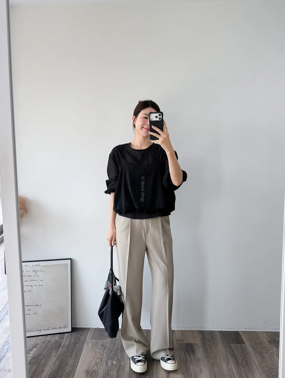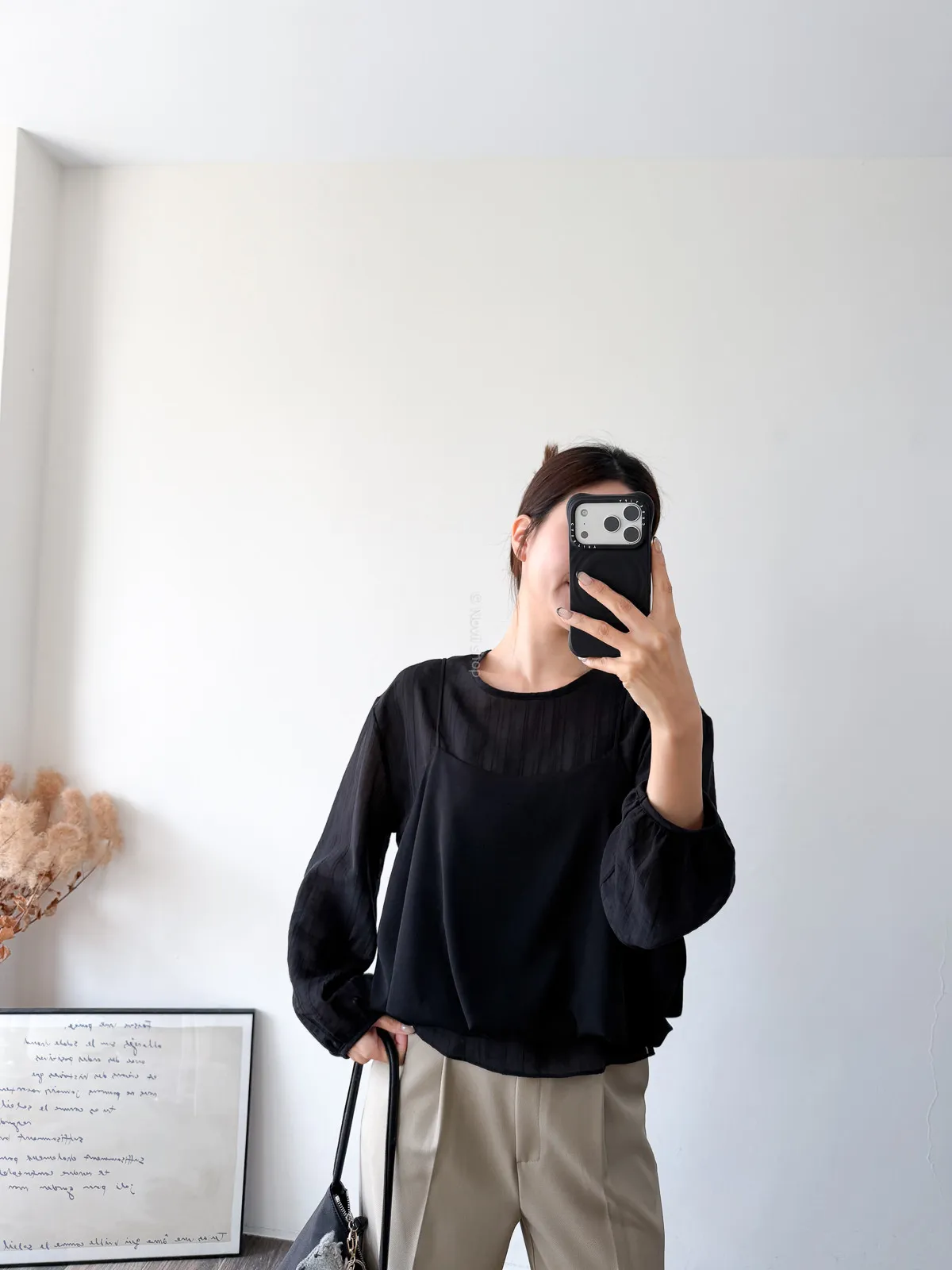聚脂纖維 / 無彈性 這款設計蠻酷的~其實是同一塊布料但是背心內裡多加了一層薄透雪紡紗 所以背心在外面時是異材質拼接感~ 背心和長袖衫的下擺是車在一起肩帶及身體部分是沒有車死的唷! 讓整體假兩件穿起來不會太死板比較像真的兩件式感覺. 下擺有鬆緊帶縮腰 Model 158/48 (腰26 臀35.5吋) detail//
