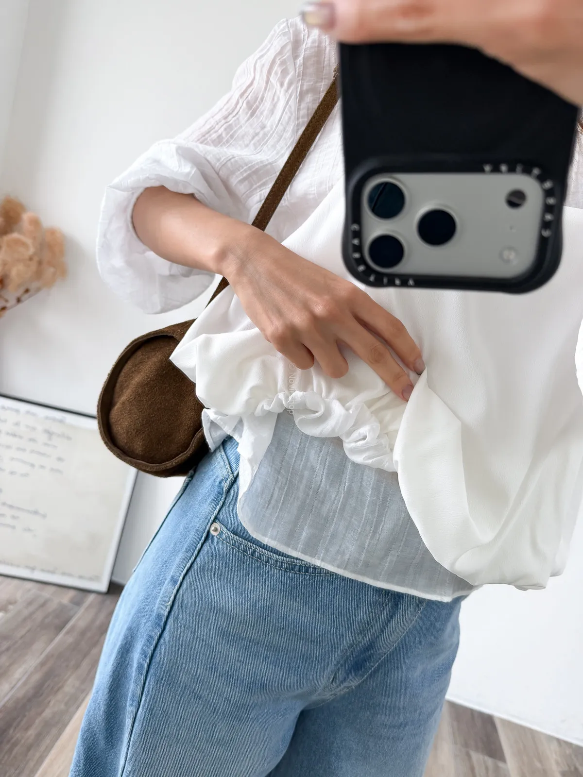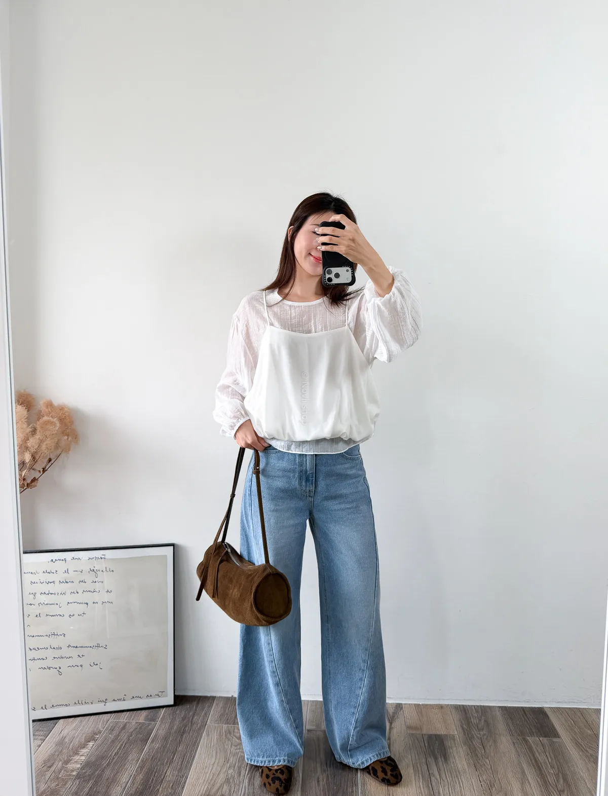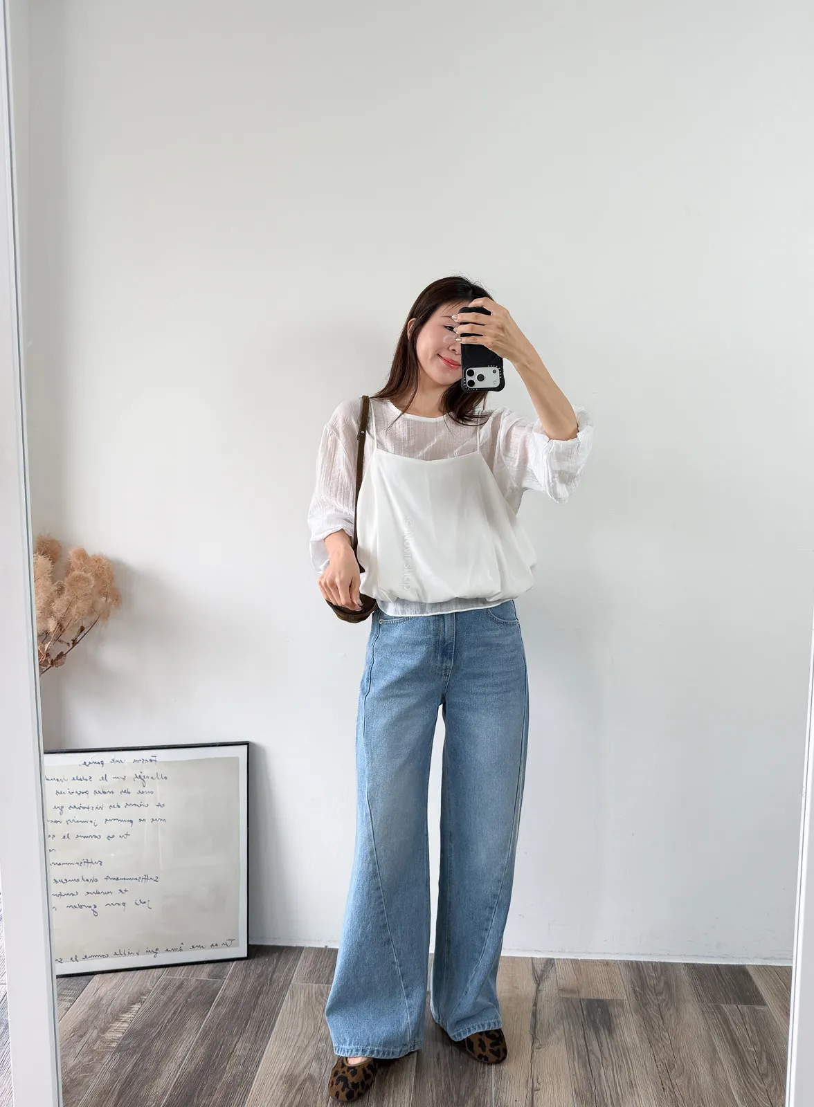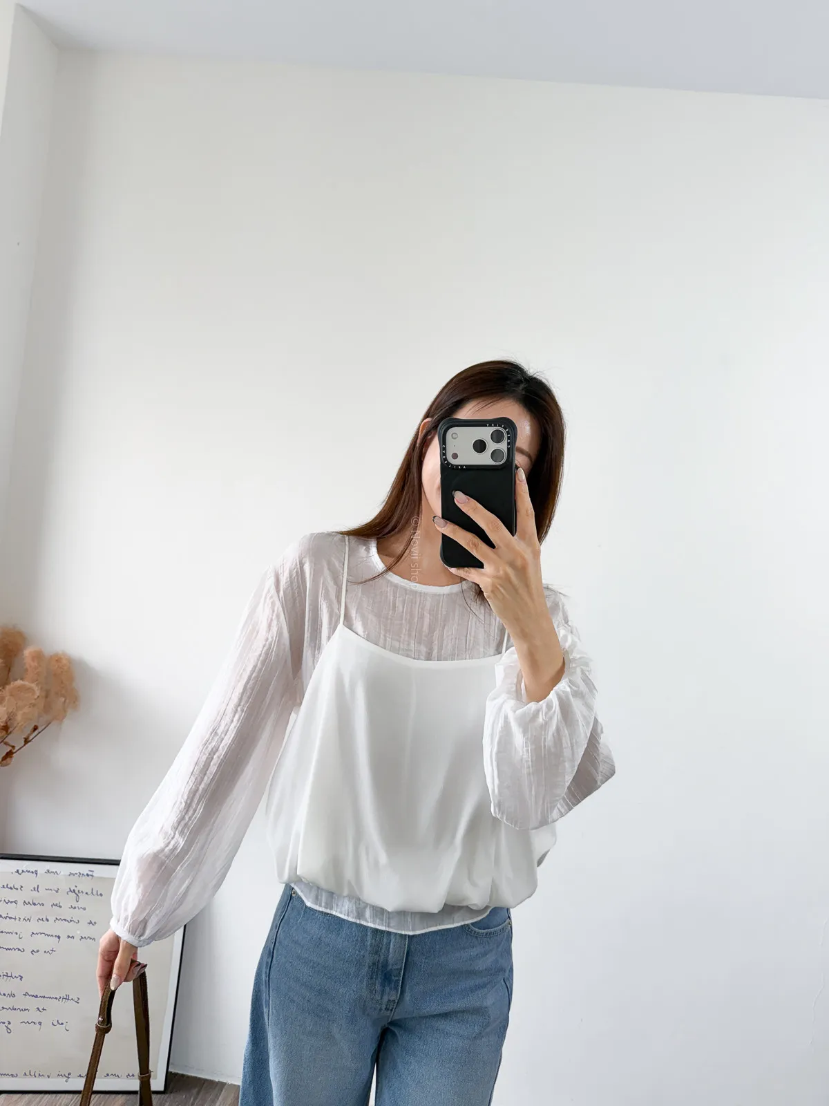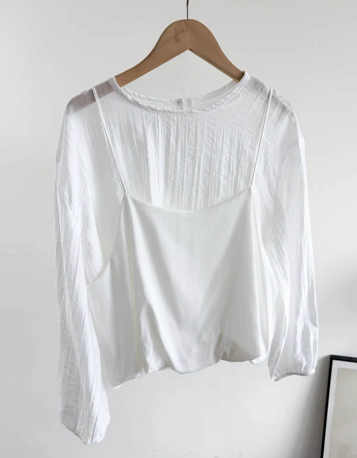 聚脂纖維 / 無彈性 這款設計蠻酷的~其實是同一塊布料但是背心內裡多加了一層薄透雪紡紗 所以背心在外面時是異材質拼接感~ 背心和長袖衫的下擺是車在一起肩帶及身體部分是沒有車死的唷! 讓整體假兩件穿起來不會太死板比較像真的兩件式感覺. 下擺有鬆緊帶縮腰 Model 158/48 (腰26 臀35.5吋) detail//