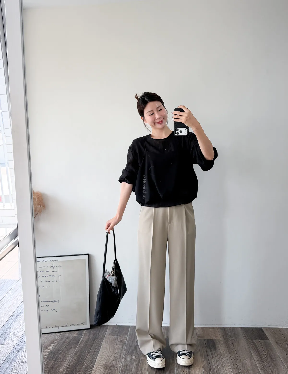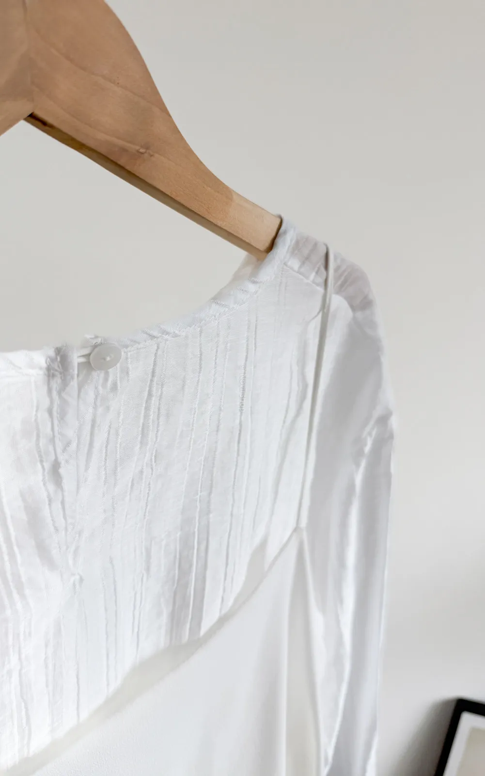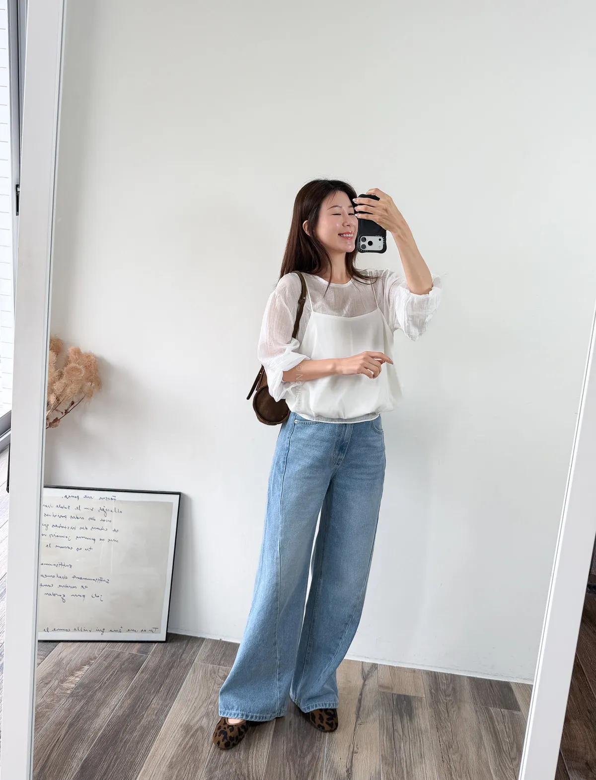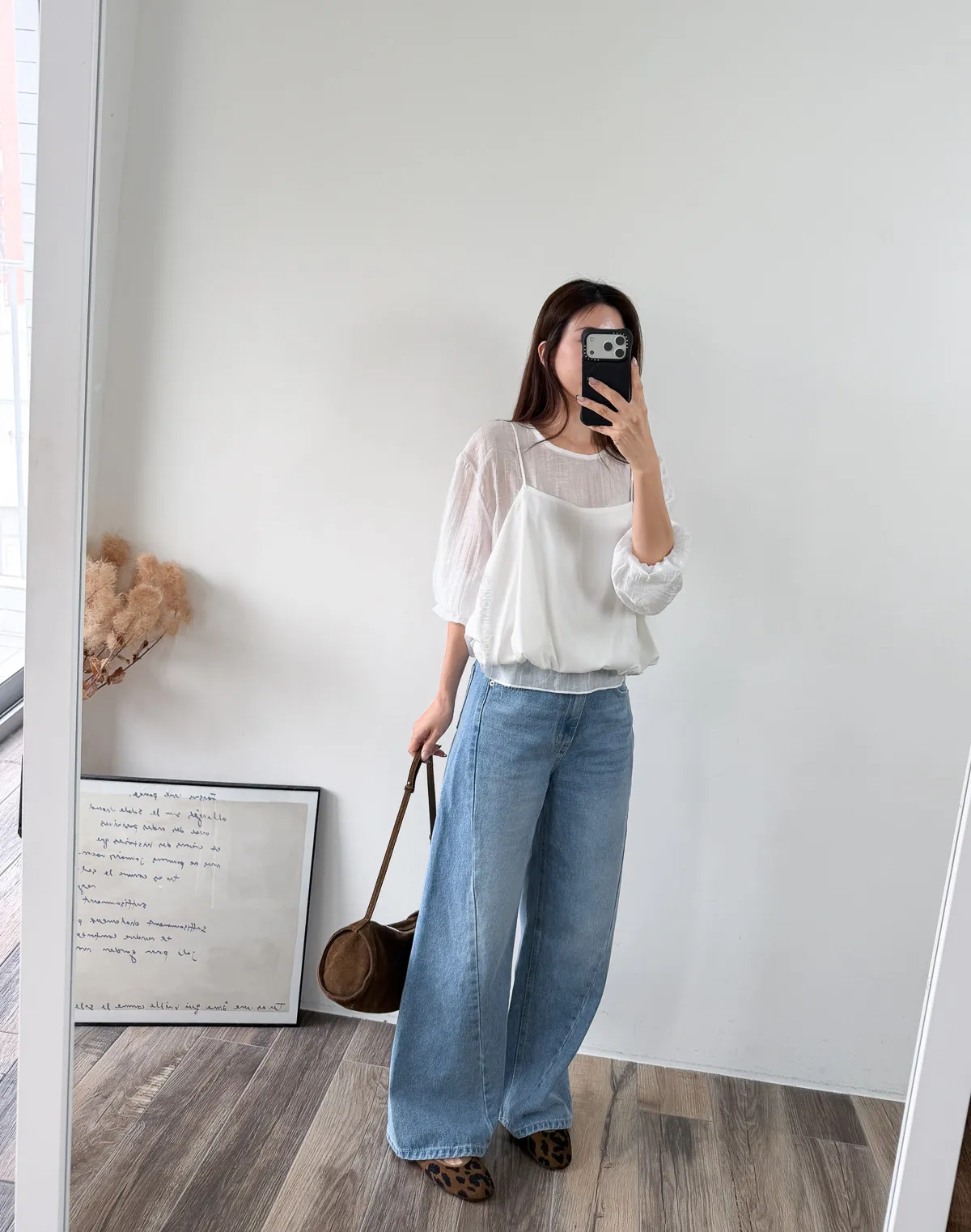 聚脂纖維 / 無彈性 這款設計蠻酷的~其實是同一塊布料但是背心內裡多加了一層薄透雪紡紗 所以背心在外面時是異材質拼接感~ 背心和長袖衫的下擺是車在一起肩帶及身體部分是沒有車死的唷! 讓整體假兩件穿起來不會太死板比較像真的兩件式感覺. 下擺有鬆緊帶縮腰 Model 158/48 (腰26 臀35.5吋) detail//