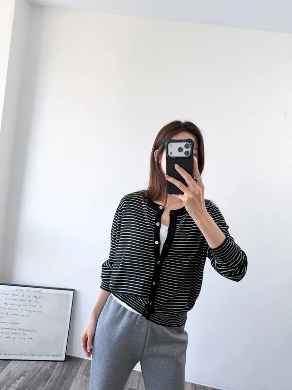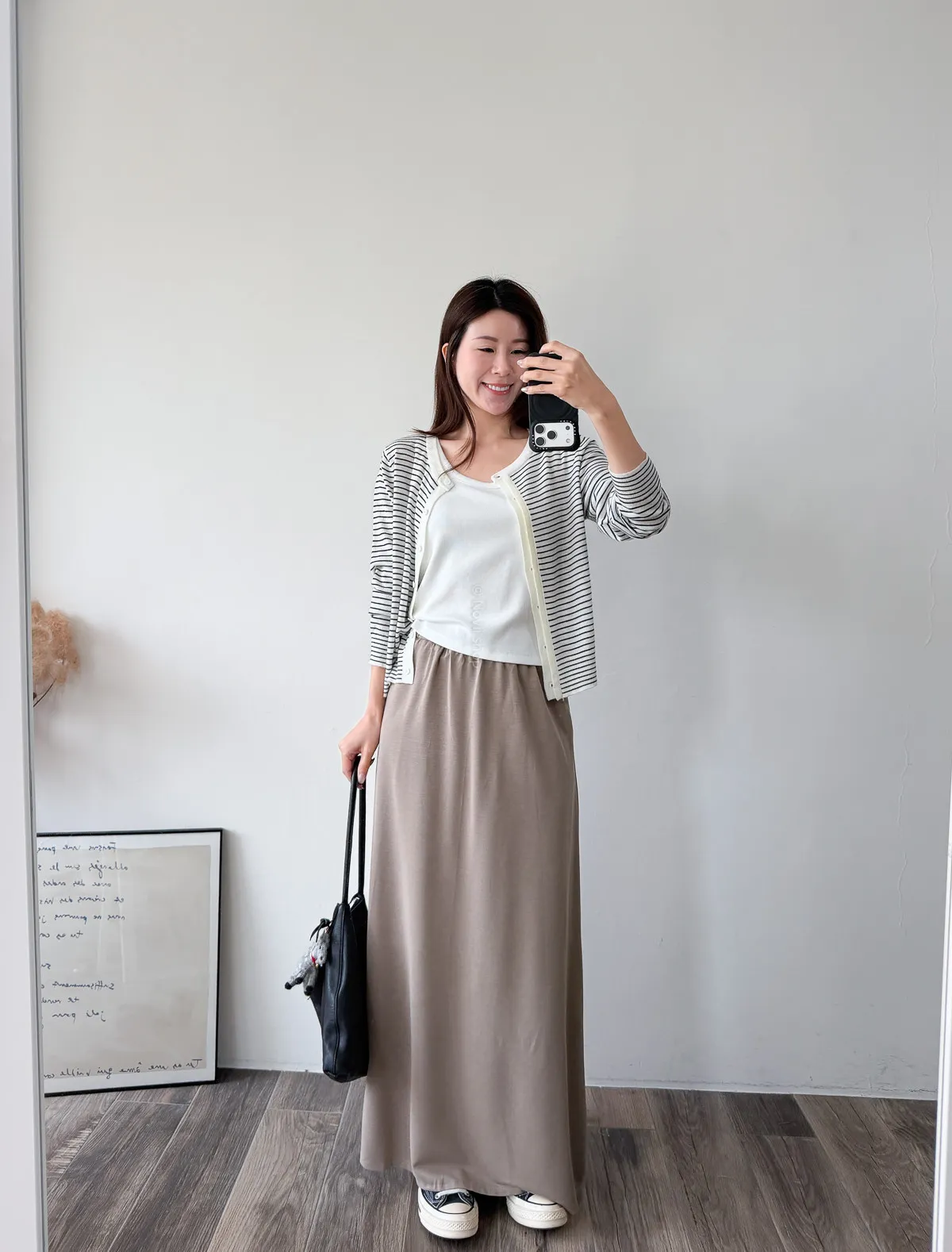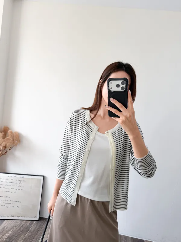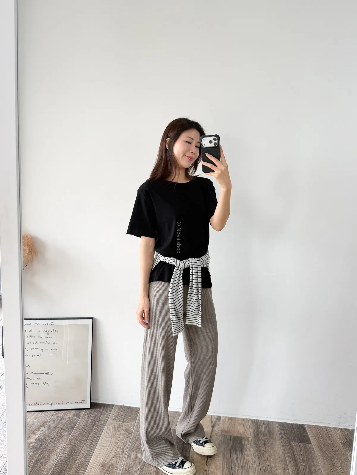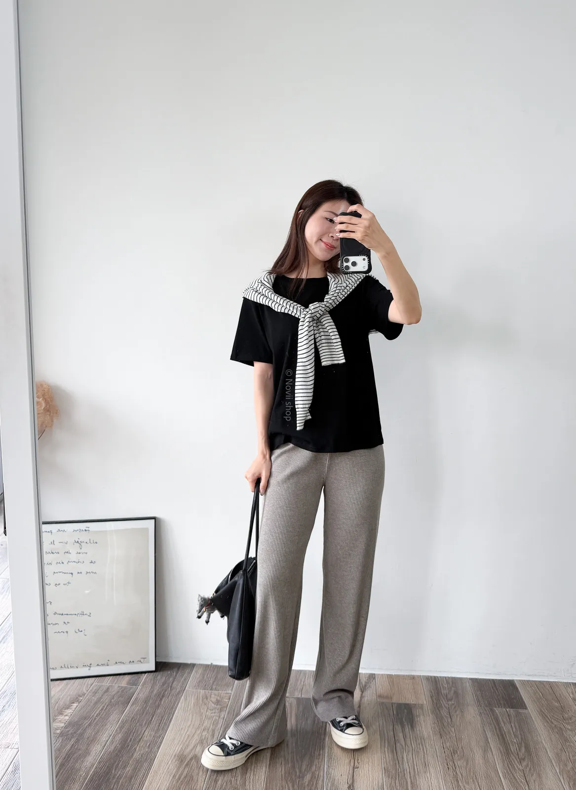 細針織/ 有彈性 材質是柔滑細針織整件彈性很好~ 版型微微合版外面要疊搭外套也可以. 不穿的時候拿當披肩和綁腰也很適合 薄薄的綁起來比較好看! Model 158/48 (腰26 臀35.5吋) detail//